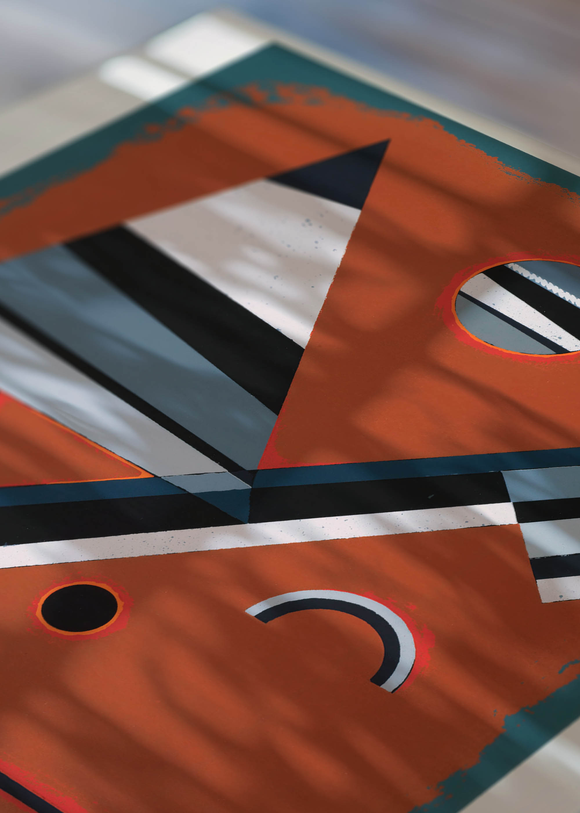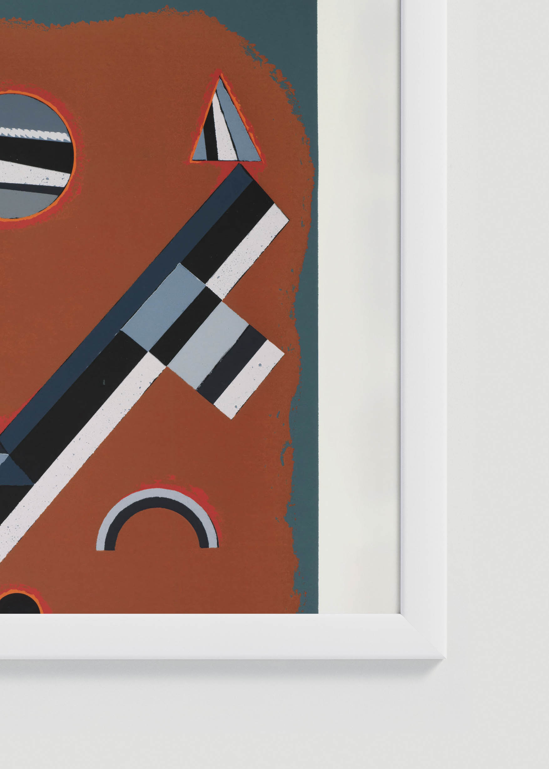 Dominująca ceglasta czerwień tła, przypominająca wypaloną terakotę czy sienny brąz, stanowi doskonałe podłoże dla dynamicznych elementów geometrycznych. Szarości zbliżone do grafitu i antracytu przeplatają się z czernią węglową oraz delikatnymi akcentami bieli, tworząc harmonijną całość. Subtelne akcenty błękitu dodają kompozycji głębi, podczas gdy czerwone obwódki podkreślają wybrane elementy, nadając im szczególnego znaczenia.