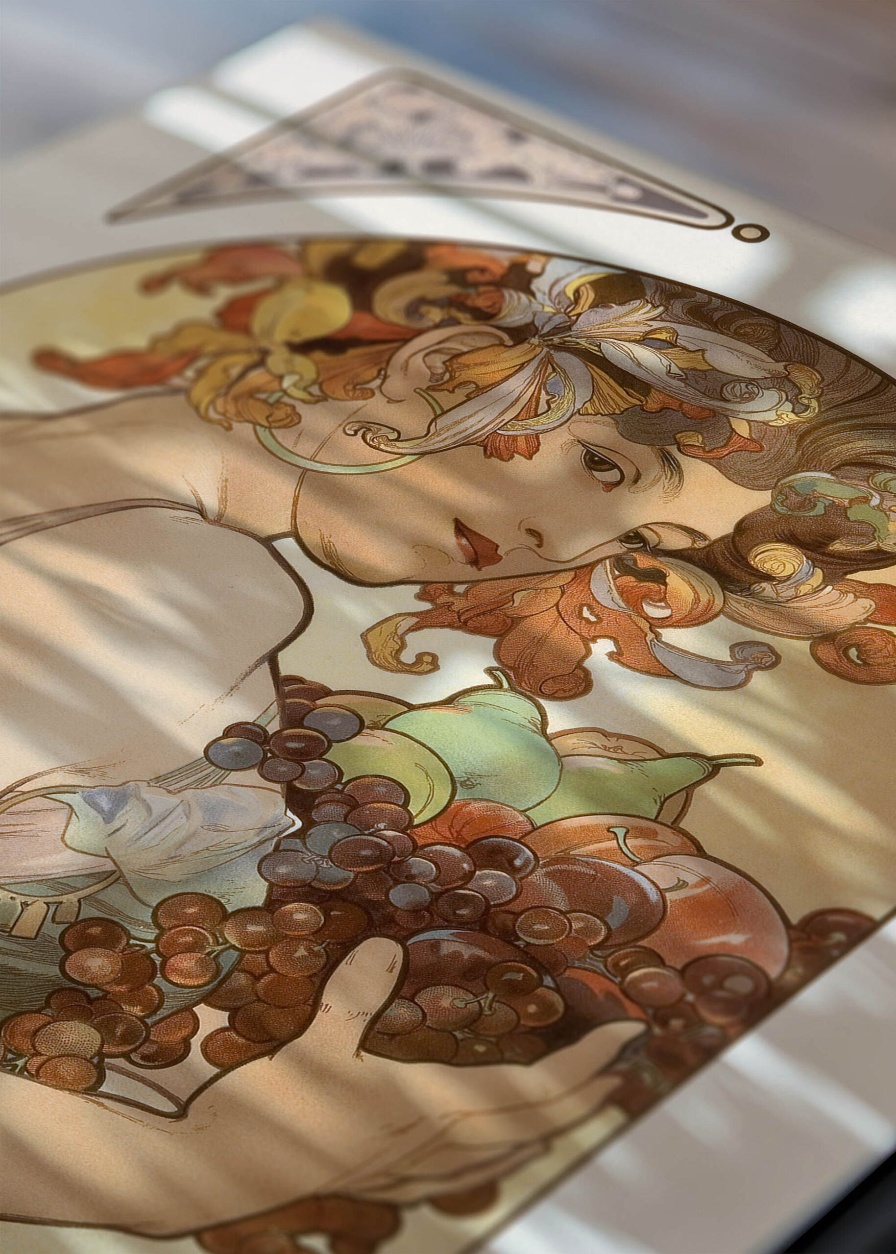 Kompozycja zachwyca delikatnością i harmonią barw – dominują tu ciepłe tony ochry, miodowego brązu i karmelowej sepii, które kontrastują z chłodnymi akcentami szałwiowej zieleni i bladego błękitu. Kobieca postać, ujęta w charakterystycznej dla Muchy pozie, emanuje spokojem i naturalnością. Jej włosy, splecione z jesiennymi liśćmi i kwiatami, tworzą bujną koronę w odcieniach kasztanu i miedzi. W dłoniach trzyma obfite kiście winogron o głębokich, bakaliowych barwach.