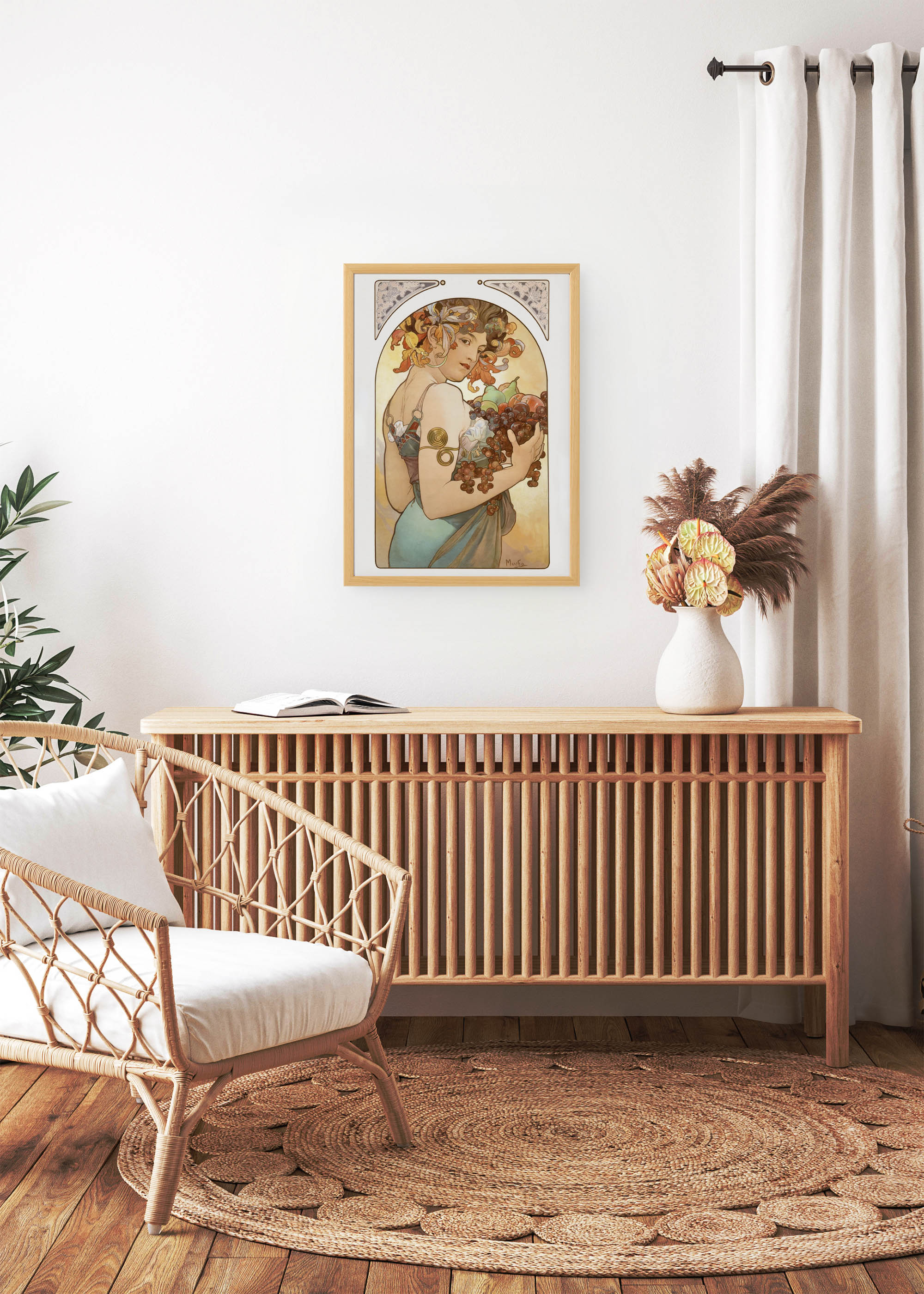 Plakat będący reprintem wzoru autorstwa Muchy idealnie komponuje się we wnętrzach utrzymanych w stylu rustykalnym, prowansalskim czy eklektycznym. Doskonale współgra z naturalnymi materiałami – drewnem, lnem czy jutą. Jego organiczne formy i stonowana paleta sprawiają, że świetnie prezentuje się w towarzystwie roślin doniczkowych i dodatków w odcieniach terakoty czy starego złota.