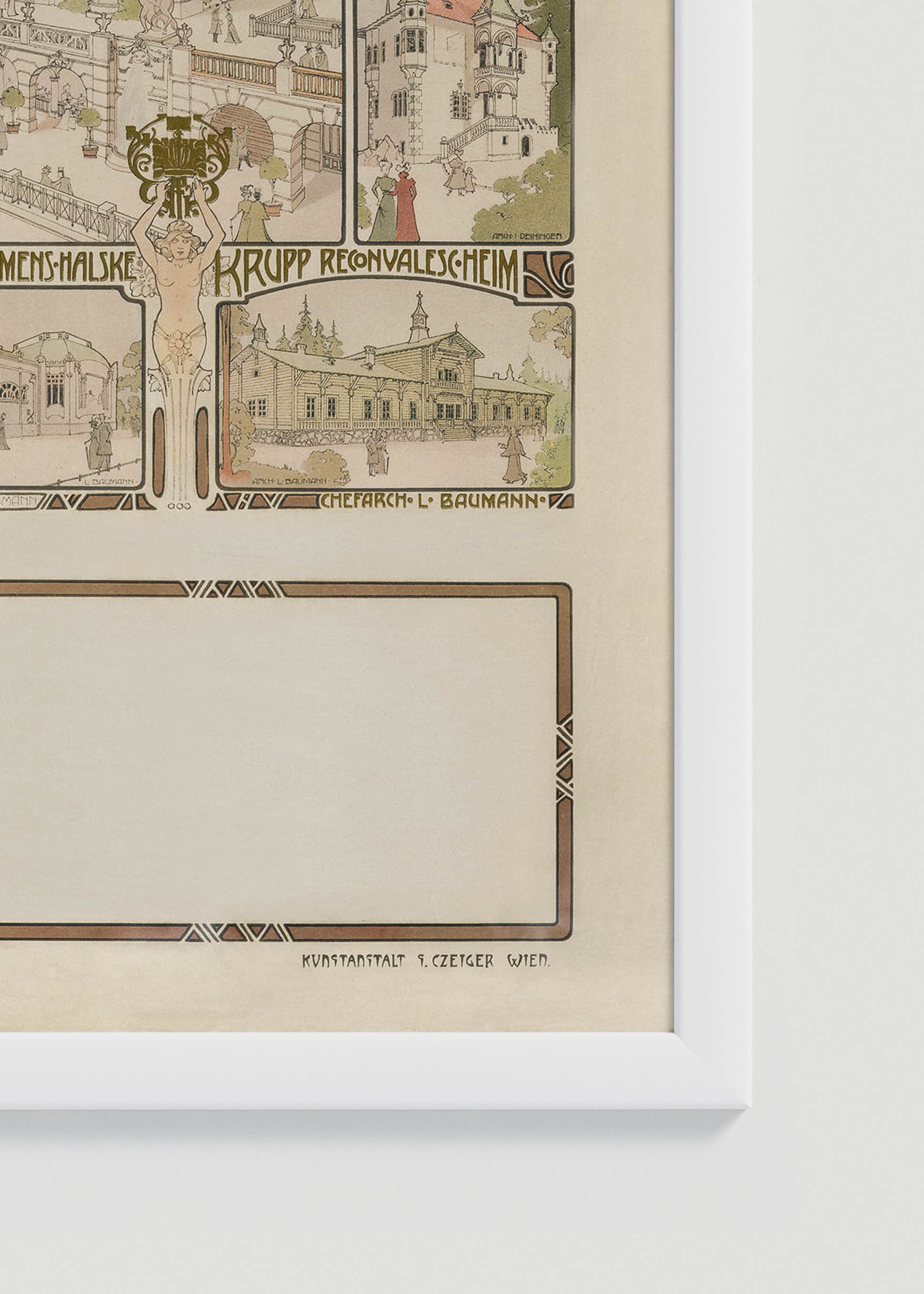 Na plakacie widzimy alegoryczną postać kobiety w otoczeniu bujnych, secesyjnych ornamentów. Delikatne, pastelowe tony – kremowa biel, pudrowy róż i szałwiowa zieleń – przeplatają się z ciepłymi akcentami złota i ochry. Całość utrzymana jest w charakterystycznej dla Muchy palecie barw ziemi z subtelnym kontrastem koralowej czerwieni szat. Po prawej stronie kompozycji znajdują się miniaturowe ilustracje austriackich pawilonów wystawowych, co nadaje dziełu dokumentalny charakter.