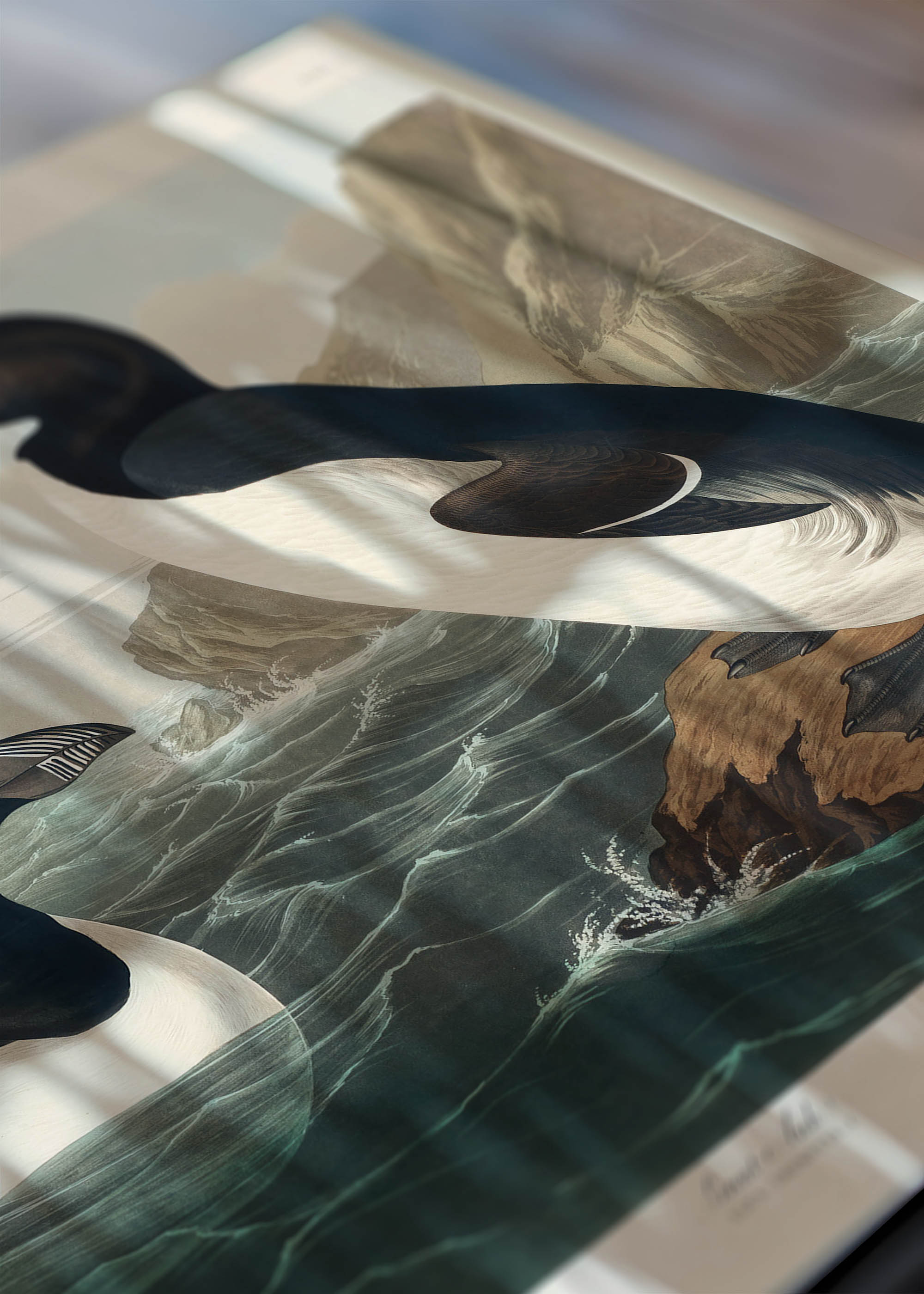 Ten wspaniały plakat przedstawia jedną z najbardziej rozpoznawalnych ilustracji z monumentalnego dzieła „Birds of America” Johna Jamesa Audubona. Alka olbrzymia, uwieczniona przez artystę około 1827-1838 roku, była nielotnym ptakiem morskim zamieszkującym północny Atlantyk. Tragiczny los tego gatunku – ostatnia para została zabita w 1844 roku na islandzkiej wyspie Eldey – sprawia, że ilustracja Audubona nabiera szczególnego, melancholijnego znaczenia jako jedno z niewielu wiarygodnych przedstawień tego wymarłego ptaka.
