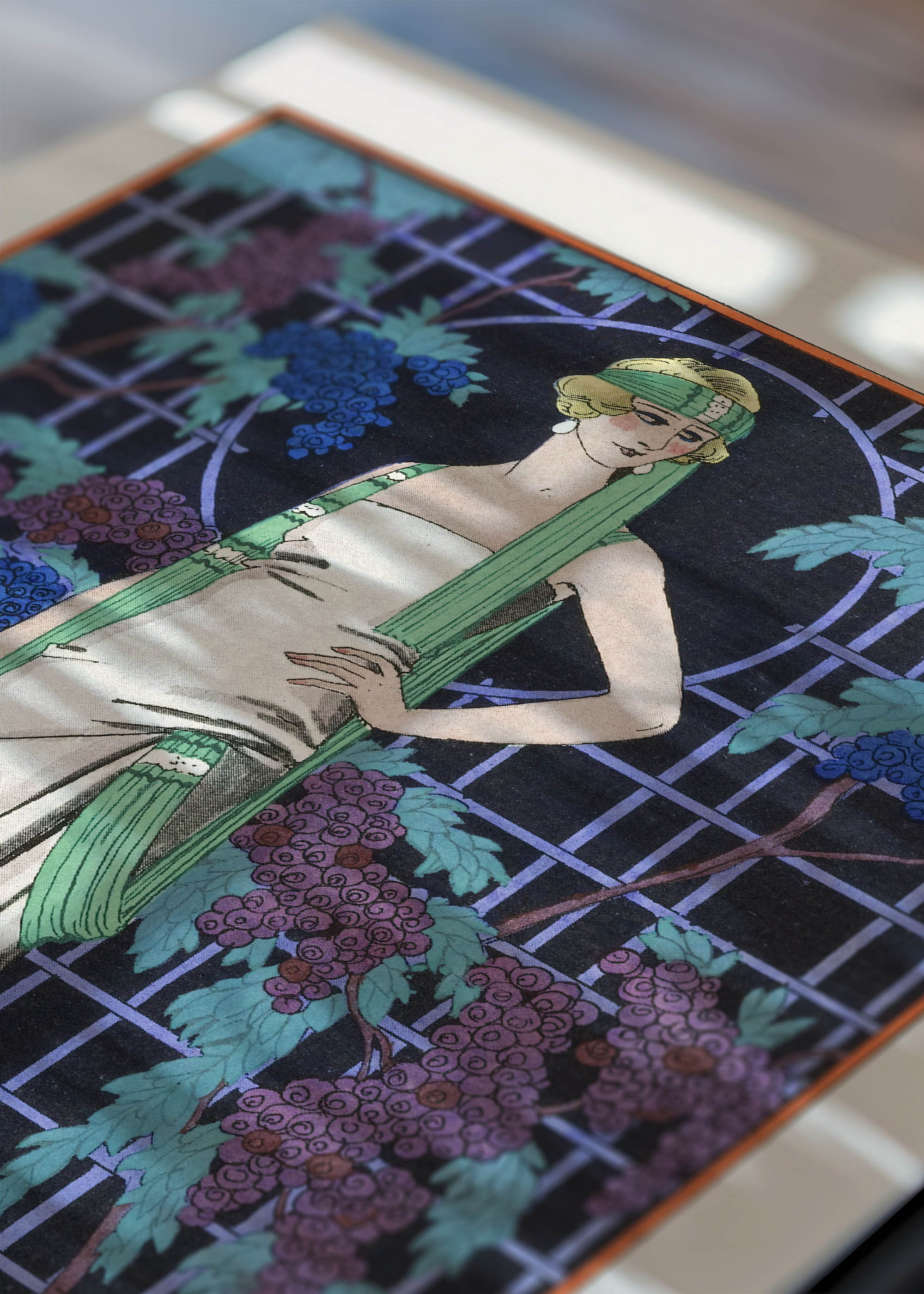 Tło kompozycji wypełniają kiście winogron w barwach zbliżonych do ultramaryny i ametystowego fioletu, które przeplatają się z turkusowozielonymi liśćmi na tle głębokiej, atramentowej czerni. Geometryczna kratownica w odcieniu błękitnego kobaltu nadaje całości charakterystycznego dla Art Déco rytmu i struktury.