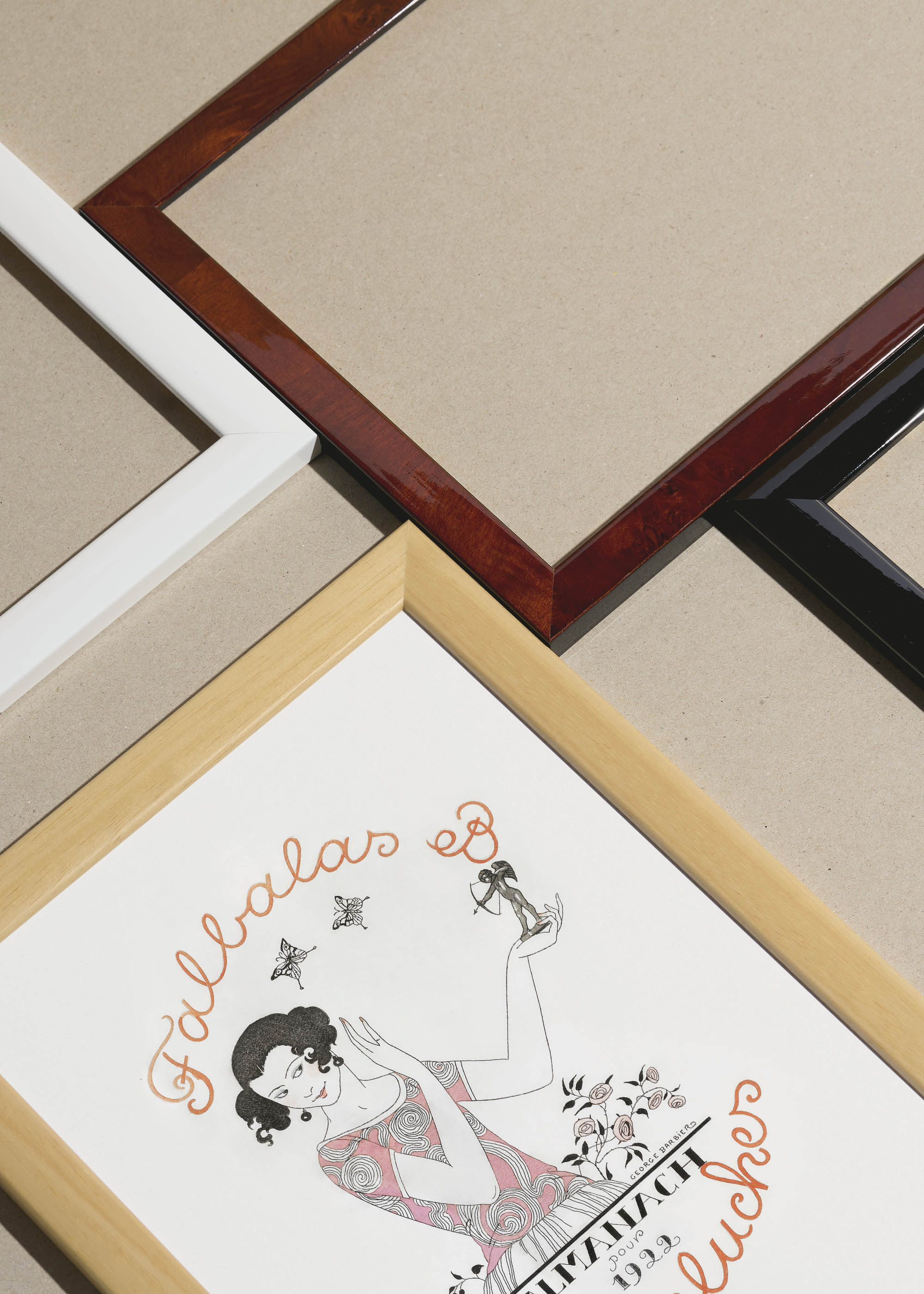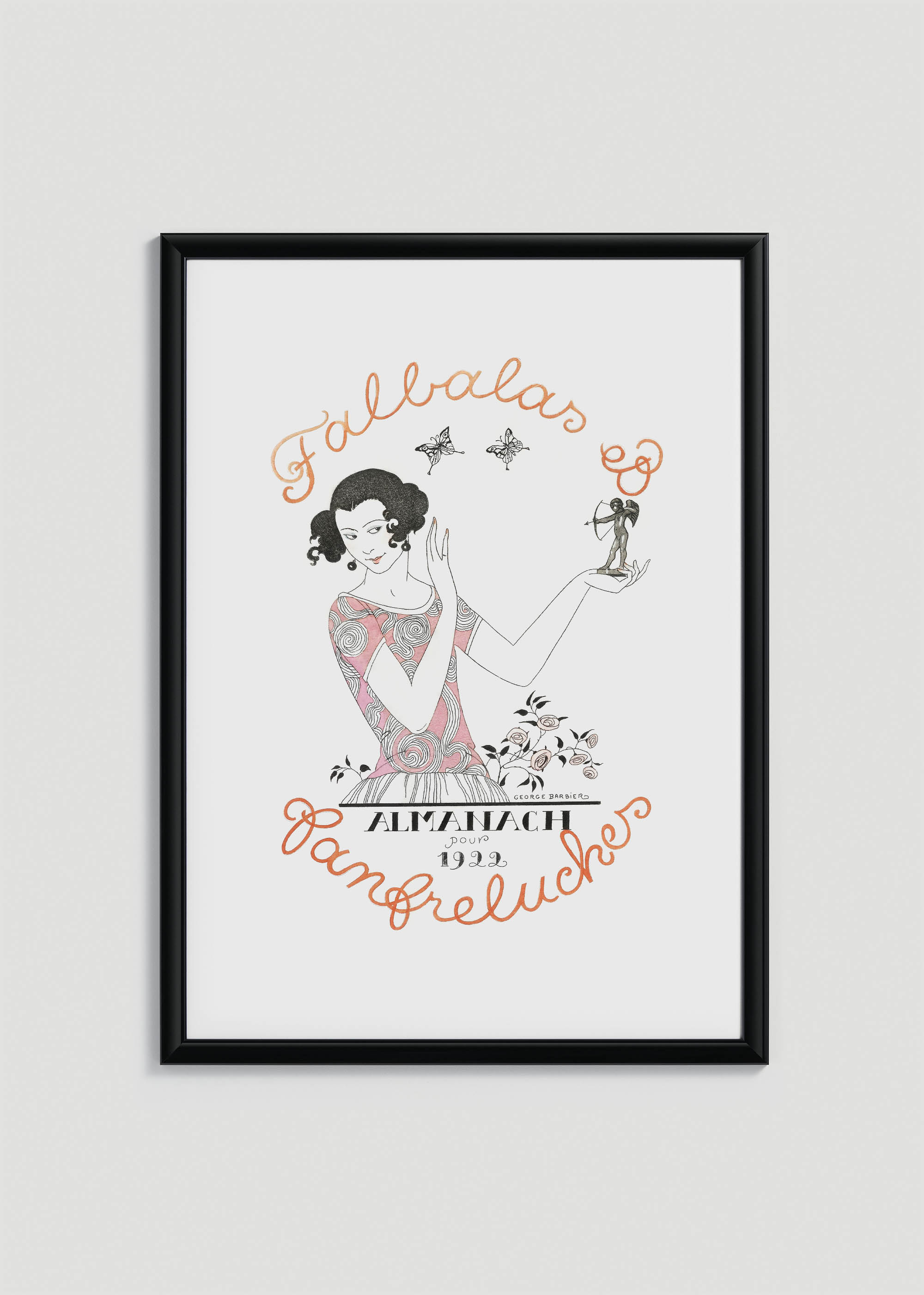 Almanach „Falbalas et fanfreluches” („Falbany i ozdóbki”) na rok 1922 – tak brzmi tytuł tego wyjątkowego plakatu, będącego reprodukcją okładki francuskiego almanachu modowego autorstwa genialnego George’a Barbiera. To prawdziwa perła art déco, stworzona w 1922 roku, kiedy to Barbier był u szczytu swojej kariery jako ilustrator mody i kostiumograf. Artysta, zwany „nowym Watteau”, zasłynął z eleganckich ilustracji dla najważniejszych paryskich domów mody, a jego prace regularnie zdobiły łamy prestiżowych magazynów takich jak „Gazette du Bon Ton” czy „Journal des Dames et des Modes”.