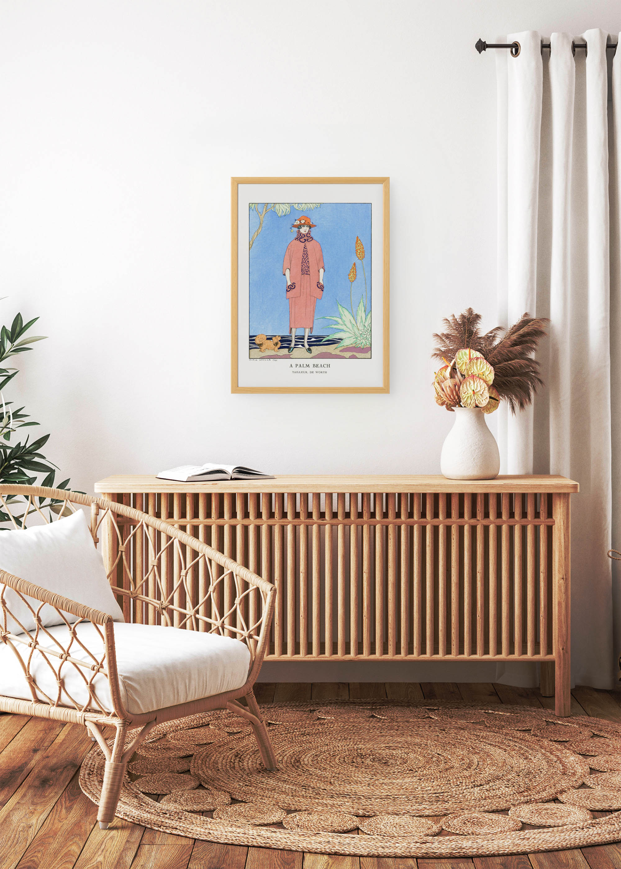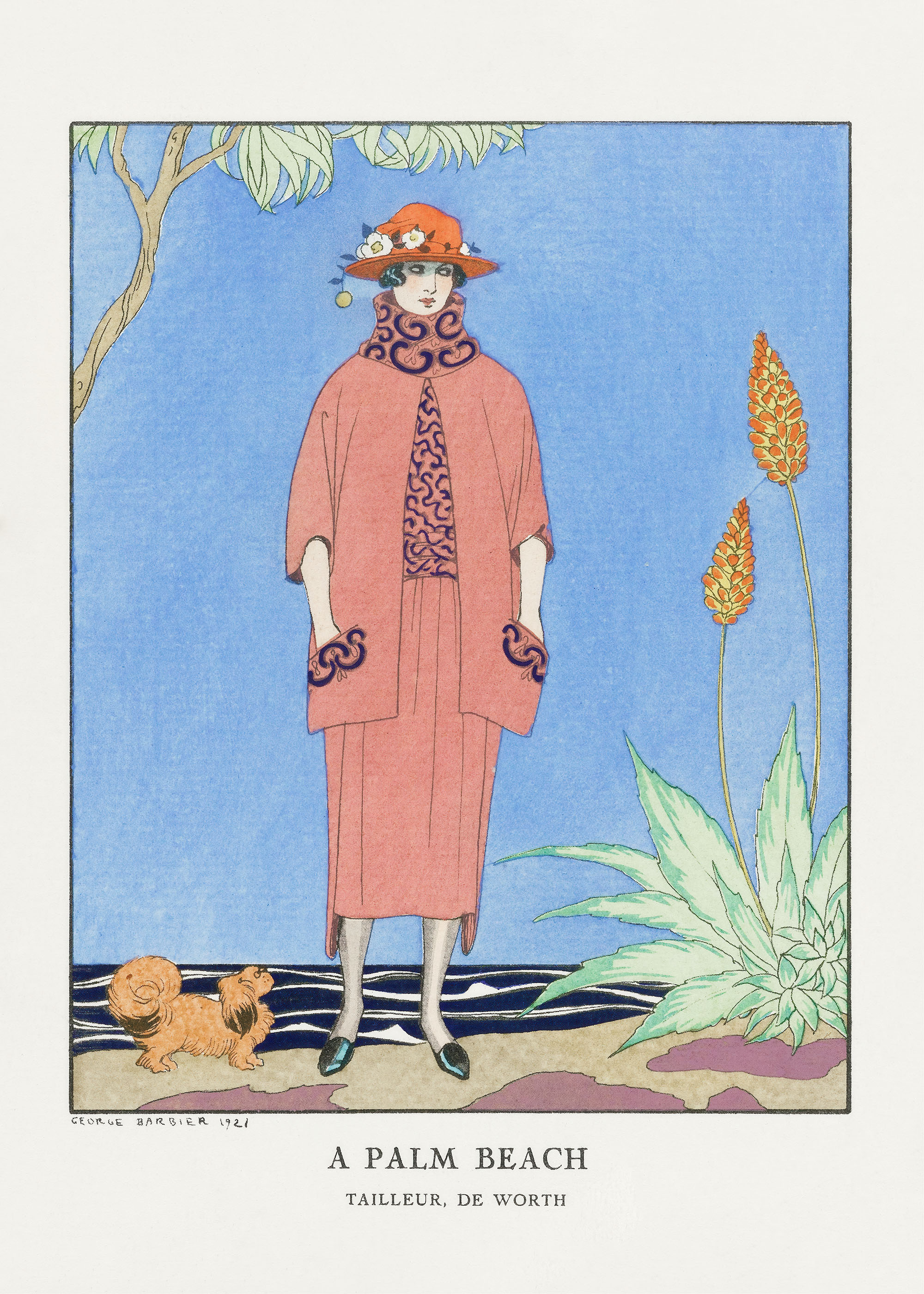 Przed nami wyjątkowe dzieło George’a Barbiera z 1921 roku – „A Palm Beach”, stworzone dla prestiżowego domu mody Tailleur de Worth. Ten francuski ilustrator i projektant, uważany za jednego z najwybitniejszych artystów epoki Art Deco, zasłynął swoimi pracami dla najznamienitszych paryskich domów mody. Barbier, zafascynowany orientalizmem i baletami rosyjskimi, potrafił jak nikt inny uchwycić ducha lat dwudziestych XX wieku.