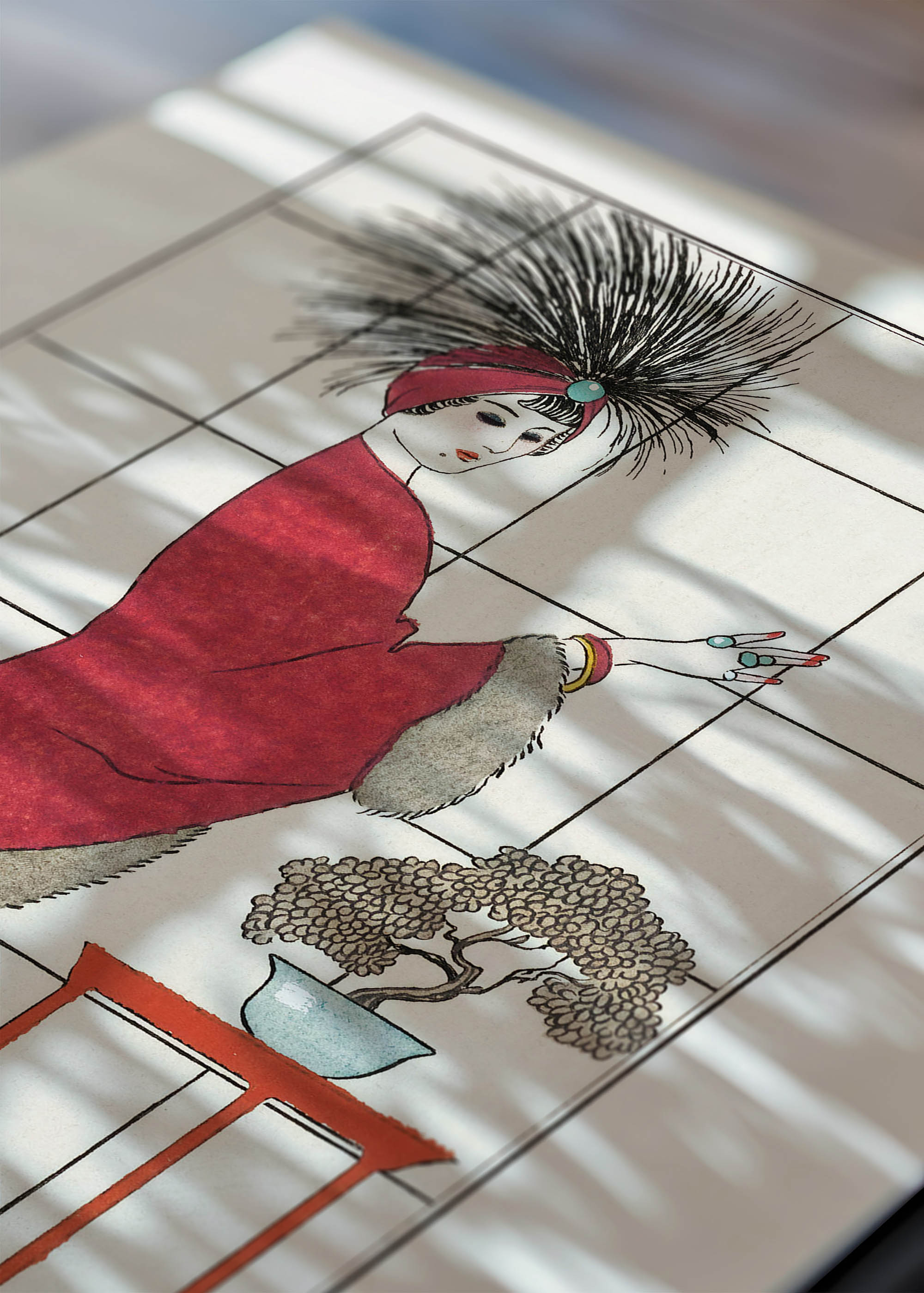 Kolorystyka tego dzieła to prawdziwa uczta dla oczu – dominuje tu szkarłatna czerwień płaszcza obszytego srebrzystoszarym futrem, kontrastująca z kobaltowym błękitem spódnicy ozdobionej delikatnymi, różowymi kwiatami. Całość dopełnia egzotyczny pióropusz w odcieniach grafitu, zwieńczony turkusowym akcentem. Na czerwonym stoliku o smukłych nogach spoczywa błękitna misa z bonsai, którego korona przywodzi na myśl złocisty brąz.