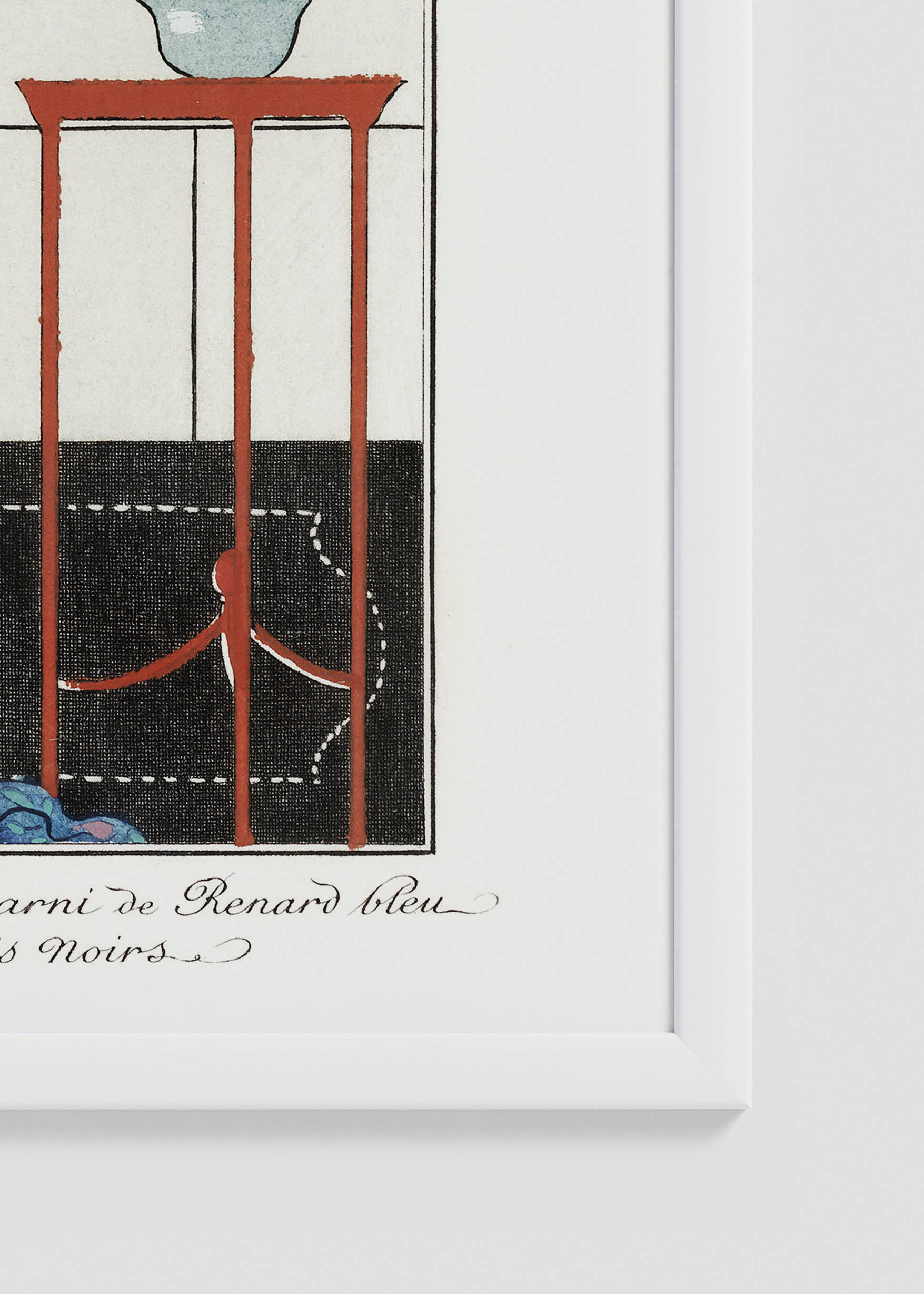 Oto wspaniały przykład kunsztu George’a Barbiera – francuskiego ilustratora i mistrza stylu Art Deco, który swoje najwspanialsze dzieła tworzył w latach 1912-1932. Ten plakat, datowany na rok 1912, przedstawia elegancką damę w orientalnym stroju, będącą częścią serii „Manteau de Damas rose garni de Renard bleu” (Damski płaszcz różowy ozdobiony niebieskim lisem). Barbier, zwany „ostatnim z wielkich ilustratorów mody”, zasłynął z tworzenia wyrafinowanych ilustracji dla najznamienitszych paryskich domów mody, a jego prace regularnie pojawiały się w prestiżowych magazynach takich jak „Gazette du Bon Ton”.
