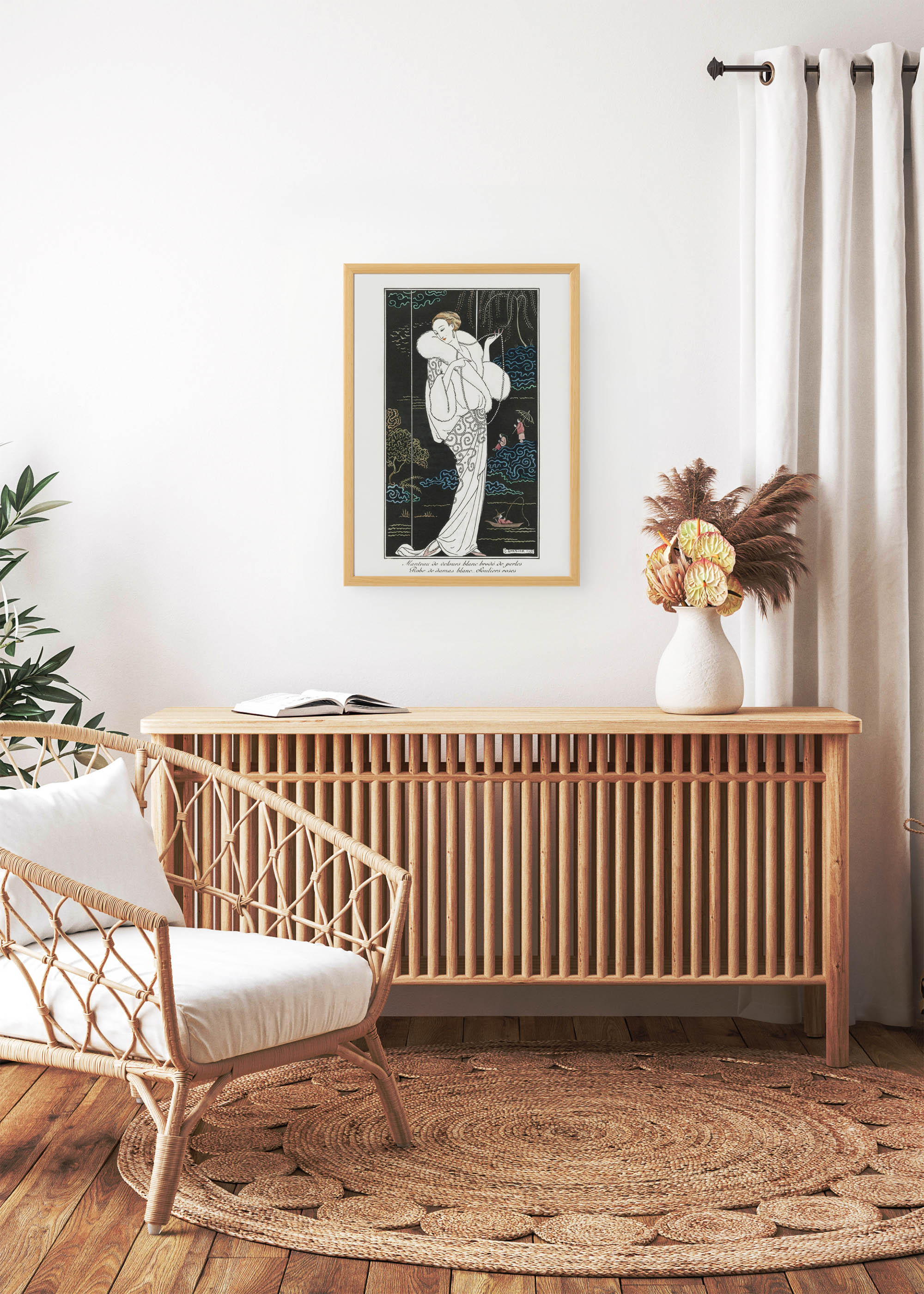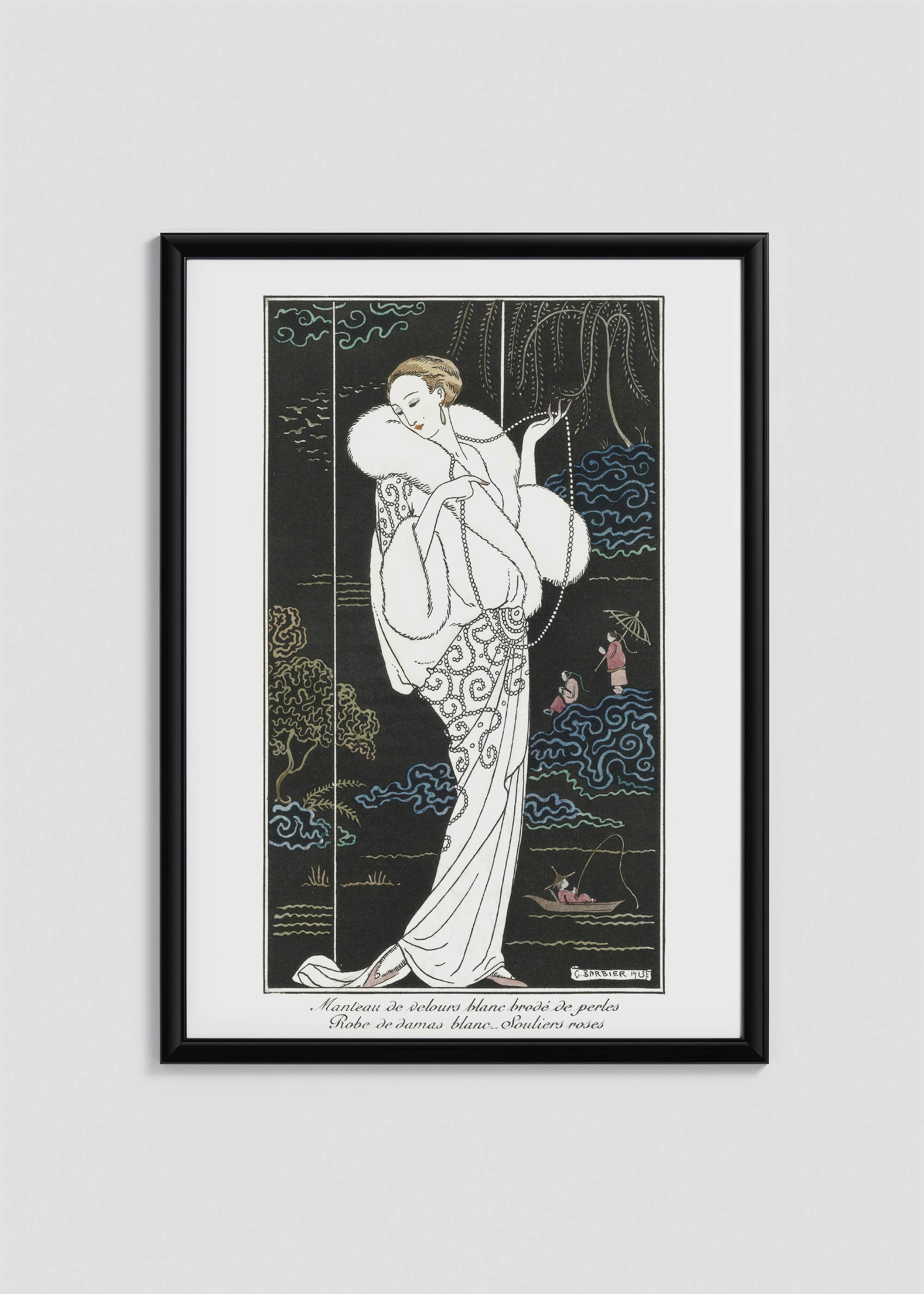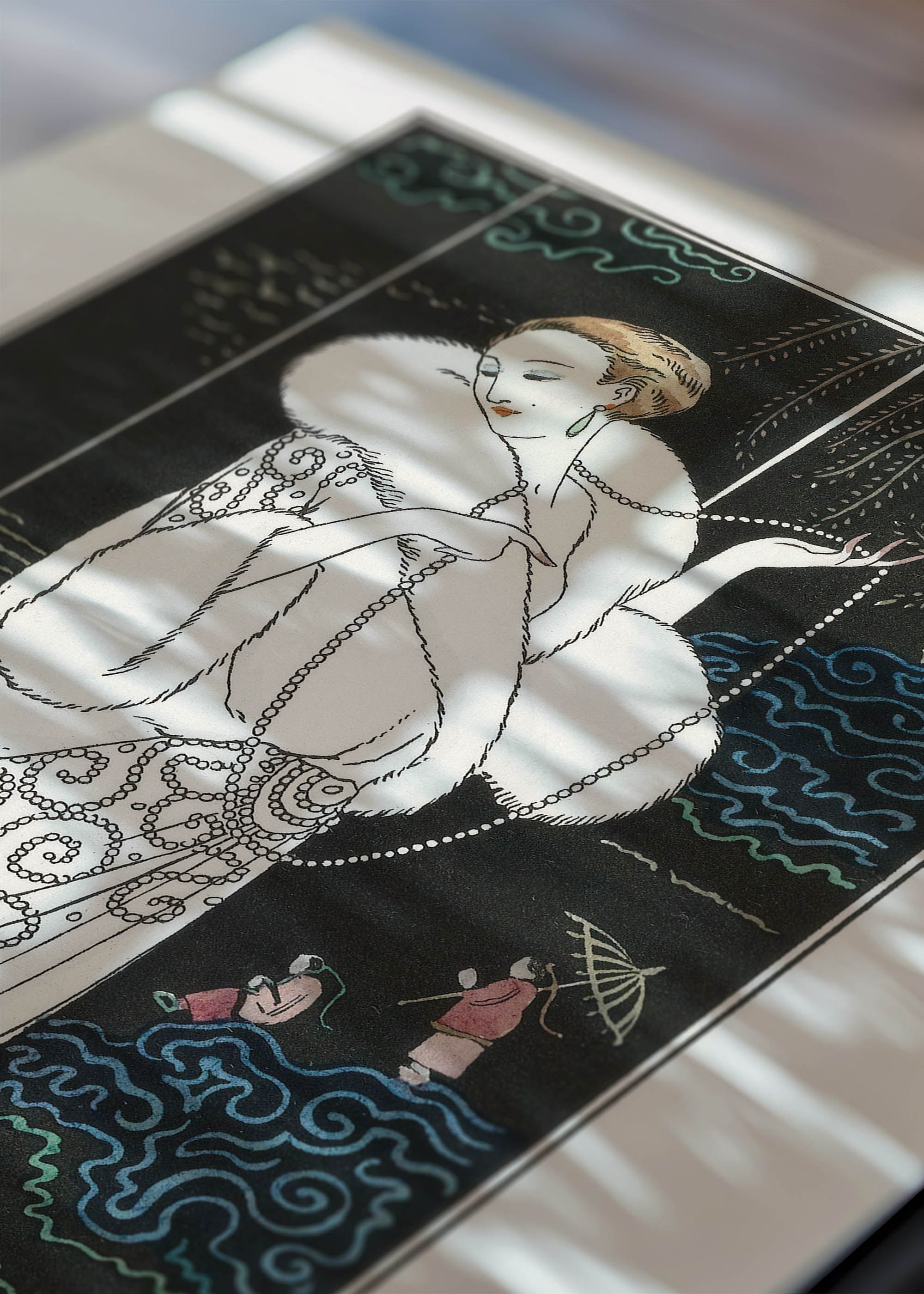 Ten niezwykły plakat to arcydzieło francuskiego ilustratora i projektanta mody George’a Barbiera z 1913 roku, przedstawiające elegancką damę w białym futrze na tle orientalnej scenerii. Kobieta bawi się kokieteryjnie długim sznurem białych pereł. Barbier, jeden z czołowych artystów epoki Art Deco, zasłynął jako ilustrator luksusowych magazynów modowych i twórca kostiumów teatralnych. Jego prace, inspirowane sztuką japońską i baletem rosyjskim, oddawały ducha Belle Époque z niespotykaną finezją.