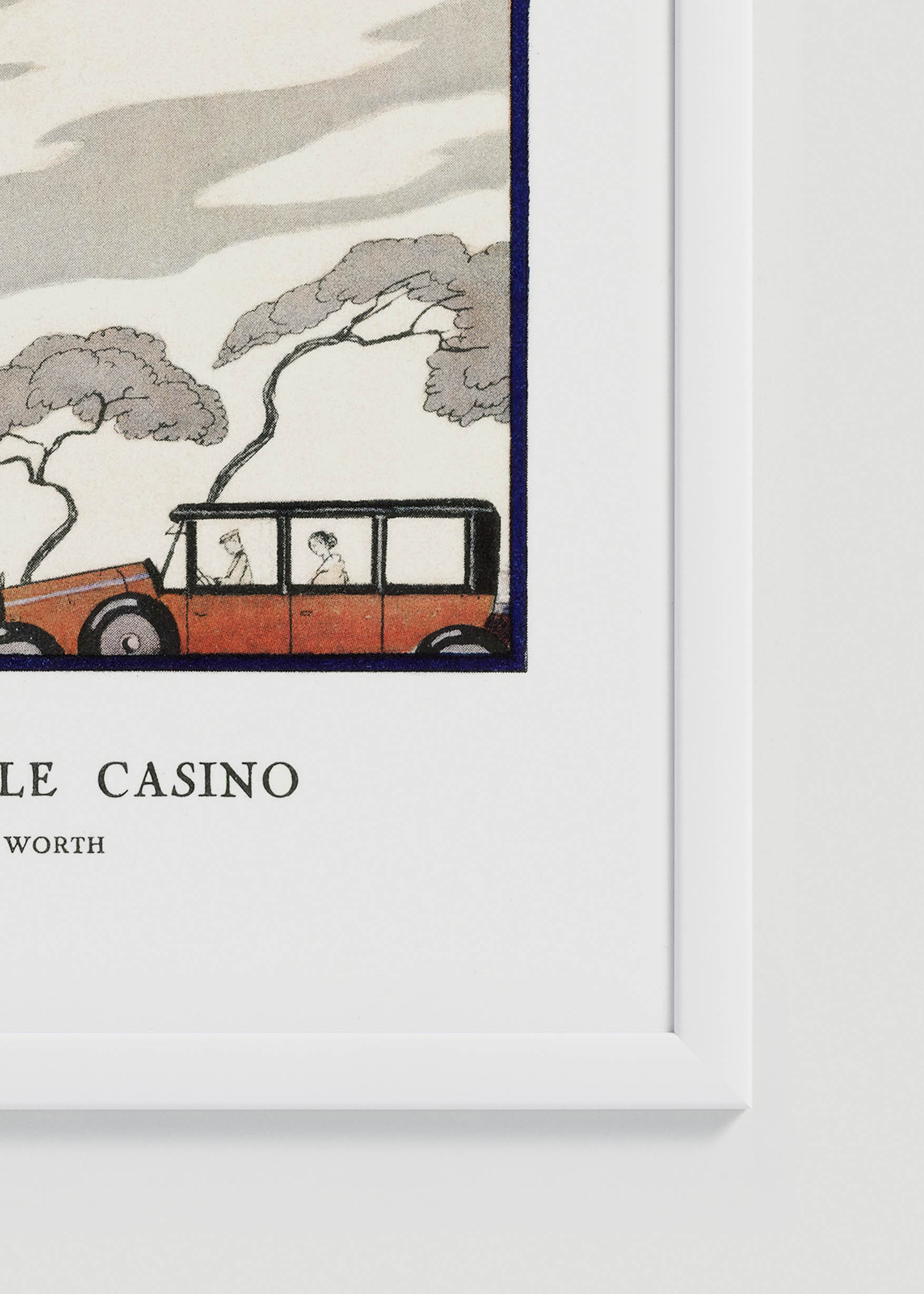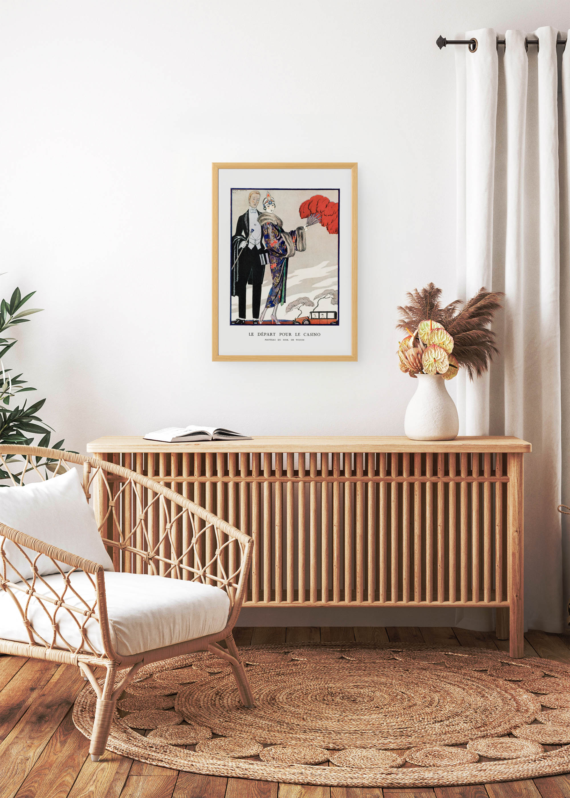 George Barbier, jeden z najbardziej wpływowych ilustratorów francuskiego Art Deco, stworzył to wyrafinowane dzieło zatytułowane „Le Départ pour le Casino” w 1923 roku dla prestiżowego domu mody Worth. Ten wspaniały plakat ukazuje elegancką parę gotową na wieczorne wyjście do kasyna – ona w spektakularnym orientalnym stroju z pawimi piórami, on w klasycznym fraku z białą kamizelką. Barbier, nazywany „modowym poetą lat dwudziestych”, mistrzowsko uchwycił ducha epoki jazzu i szampańskiej ekstrawagancji.