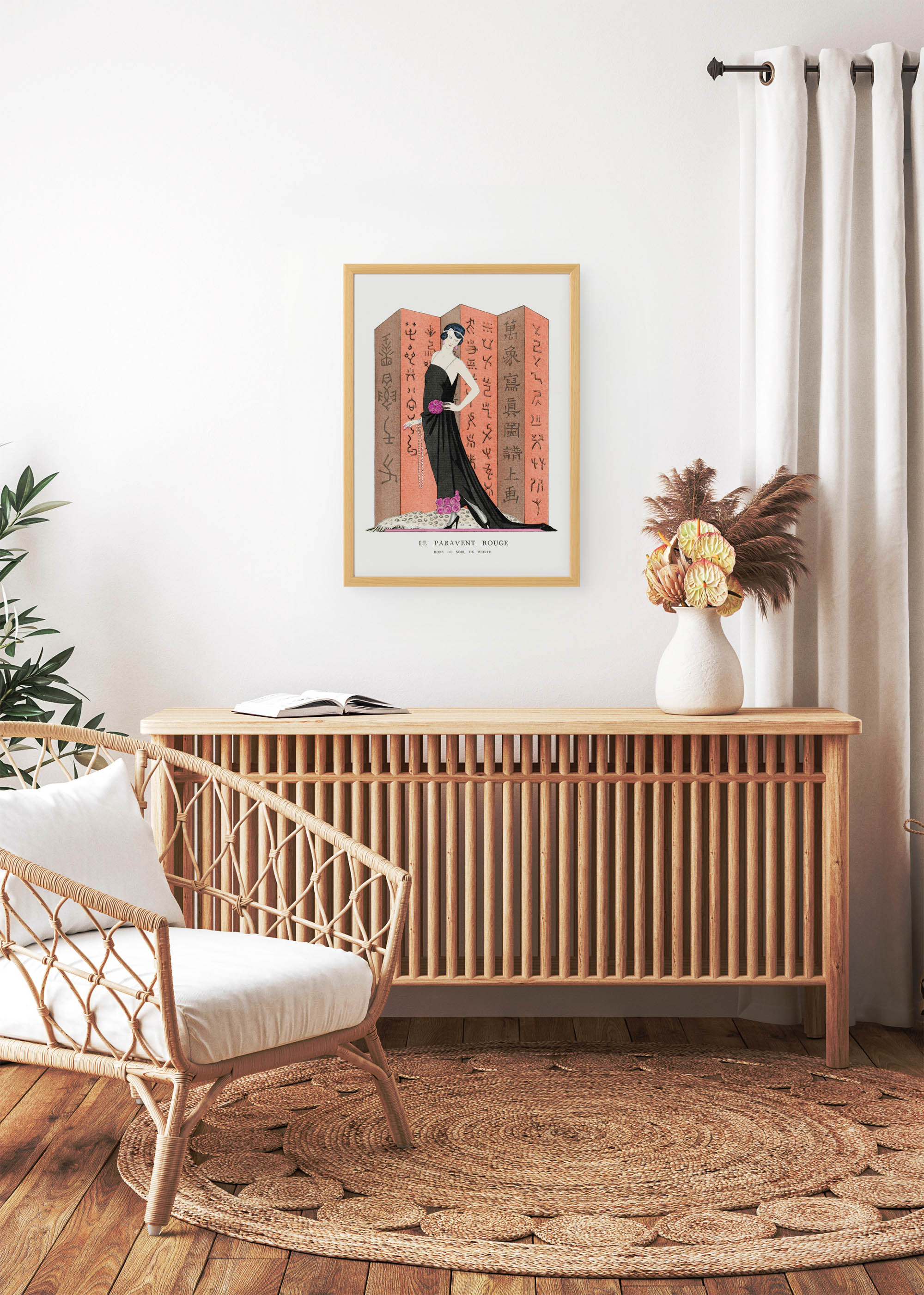 George Barbier, jeden z najwybitniejszych ilustratorów epoki Art Deco, stworzył „Le Paravent Rouge” dla renomowanego domu mody Worth na początku XX wieku. Ten mistrzowski plakat, powstały w okresie największego rozkwitu paryskiej elegancji, ukazuje kwintesencję stylu lat 20. – epoki, gdy moda stała się sztuką, a sztuka przenikała każdy aspekt życia towarzyskiego.