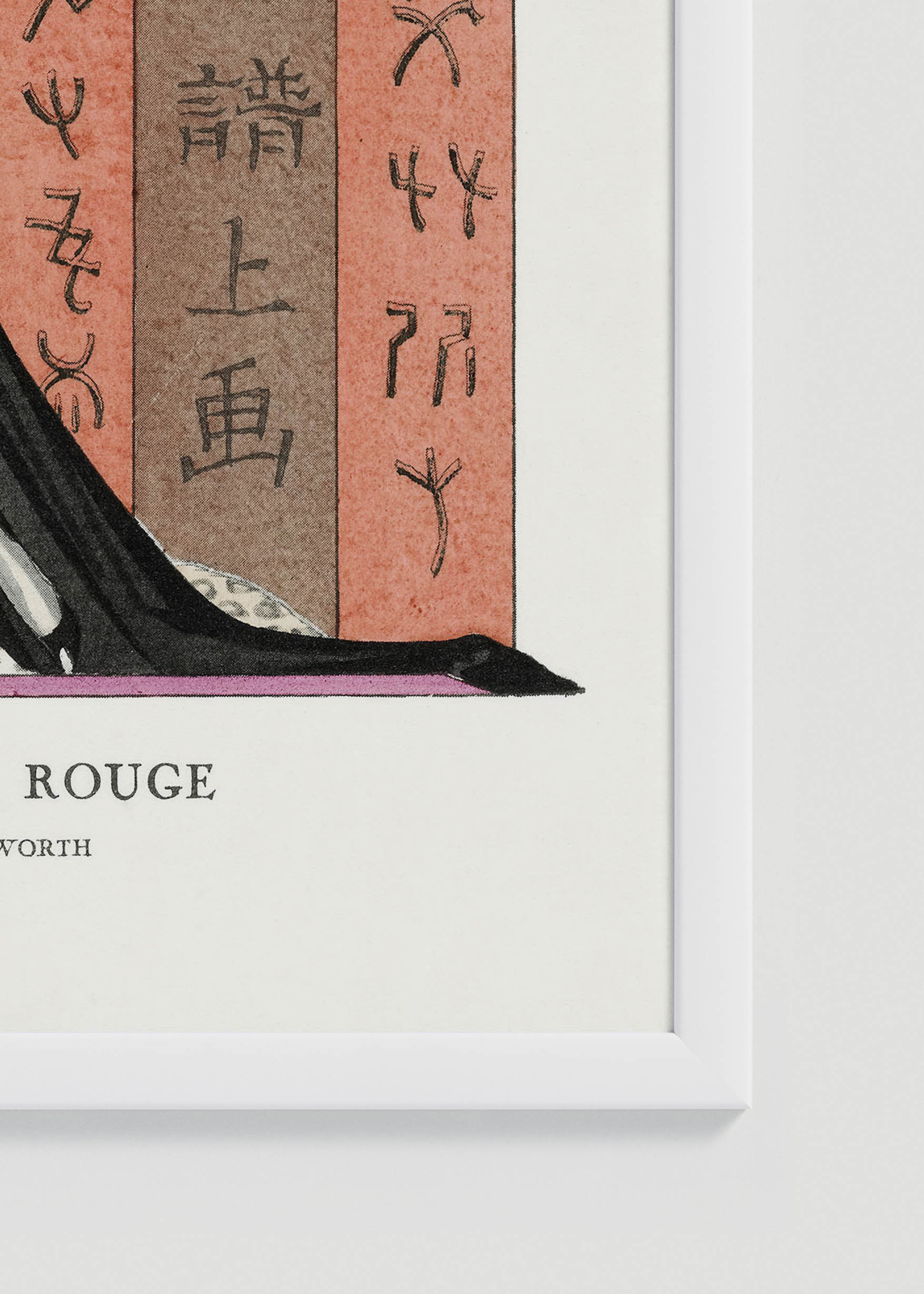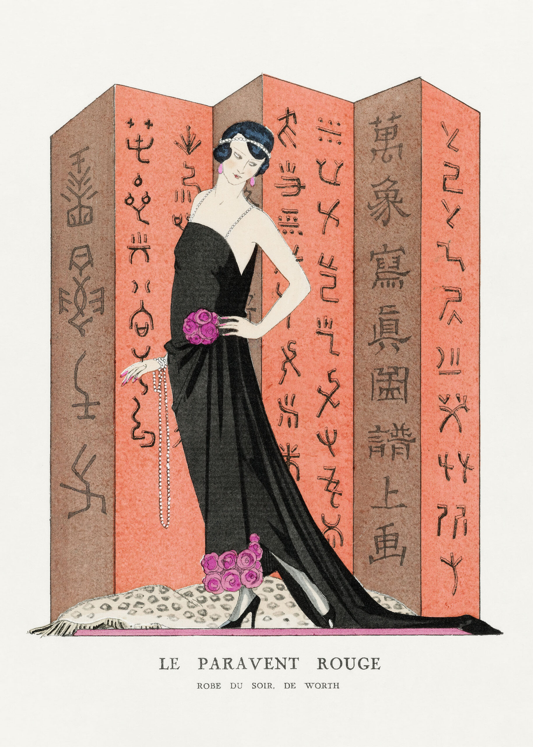 Plakat przedstawia smukłą sylwetkę w kreacji Worth – czarnej sukni z trenem, ozdobionej perłowym sznurem i różowymi różami. Tło stanowi chiński parawan pokryty tajemniczymi znakami, co było typowym motywem okresu, gdy Europa fascynowała się kulturą Dalekiego Wschodu. Barbier mistrzowsko oddał ducha czasów – połączenie paryskiej elegancji z egzotycznymi wpływami.