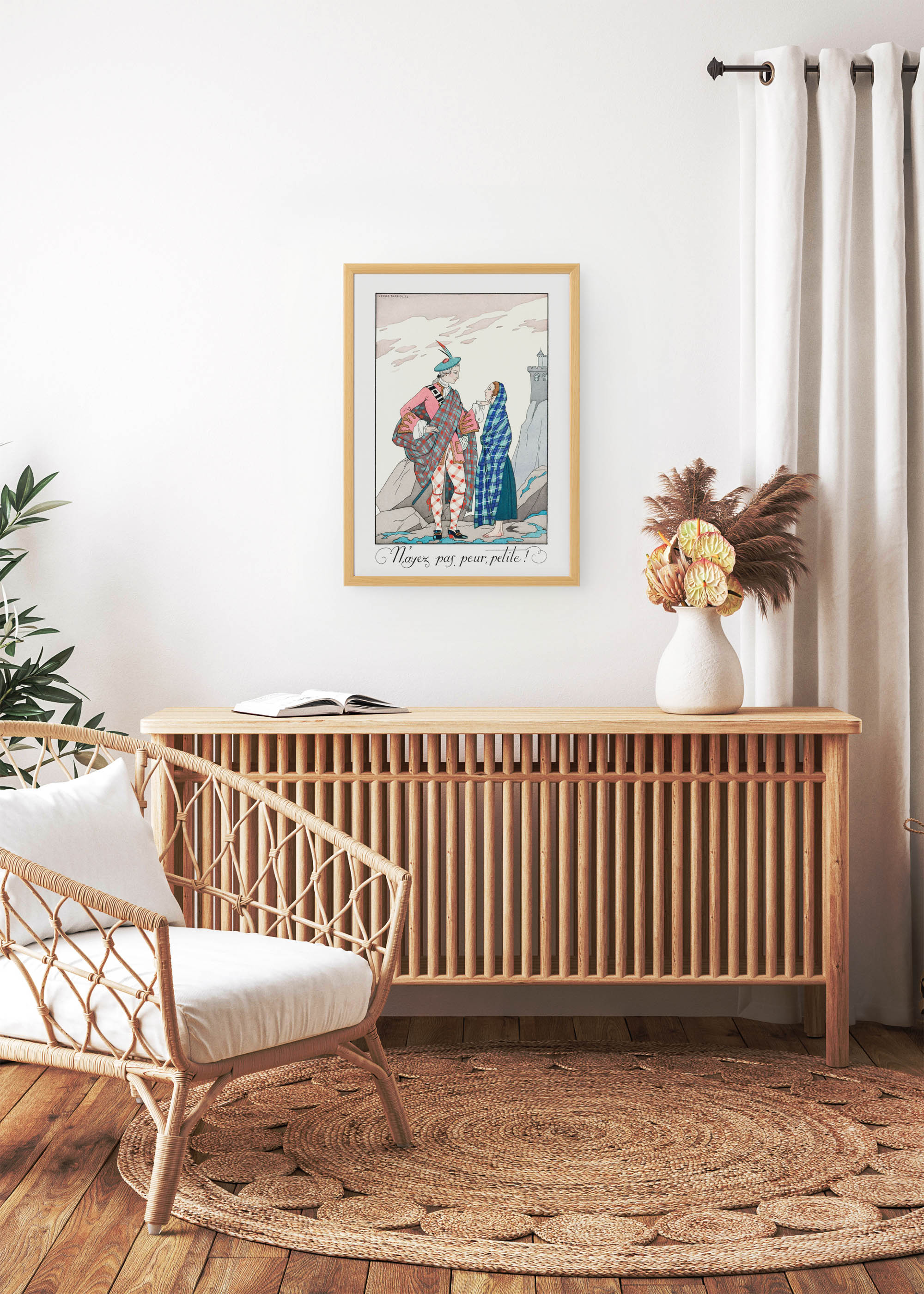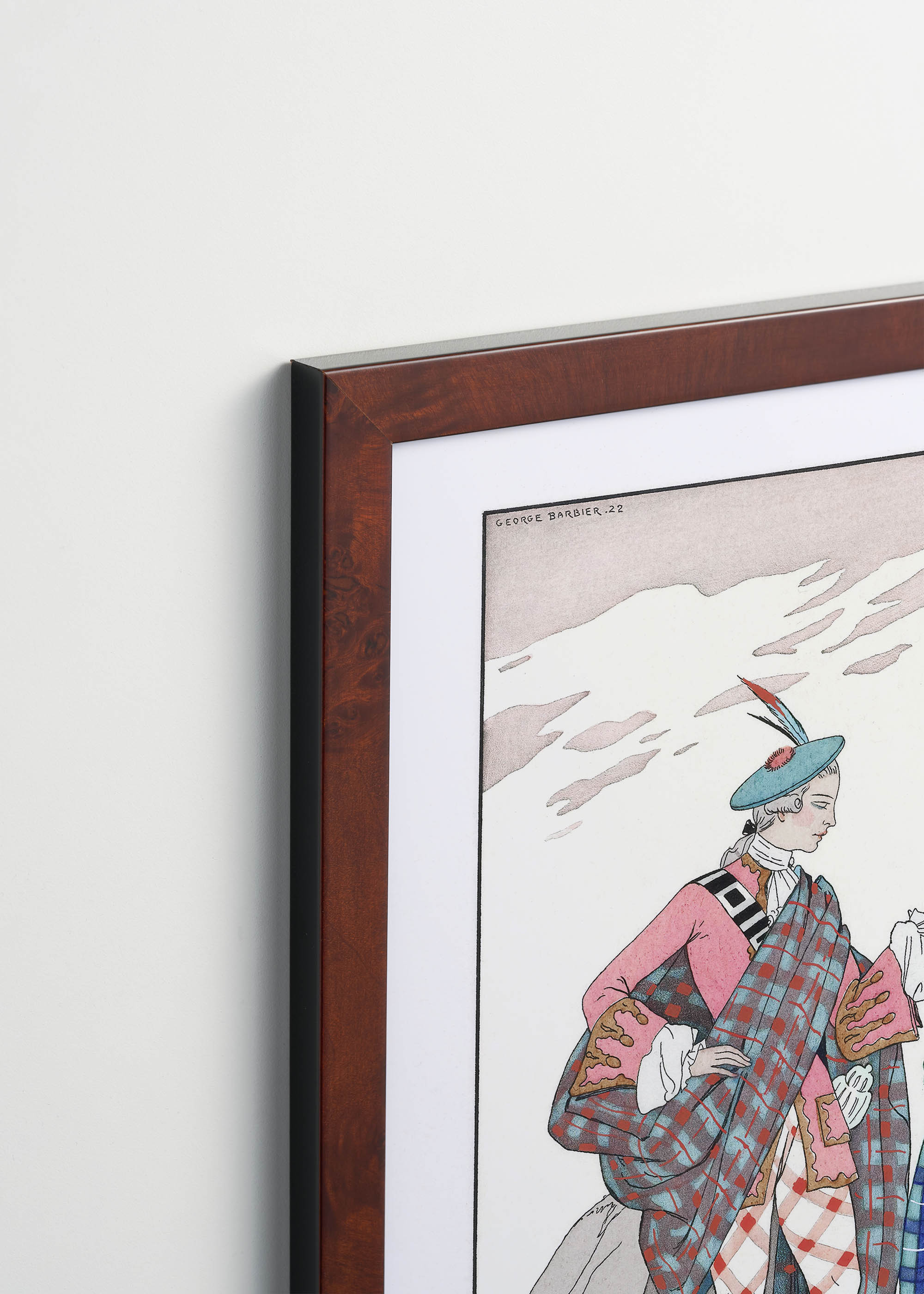 Ten niezwykły plakat z kolekcji George’a Barbiera bazujący na ilustracji z 1922 r. przenosi nas w świat elegancji i wyrafinowania epoki Art Deco. Barbier, francuski ilustrator i projektant mody działający w pierwszej połowie XX wieku, zasłynął jako jeden z najwybitniejszych twórców pochete – luksusowych czasopism modowych. Jego prace, inspirowane baletem rosyjskim i orientalizmem, stały się symbolem paryskiej elegancji lat dwudziestych.
