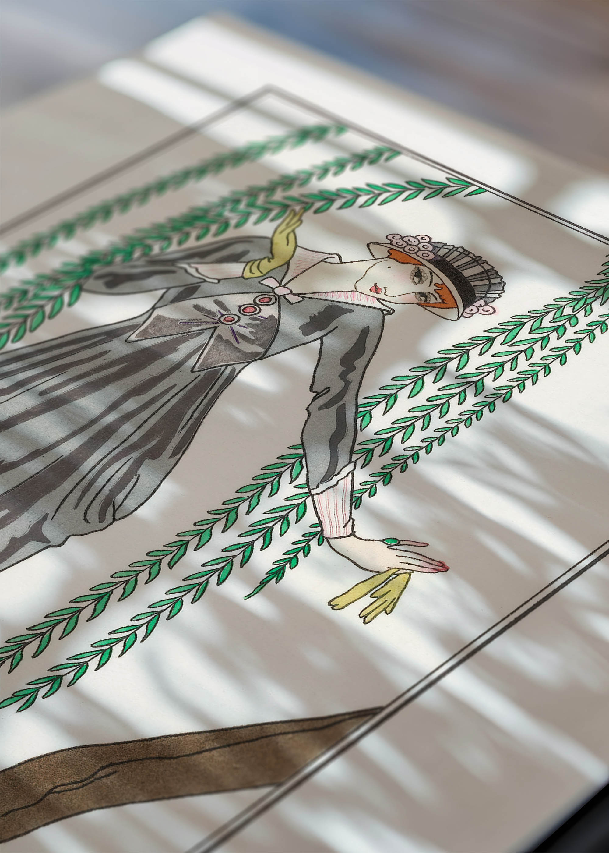 Elegia z czasów Art Deco – „Robe de taffetas gris” („Szara suknia z tafty”) autorstwa mistrza George’a Barbiera z 1913 roku. Ten wykwintny plakat ukazuje scenę, która mogłaby pochodzi wprost z paryskiego świata mody sprzed ponad wieku. Barbier, francuski ilustrator i jeden z czołowych przedstawicieli ruchu Art Deco, stworzył to dzieło w szczytowym okresie swojej twórczości, gdy jego prace zdobiły najlepsze magazyny mody oraz luksusowe wydania książek.