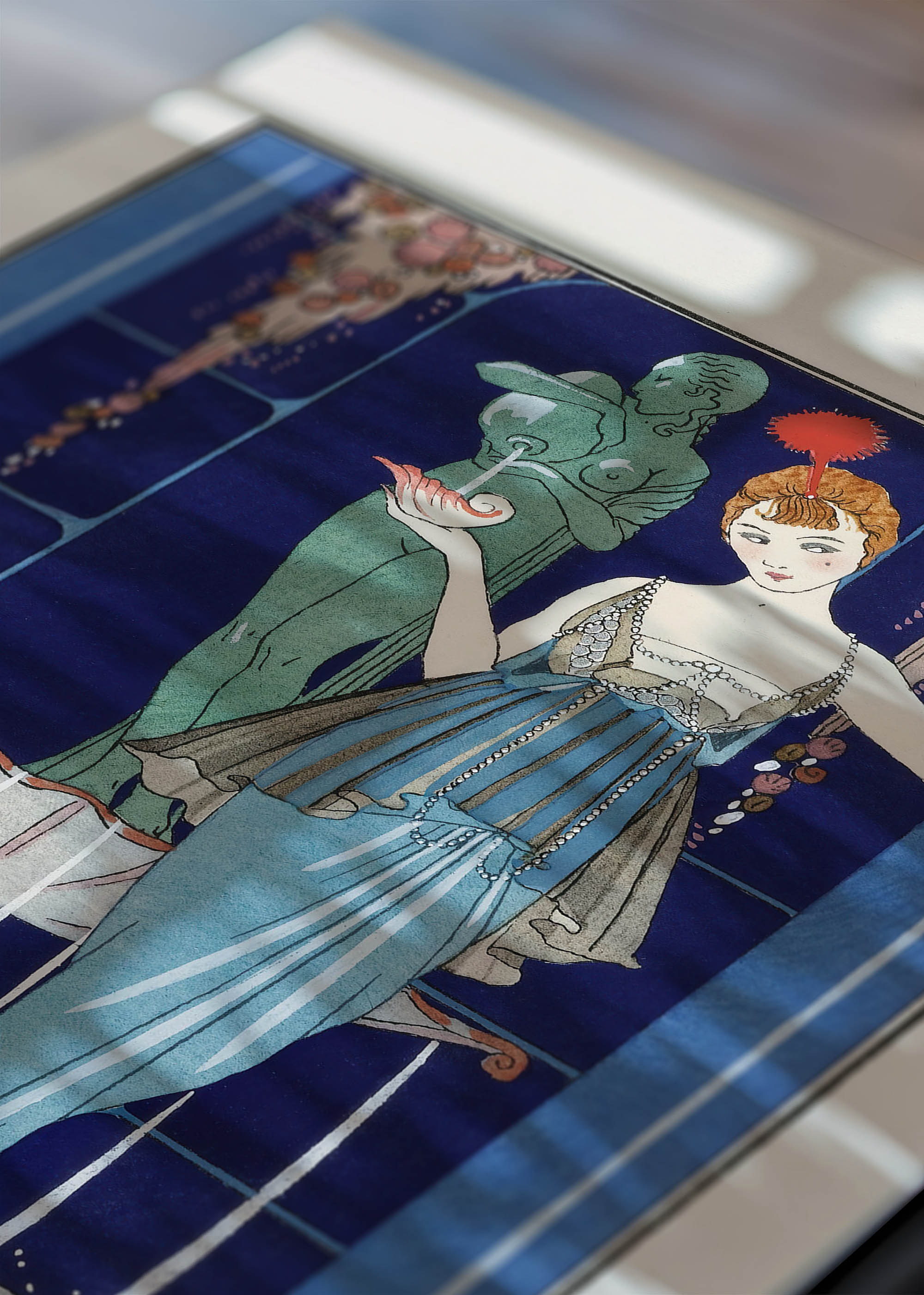 Ten wyjątkowy plakat to reprodukcja ilustracji George’a Barbiera z 1914 roku, jednego z najwybitniejszych przedstawicieli paryskiej szkoły Art Déco. Barbier, urodzony w Nantes w 1882 roku, zasłynął jako ilustrator mody i twórca plakatów teatralnych, którego prace regularnie pojawiały się w luksusowych magazynach takich jak „La Gazette du Bon Ton”. Ciekawostką jest, że artysta czerpał inspirację zarówno z antycznej Grecji, jak i z bieżących trendów haute couture, tworząc niepowtarzalny styl łączący klasyczną elegancję z nowoczesną estetyką.