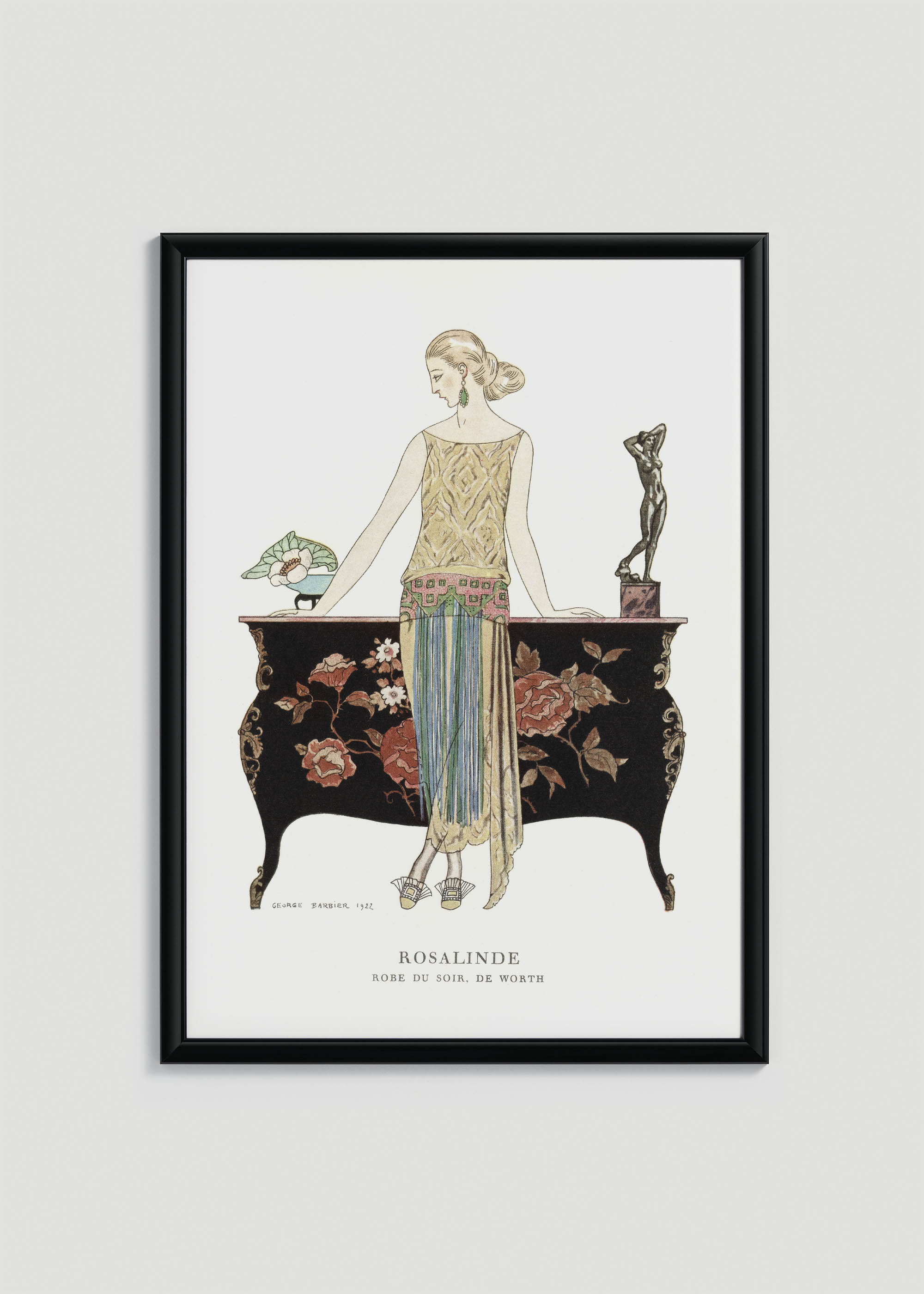 Przed nami prawdziwa perła francuskiego Art Deco – „Rosalinde” autorstwa George’a Barbiera z 1922 roku. Ten wyjątkowy plakat powstał jako ilustracja mody dla słynnego domu mody Worth, jednego z pionierów haute couture. Barbier, urodzony w 1882 roku w Nantes, był nie tylko ilustratorem, ale także kostiumografem i scenografem, który współpracował z najznakomitszymi paryskimi domami mody. Ciekawostką jest, że artysta czerpał inspirację zarówno z klasycznej sztuki greckiej, jak i z orientalnych wpływów, co doskonale widać w tej kompozycji.