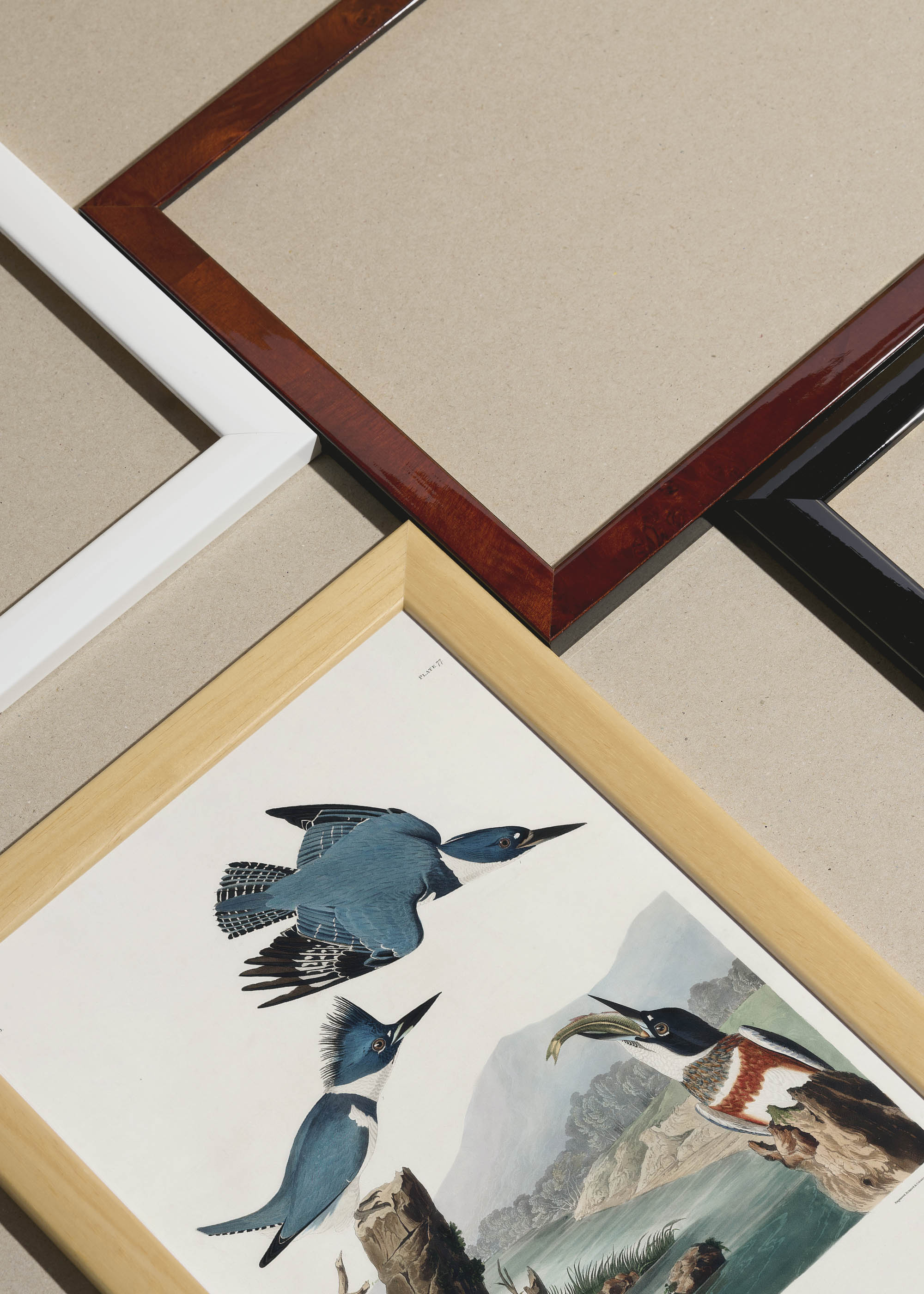 Ten wspaniały plakat przedstawia jedną z najbardziej rozpoznawalnych ilustracji z monumentalnego dzieła „Birds of America” Johna Jamesa Audubona. Tablica 77 ukazuje zimorodka amerykańskiego (Belted Kingfisher) w charakterystycznym, dynamicznym ujęciu. Audubon, który tworzył swoje dzieło w latach 1827-1838, był pionierem ornitologicznej ilustracji naukowej, przedstawiając ptaki w naturalnych pozach i środowisku. Jego prace powstały podczas licznych wypraw po Ameryce Północnej, gdzie obserwował i dokumentował dziką przyrodę z niespotykaną dotąd dokładnością.