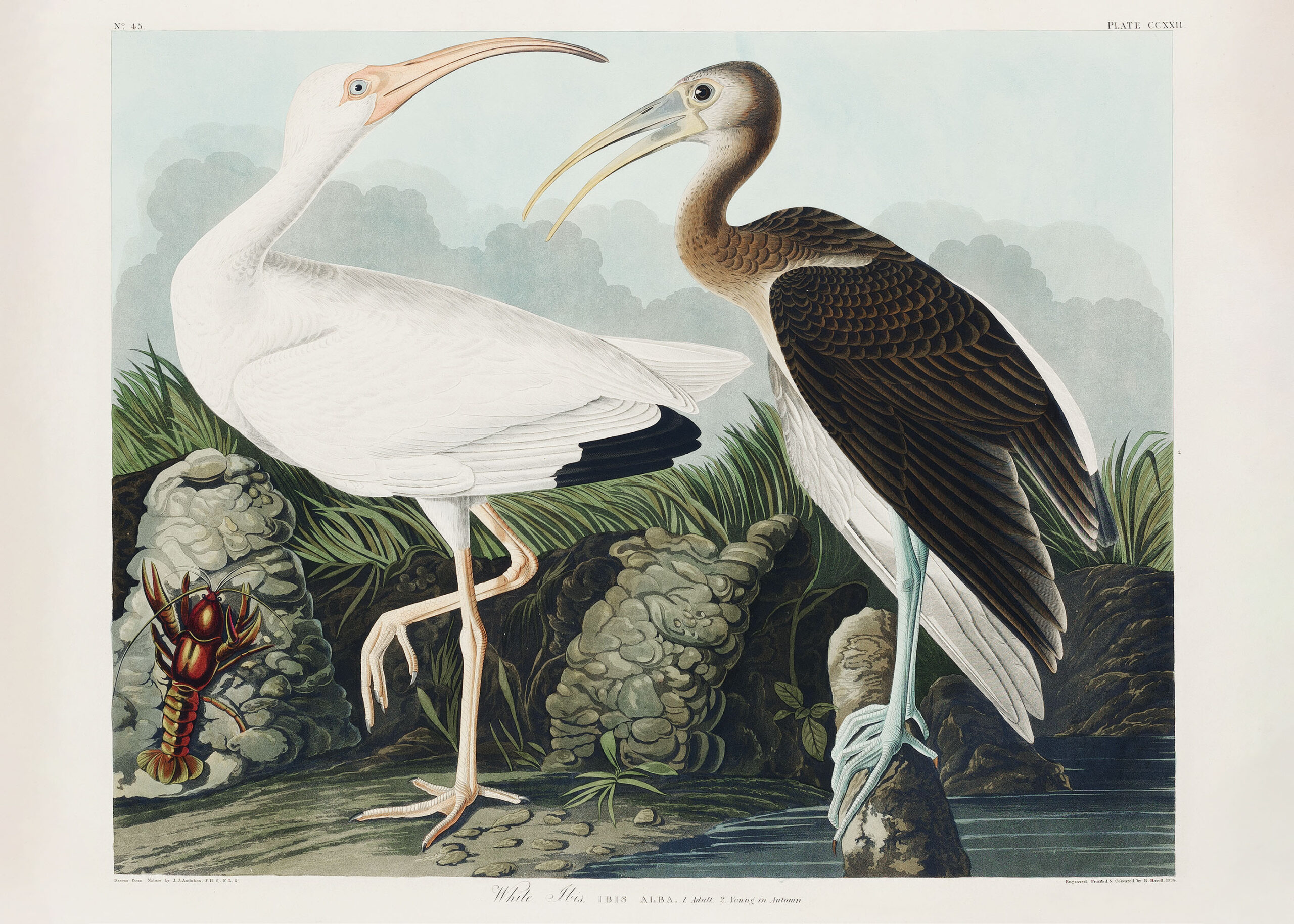 Na ilustracji widzimy dwa ibisy – białego i ciemnego – ukazane z charakterystyczną dla Audubona dbałością o szczegóły anatomiczne. Kolorystyka oscyluje wokół delikatnych kremowych bieli kontrastujących z głębokimi brązami przypominającymi paloną umbrę. Tło utrzymane jest w stonowanych szarawobłękitnych tonach, podczas gdy bujne zielenie roślinności dodają kompozycji świeżości. Szczególnie urzekający jest kontrast między alabastrową czystością białego ibisa a ciemnoczekoladowym upierzeniem jego towarzysza.