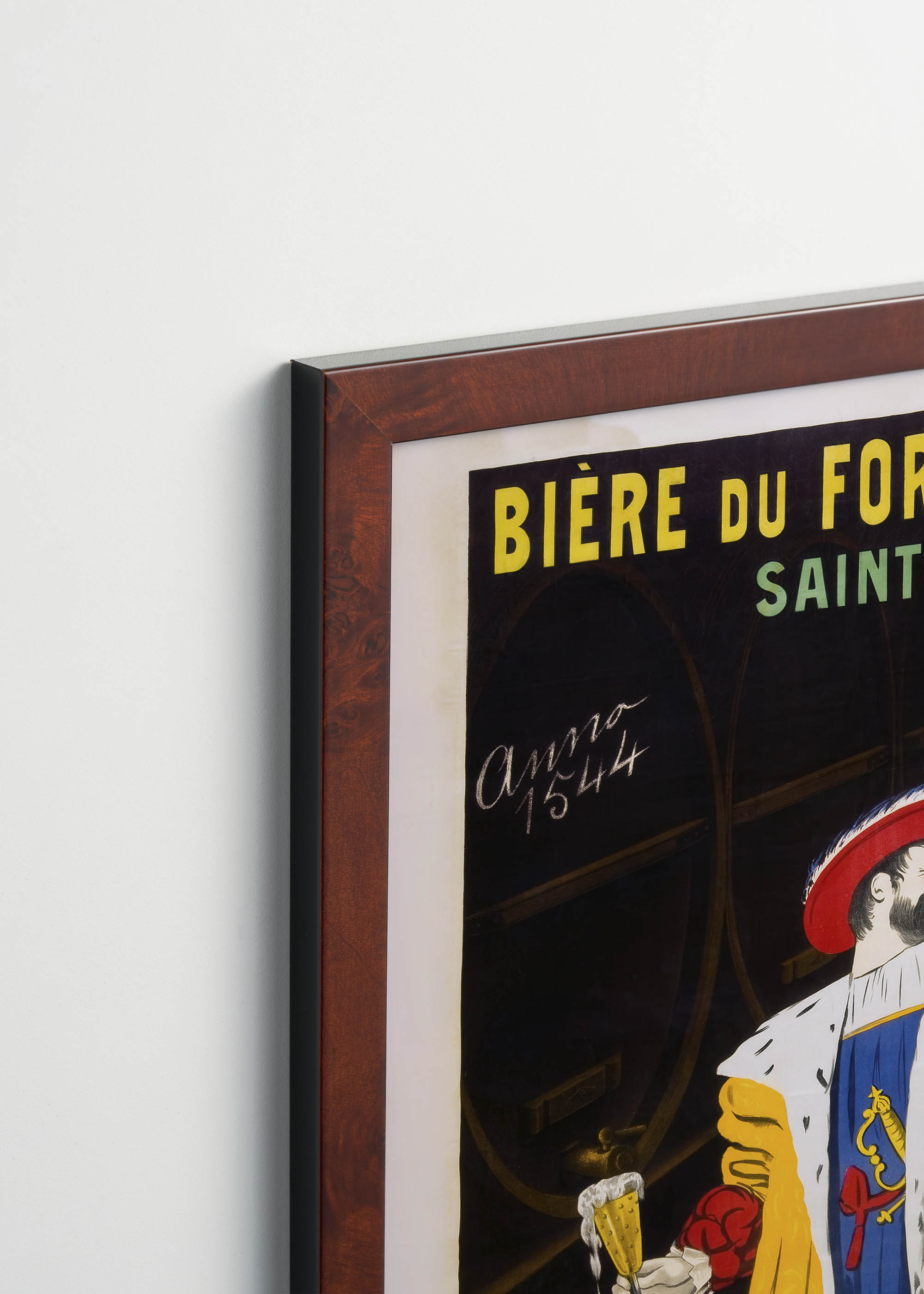 Na plakacie widzimy dostojną postać szlachcica w renesansowym stroju, który z gracją unosi kufel złocistego piwa. Kolorystyka dzieła opiera się na kontrastach – intensywna kadmowa czerwień kapelusza z szerokim rondem przechodzi w ciepłe, bursztynowe tony żółtego płaszcza z futrzanym kołnierzem. Błękit szafirowy tuniki z heraldycznym motywem tworzy mocny akcent centralny, podczas gdy głębokie brązy umbry w tle nadają kompozycji dramatyzmu.