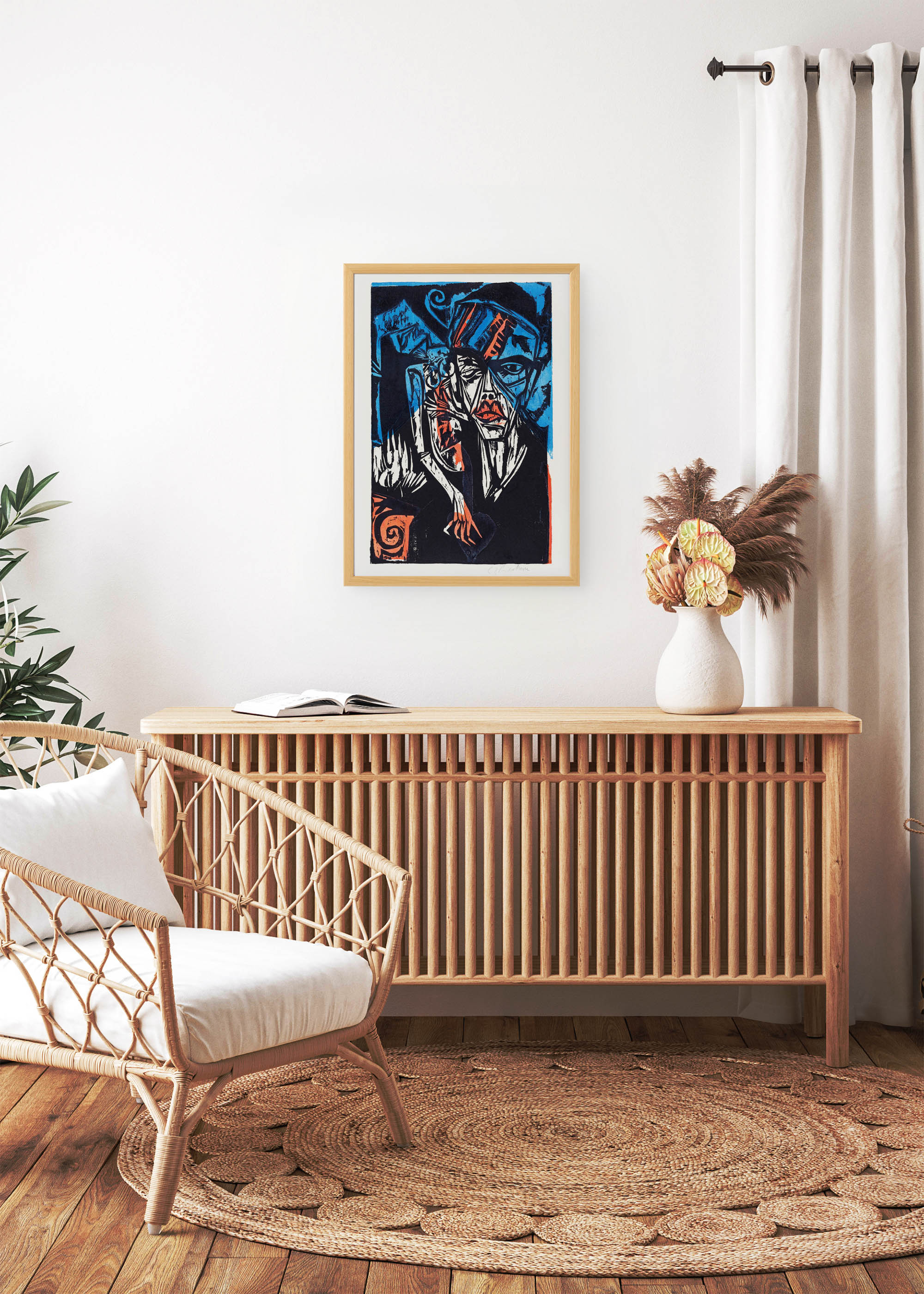 Ten fascynujący plakat będący reprintem dzieła „Bitwy. Agonie Miłości” Ernsta Ludwiga Kirchnera z 1915 r. przenosi nas w sam środek niemieckiego ekspresjonizmu z początku XX wieku. Kirchner, jeden z założycieli grupy Die Brücke, tworzył w czasach rewolucji artystycznej, kiedy tradycyjne formy ustępowały miejsca radykalnie nowym środkom wyrazu. Jego charakterystyczna technika drzeworytnicza, widoczna w tym wzorze, oddaje surową energię tamtej epoki.