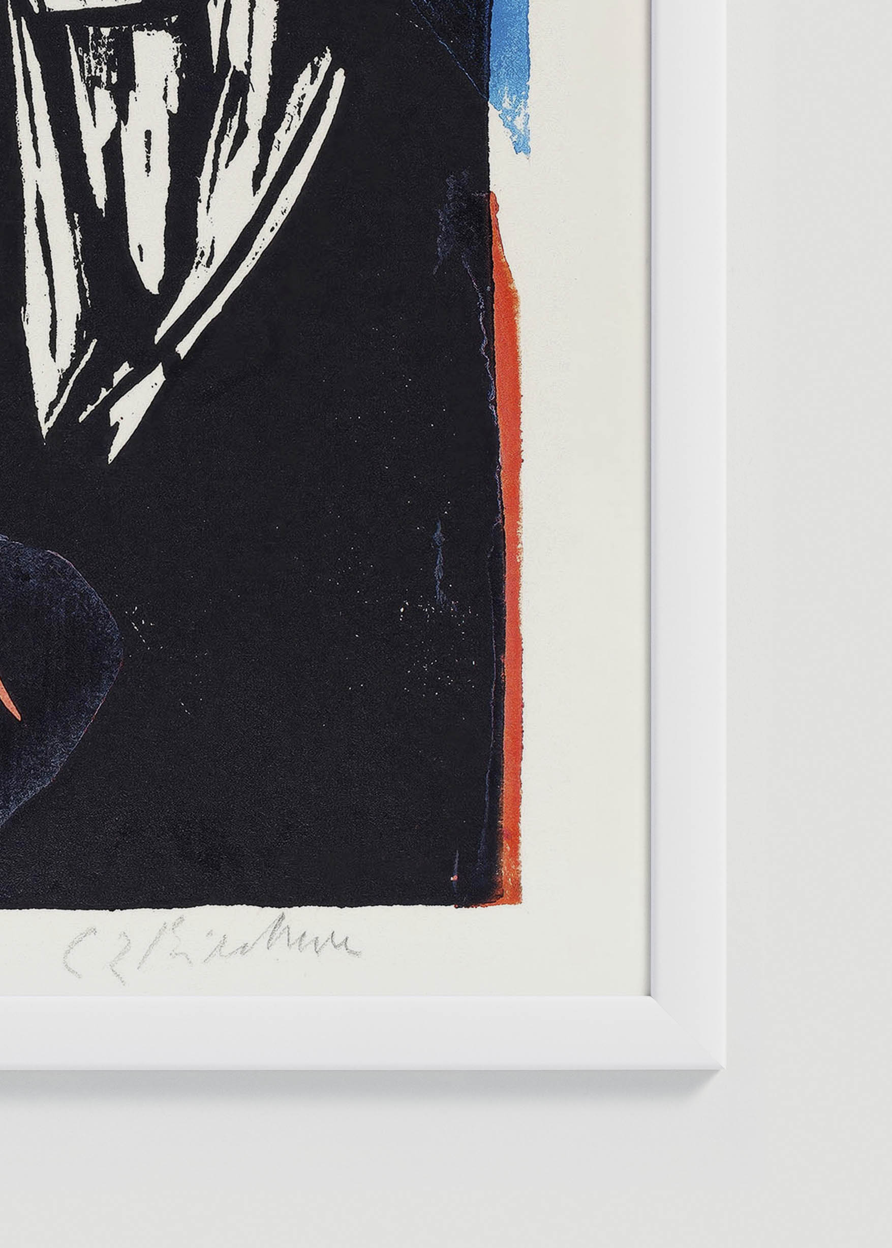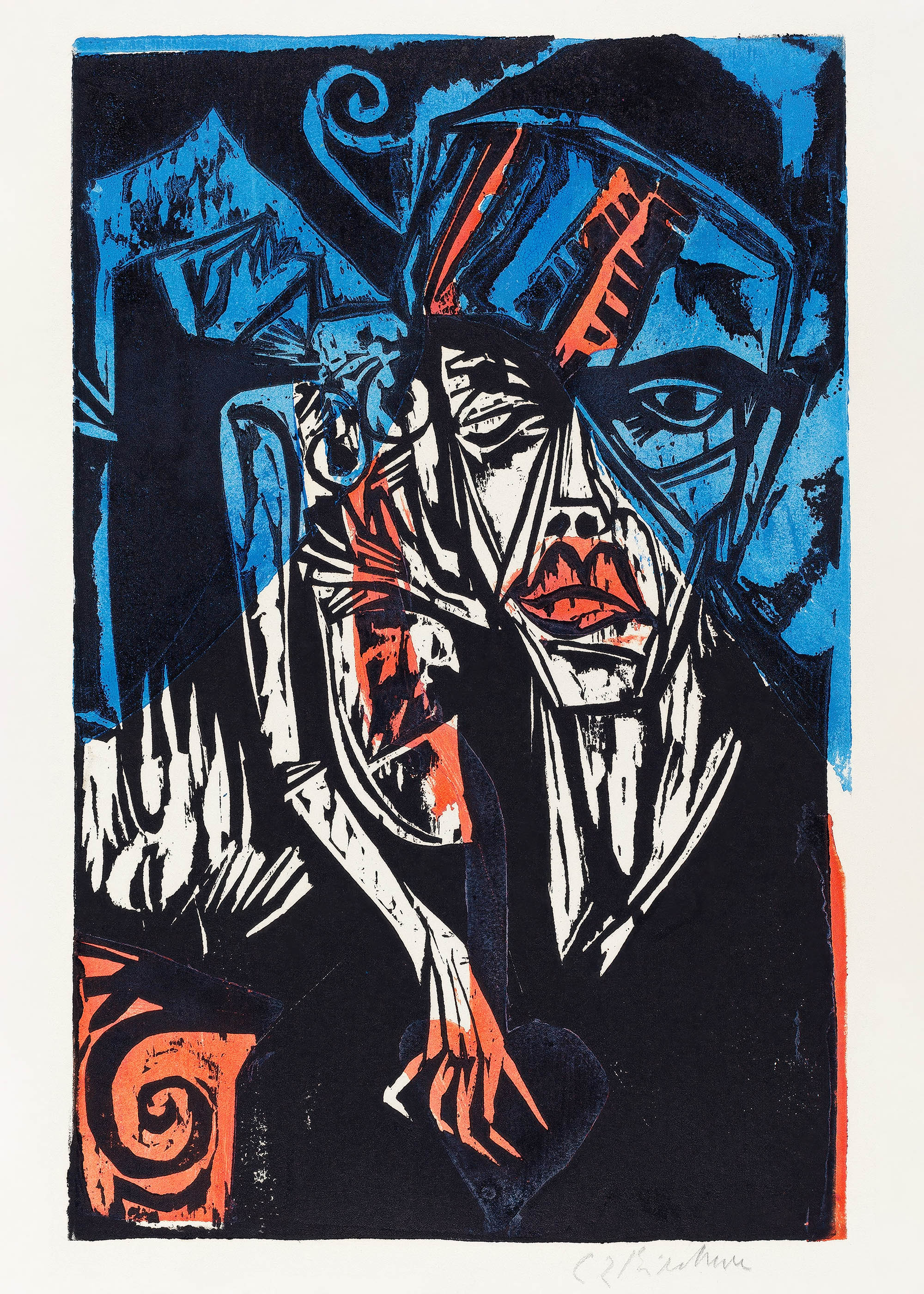 Kompozycja uderza intensywną kolorystyką zdominowaną przez kobaltowe błękity kontrastujące z ognistymi akcentami czerwieni cynobru. Czarne kontury tworzą dramatyczne ramy dla postaci, podczas gdy biel pełni rolę światła przebijającego się przez ciemność. Ta gama barwna, charakterystyczna dla niemieckiego ekspresjonizmu, nadaje całości niepokoją­cą, ale magnetyczną atmosferę.