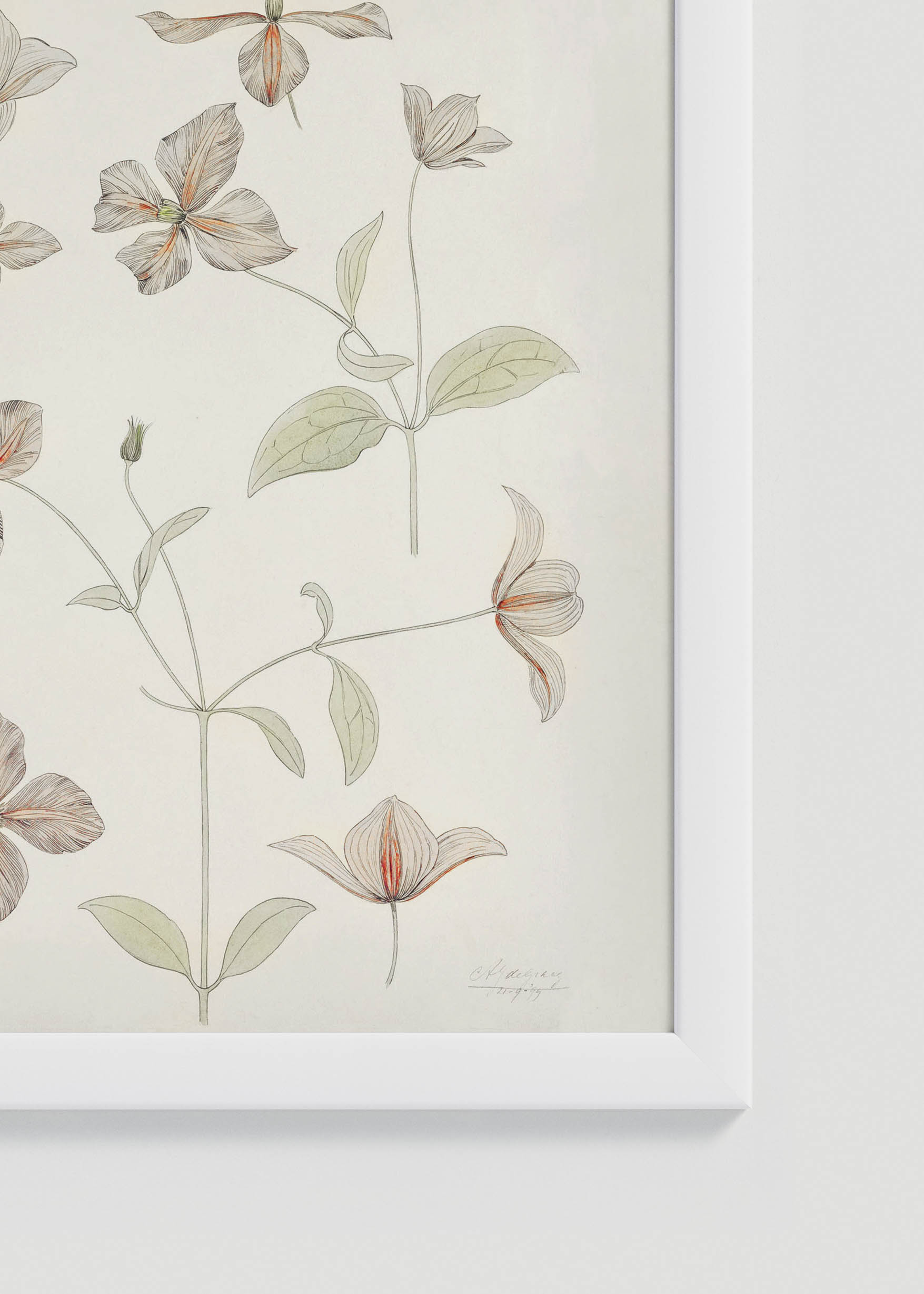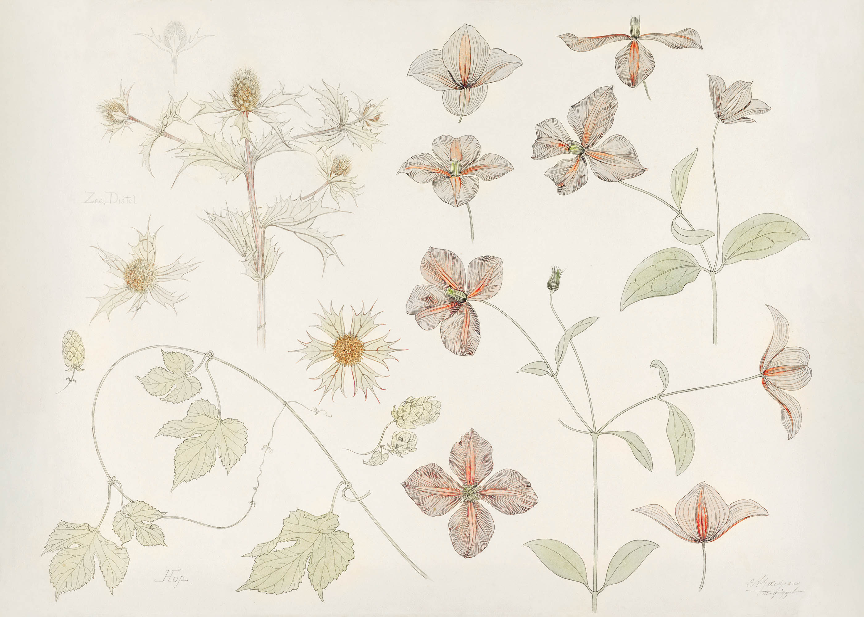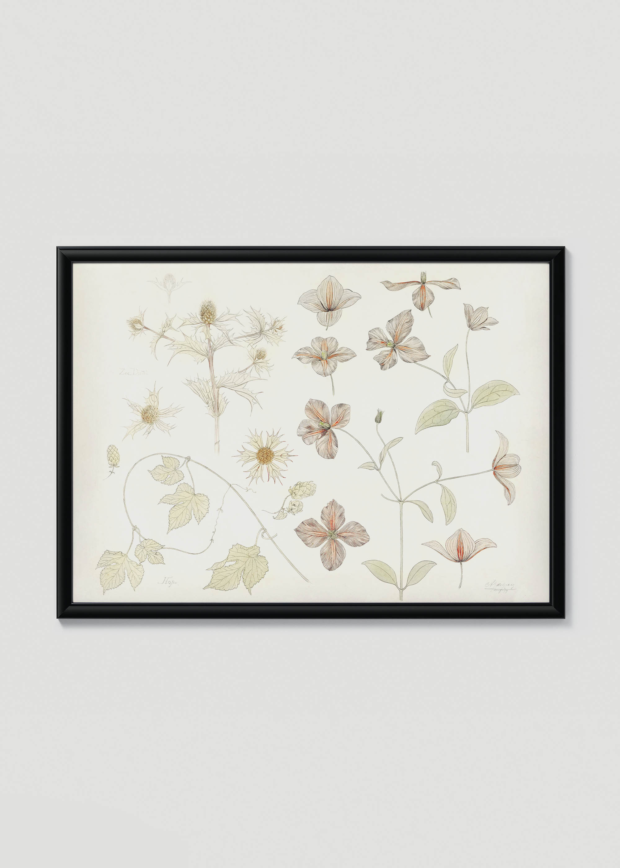 Kompozycja prezentuje różnorodne formy kwiatowe – od rozłożystych pędów z drobnymi kwiatostanami po pojedyncze, czterodzielne kwiaty o delikatnie prążkowanych płatkach. Można dostrzec kształty przypominające oset lub ostropest, szyszki chmielu czy klematis. Każdy element został oddany z naukową precyzją, charakterystyczną dla ilustracji botanicznych tamtego okresu.