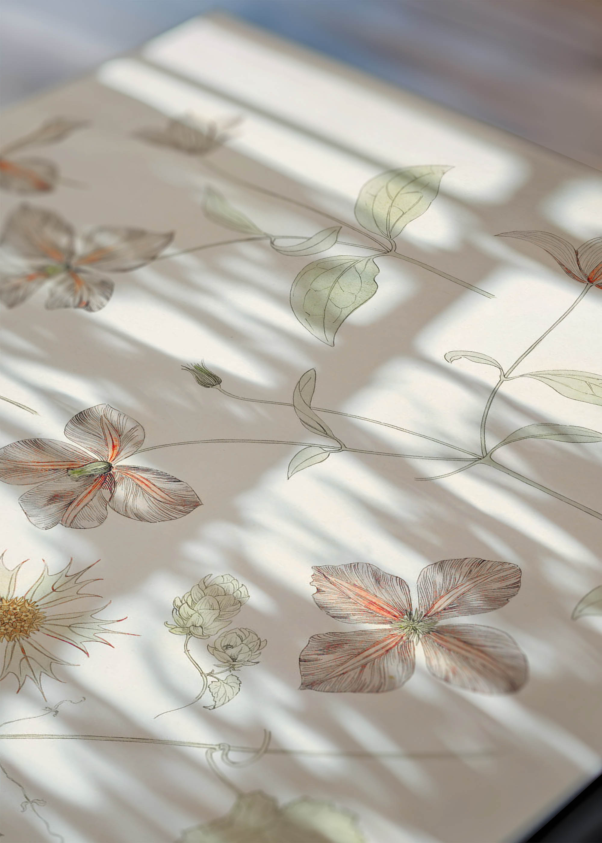 Na tym reprincie dominują delikatne, ziemiste barwy – od kremowych beżów po bladozielone tony. Akcenty kolorystyczne stanowią subtelne nuty cynamonowej czerwieni i miedziane refleksy, które ożywiają kwiaty przedstawione w różnych stadiach rozwoju. Całość utrzymana jest w palecie przypominającej wysuszone zielniki i botaniczne atlasy z epoki wiktoriańskiej.