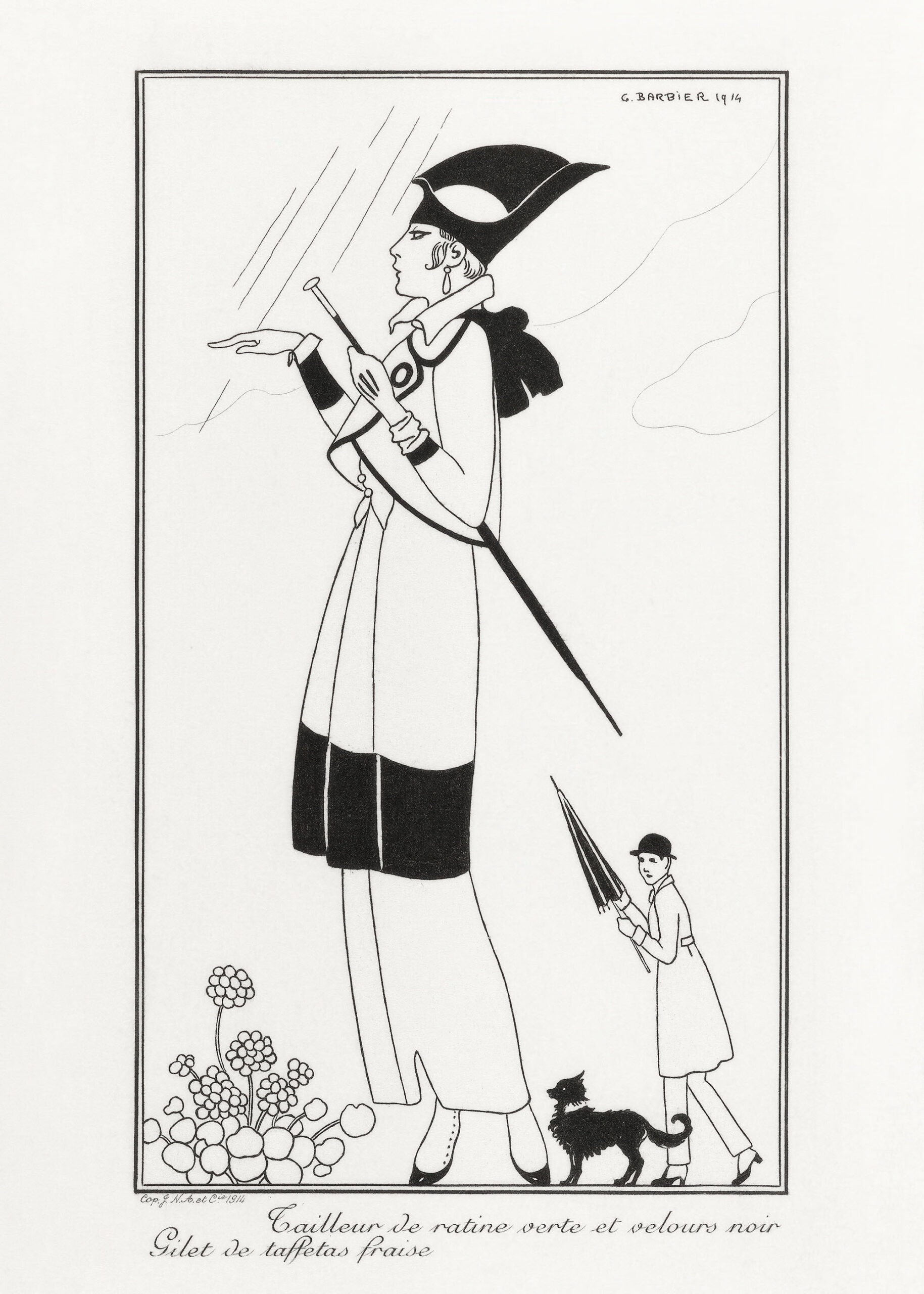 Kompozycja przedstawia stylową damę, która zdaje się zupełnie nie przejmować padającym deszczem. Świadczy o tym złożona parasolka i wymowny gest dłoni okrytej elegancką rekawiczką. Kobieta, jak przystało na ilustracje modowe Barbiera, przedstawiona jest w charakterystycznym stroju z epoki – długiej spódnicy z kontrastowym, grafitowym pasem u dołu oraz jasnej bluzce z ciemnymi mankietami. Całość dopełnia ekstrawagancki kapelusz z falującym rondem i wspomniany długi parasol, który pełni funkcję laski spacerowej. W tle dostrzegamy delikatną męską postać towarzyszącą z małym, czarnym pieskiem – typowy element paryskich bulwarów tamtych czasów. Pieskiem – wspomnijmy – przemoczonym już chyba nieco od deszczu.