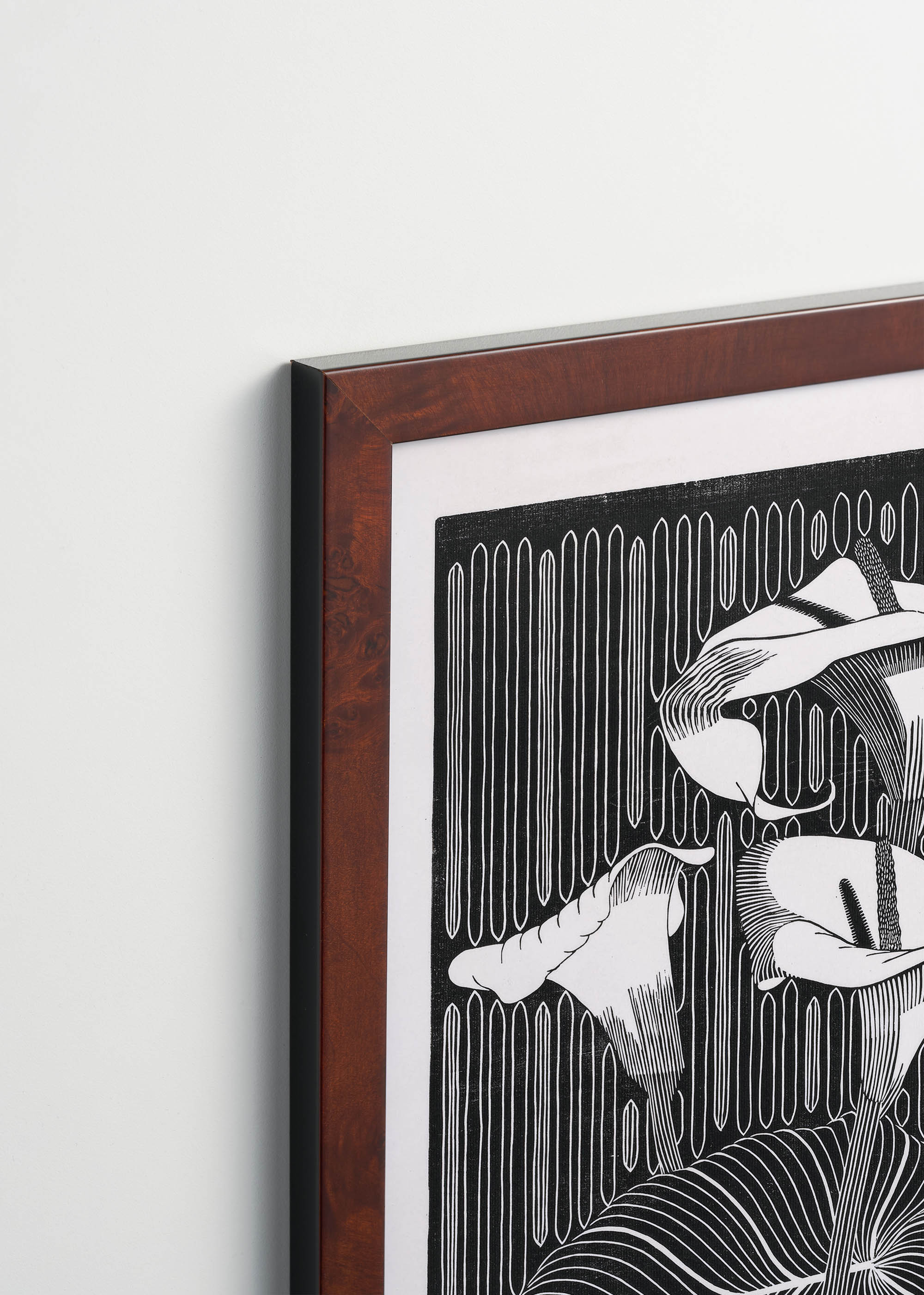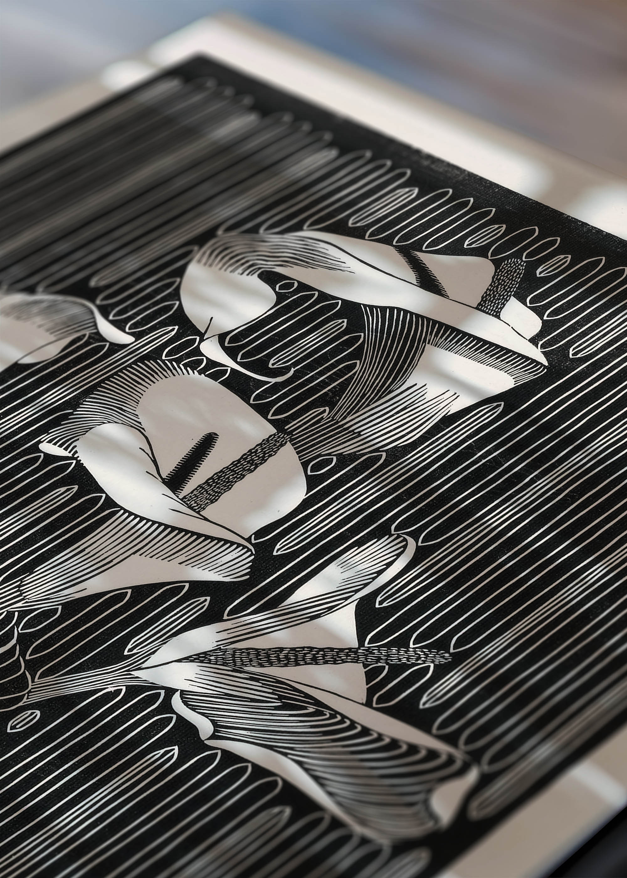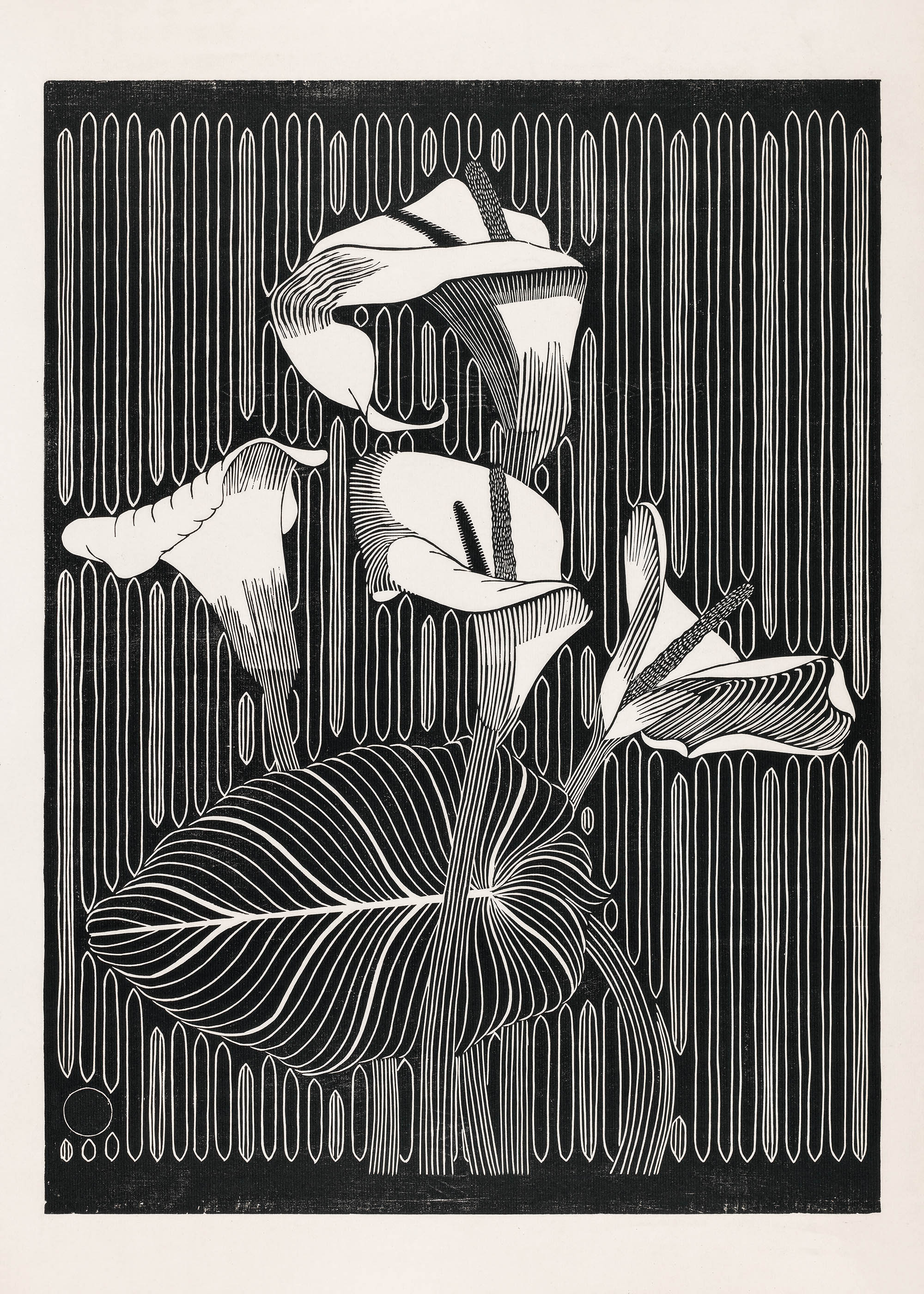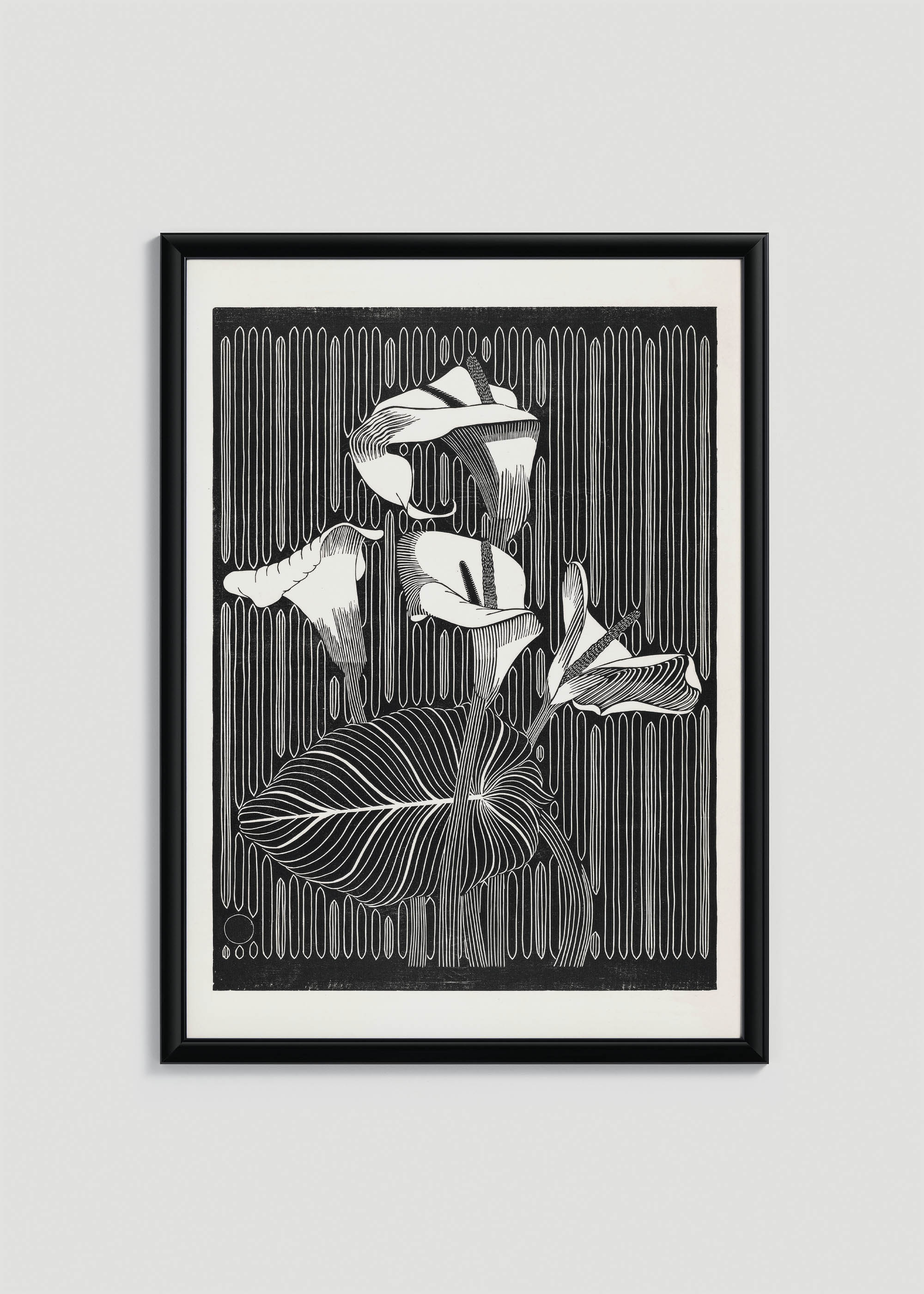 Plakat czarno-biały drzeworyt kwiaty Kalie Mesquita vintage