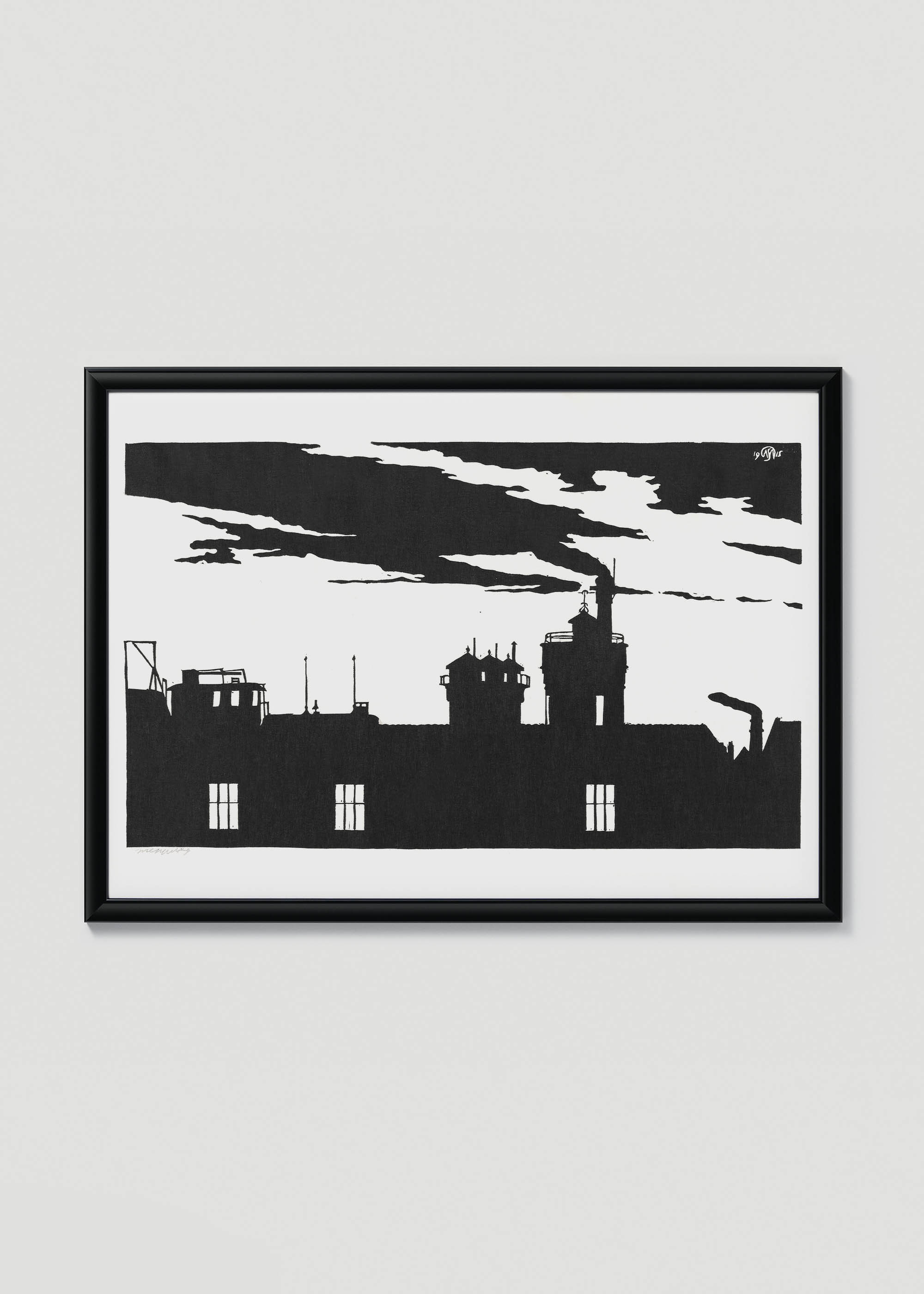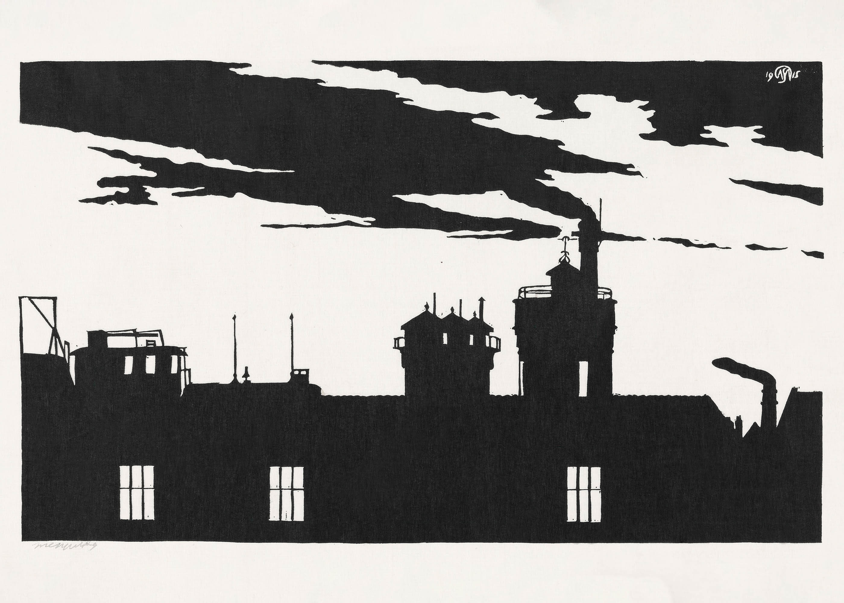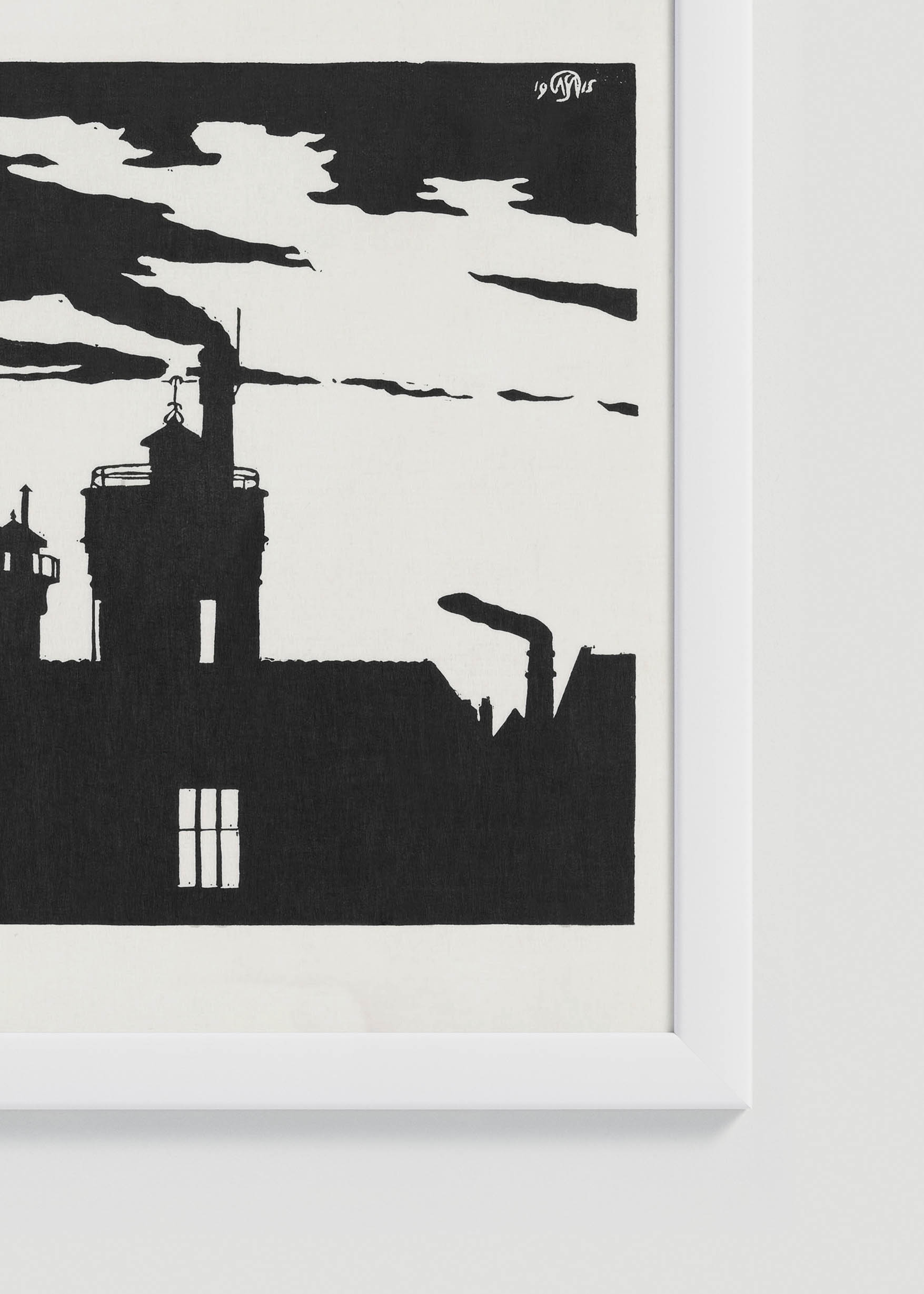 Plakat będący reprintem drzeworytu przedstawiającego elektrownię gazową w Amsterdamie, autorstwa Samuela Jessuruna de Mesquity – holenderskiego artysty pochodzenia portugalsko-żydowskiego, który tworzył na przełomie XIX i XX wieku. De Mesquita, znany przede wszystkim ze swoich ekspresyjnych drzeworytów, był mistrzem techniki wycinania w drewnie, a jego prace charakteryzowały się dramatyczną grą kontrastów między czernią a bielą.
