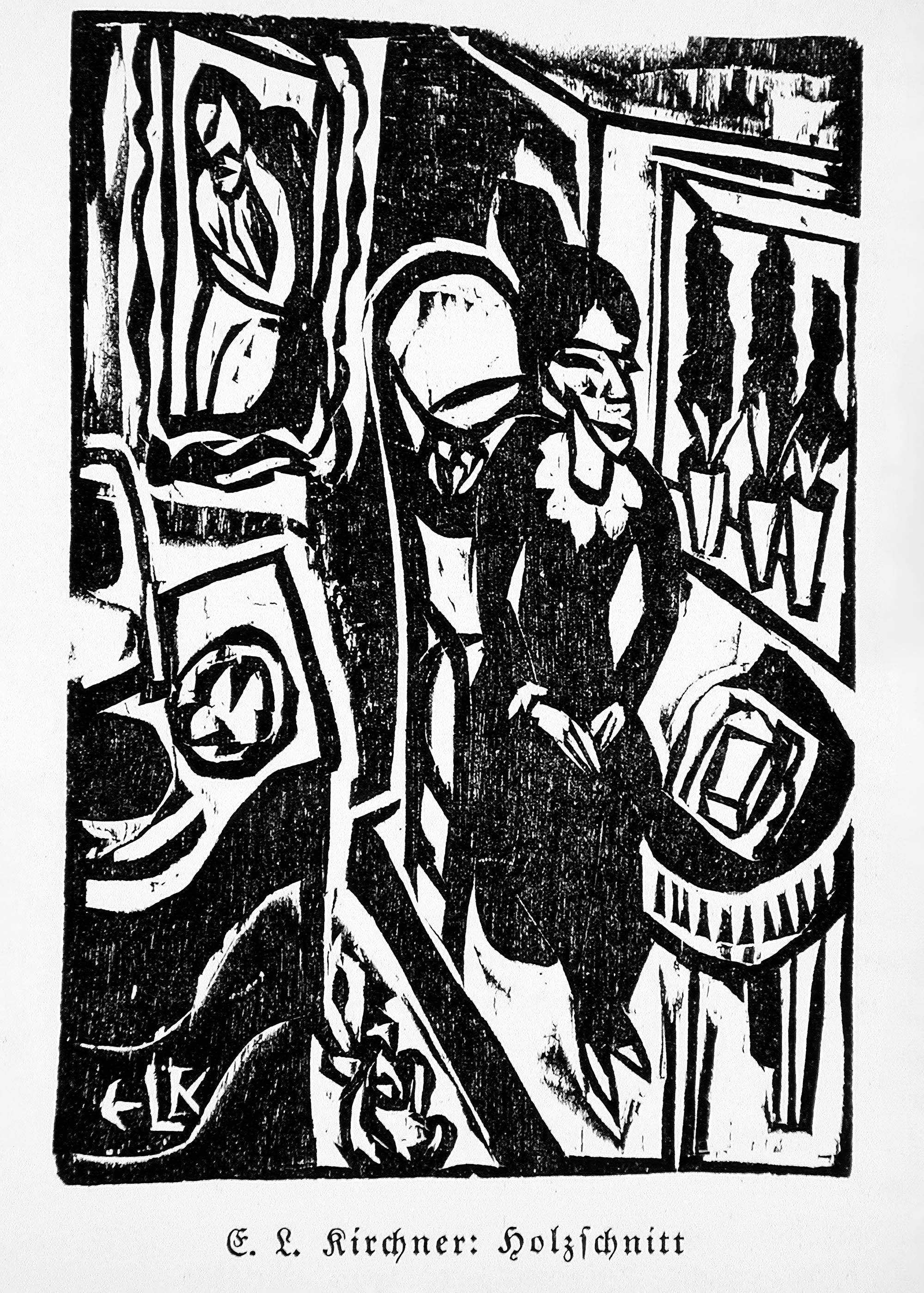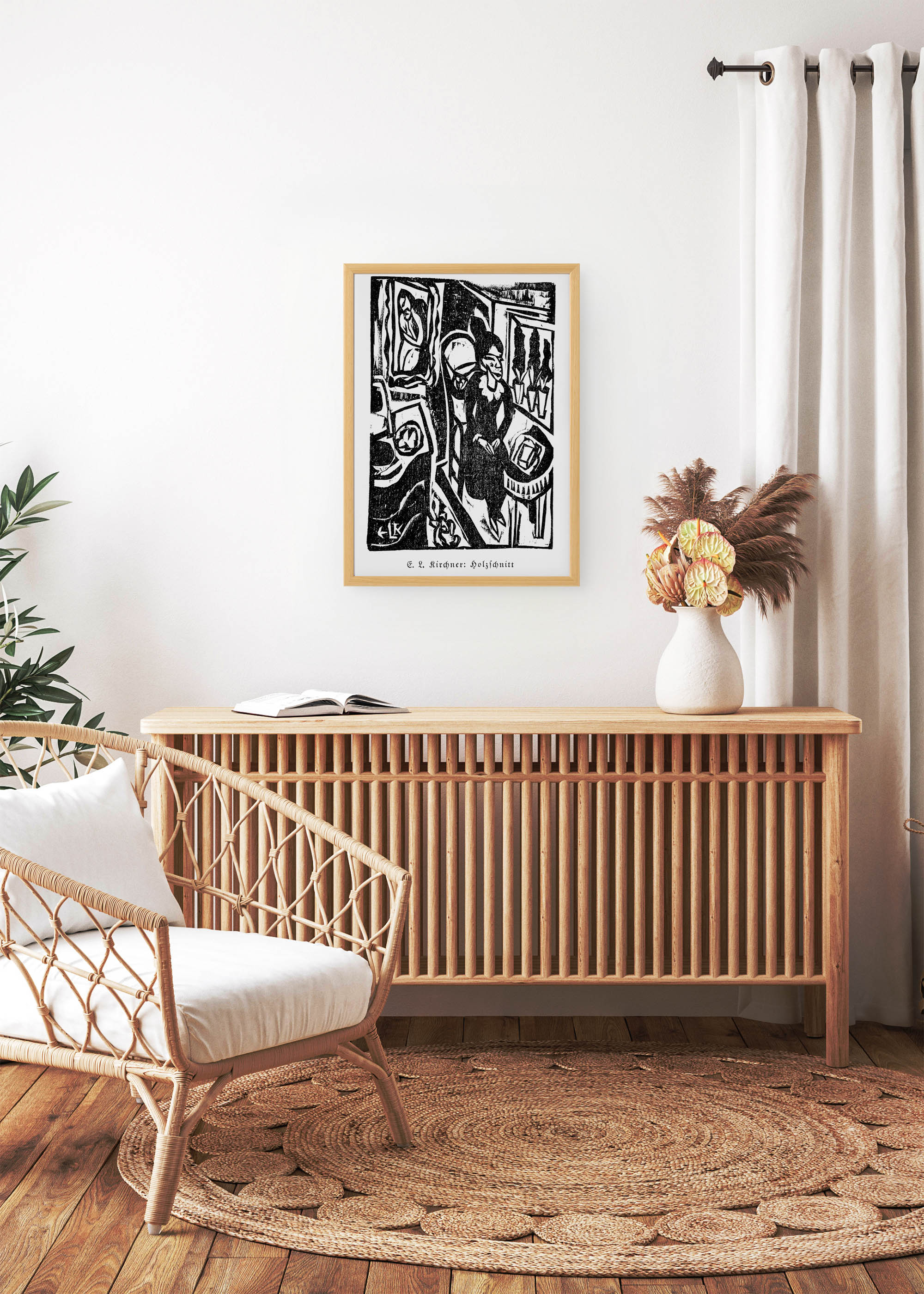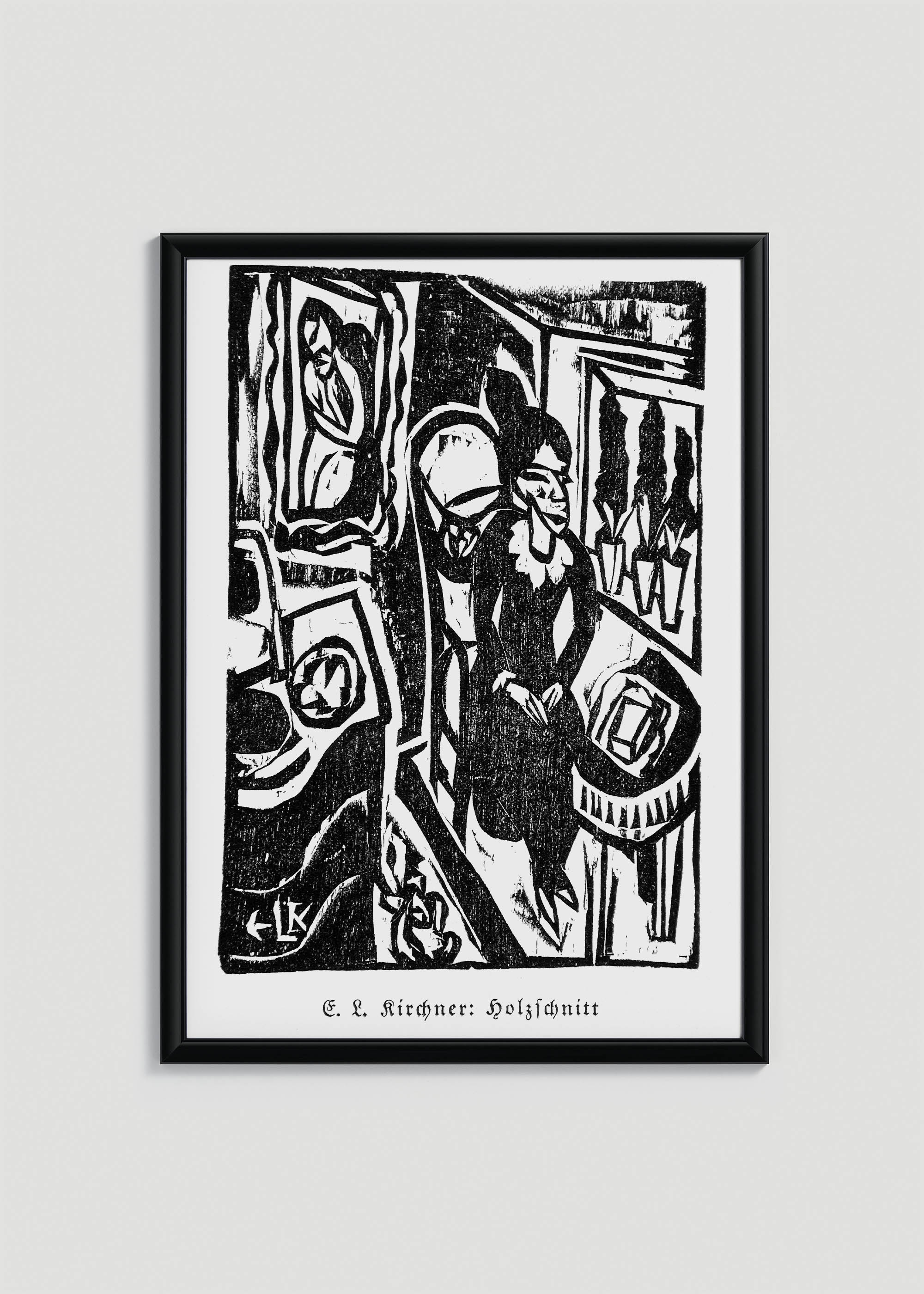 To intrygujące dzieło prezentuje charakterystyczną dla Kirchnera technikę drzeworytu, gdzie ostra kontrastowość czerni i bieli tworzy dramatyczną narrację wizualną. Kompozycja ukazuje postać w wnętrzu wypełnionym geometrycznymi formami i przedmiotami, wyrażając typową dla ekspresjonistów potrzebę uproszczenia formy do jej najistotniejszych elementów. Dominująca kolorystyka to klasyczna monochromia – głęboka czerń kadzi kontrastuje z czystą bielą papieru, tworząc niemal fotograficzną ostrość przekazu.