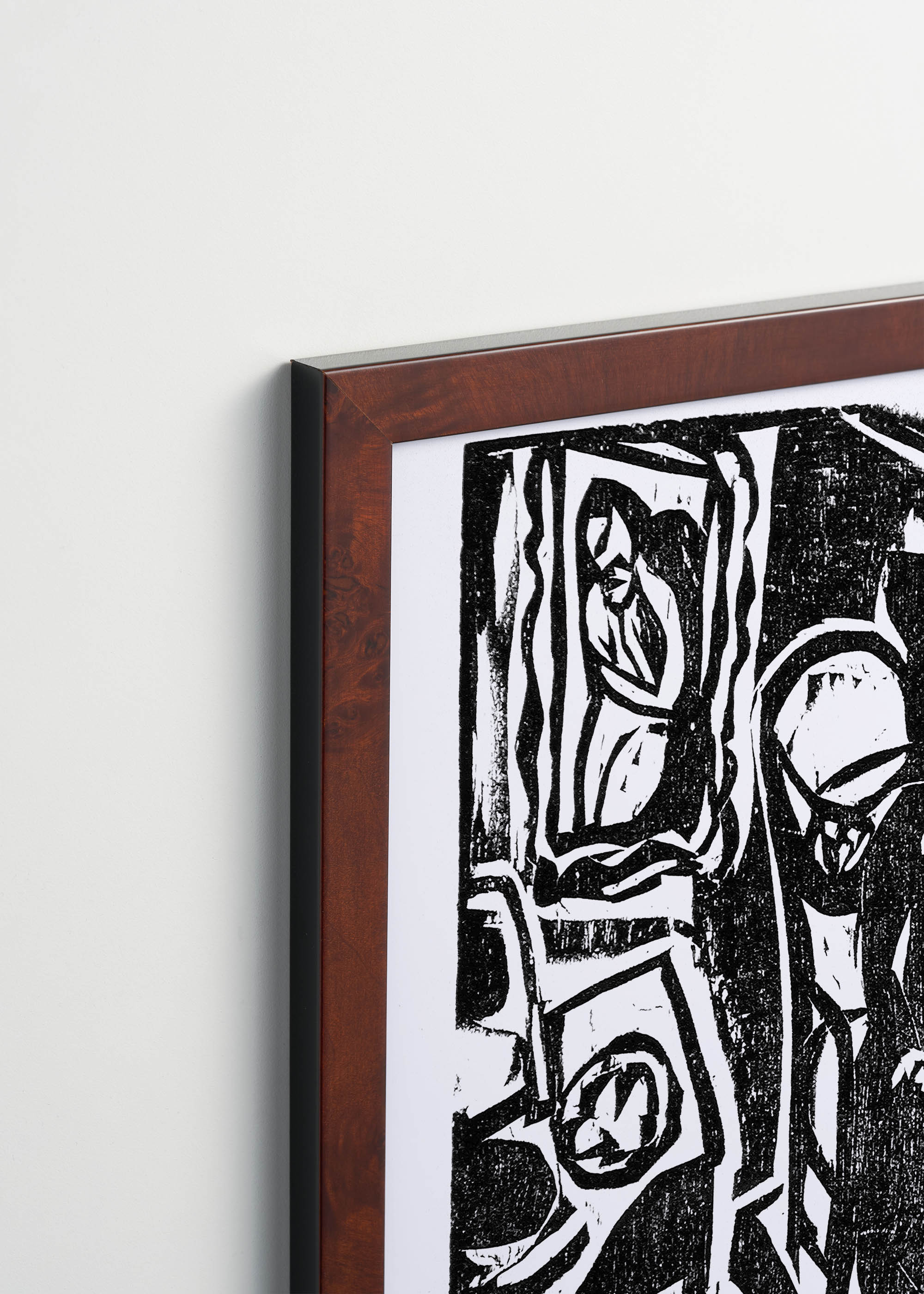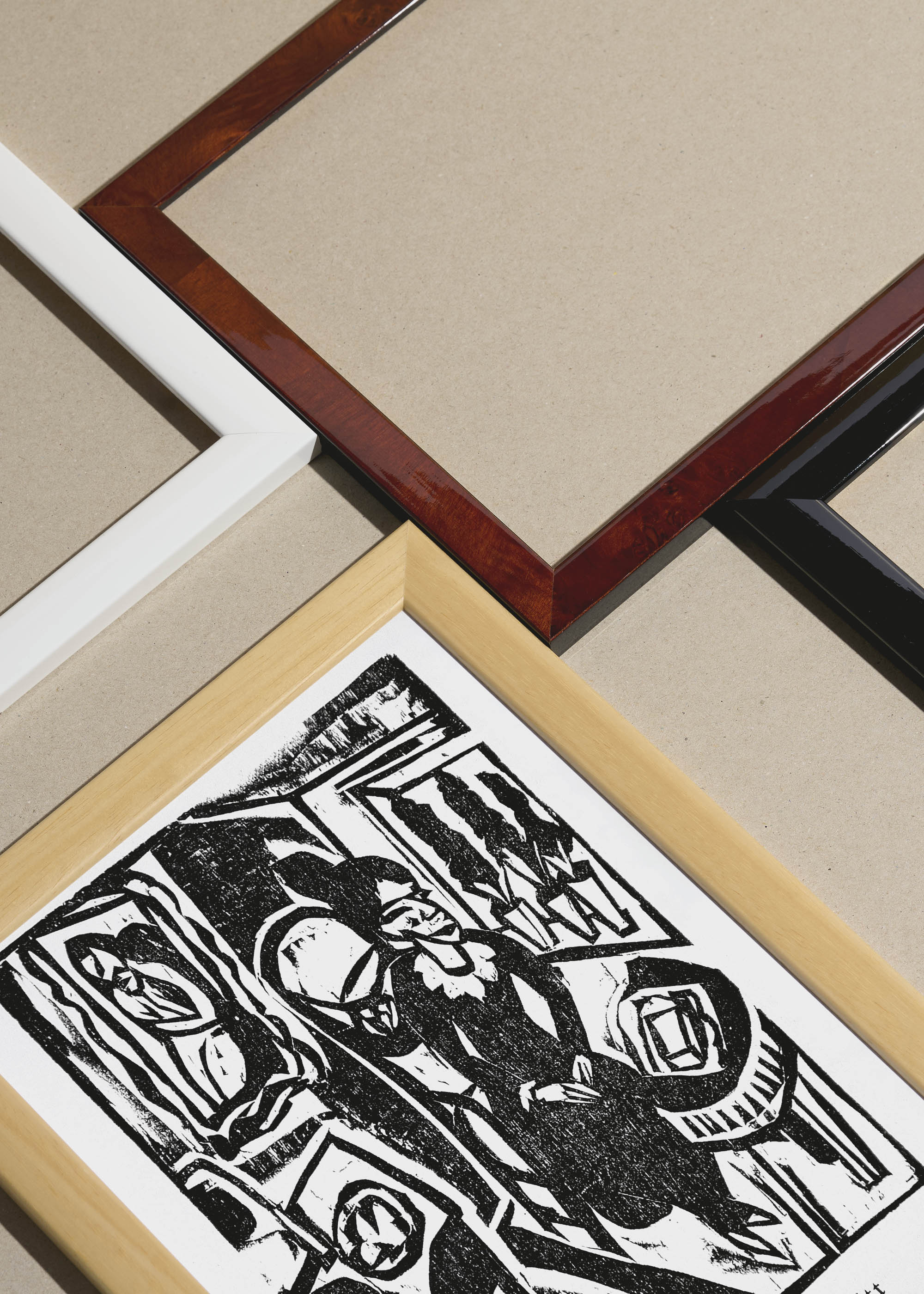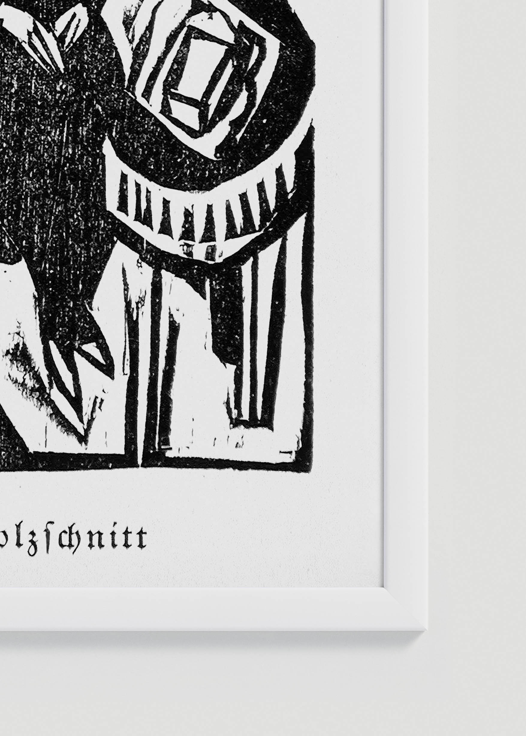 Plakat będący reprintem fascynującego drzeworytu (niemieckojęzyczna nazwa Holzschnitt widoczna jest na wzorze) pod tytułem „Kanoniczka przy stole do szycia” z 1912 r. autorstwa Ernsta Ludwiga Kirchnera. Kirchner, jeden z najbardziej wpływowych przedstawicieli niemieckiego ekspresjonizmu, współzałożyciel słynnej grupy artystycznej Die Brücke, tworzył swoje dzieła w burzliwych czasach początku XX wieku, gdy sztuka przeżywała rewolucyjną metamorfozę.