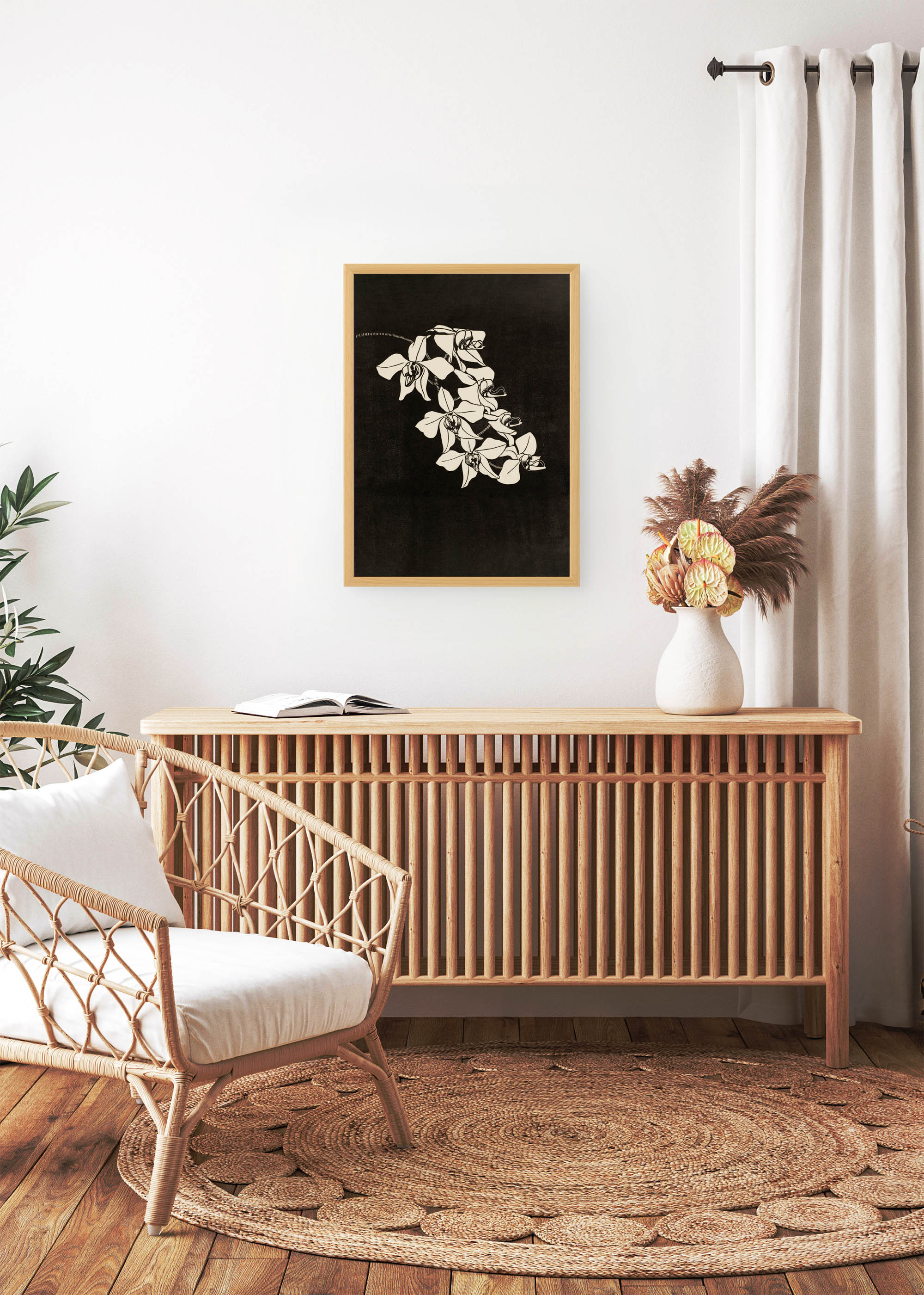 Wzór prezentuje delikatny pęd orchidei, wykonany w klasycznej technice czarno-białej grafiki. Kwiaty o mięsistych, falujących płatkach wyłaniają się z głębokiej, aksamitnej czerni niczym porcelanowe rzeźby. Kolorystyka opiera się na absolutnym kontraście – soczystej czerni tła i kremowej bieli kwiatów, która miejscami przechodzi w delikatne odcienie kości słoniowej. Ta ascetyczna paleta barw podkreśla dramaturgię kompozycji i nadaje jej ponadczasowy charakter.