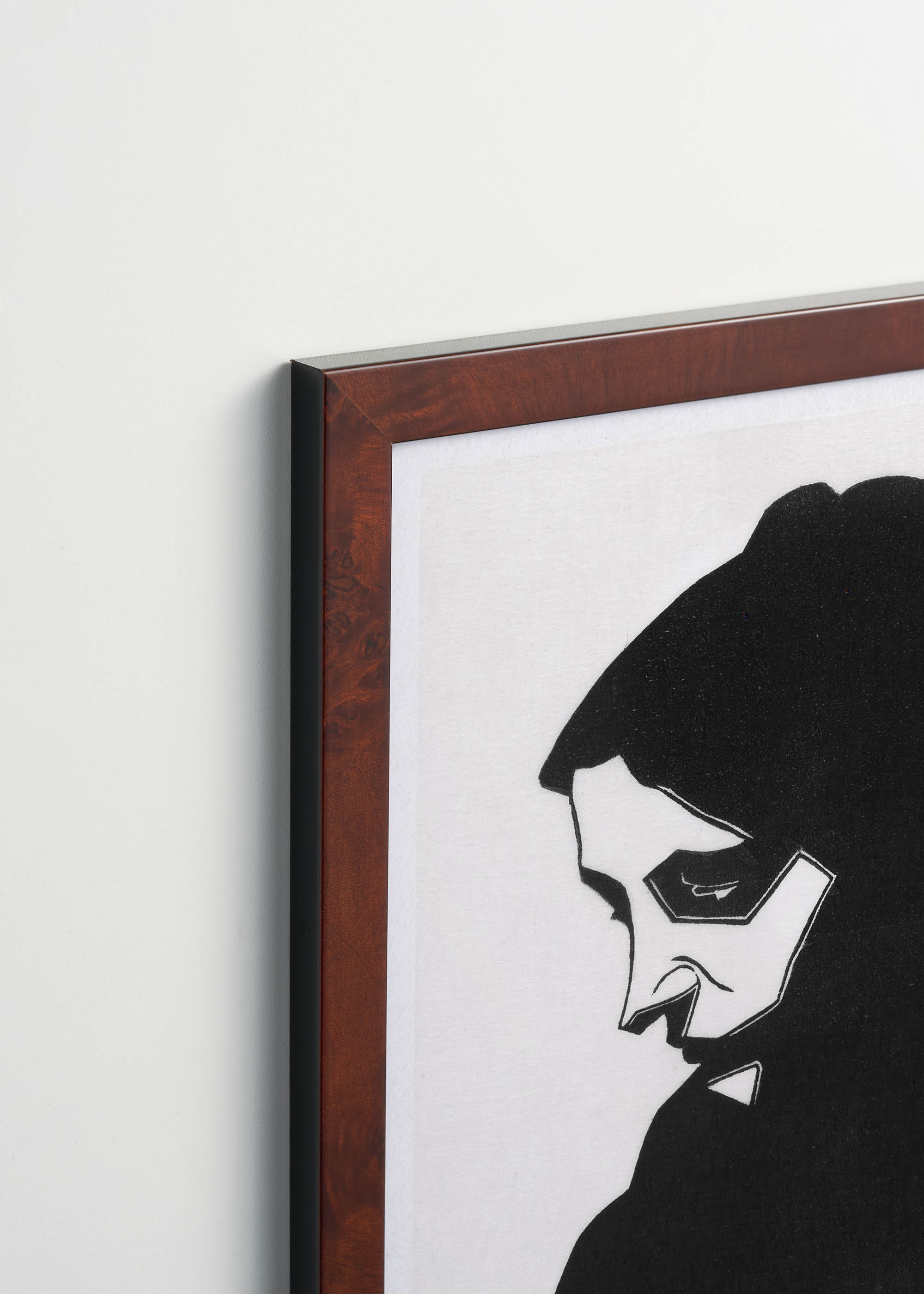 Kompozycja utrzymana jest w surowej palecie bieli i głębokiej czerni, charakterystycznych dla drzeworytu. Ta bezkompromisowa kolorystyka, pozbawiona półtonów, nadaje całości dramatyczny, niemal teatralny charakter. Biały relief twarzy kontrastuje z intensywną czernią włosów i ubrania, tworząc kompozycję o niezwykłej sile wyrazu.