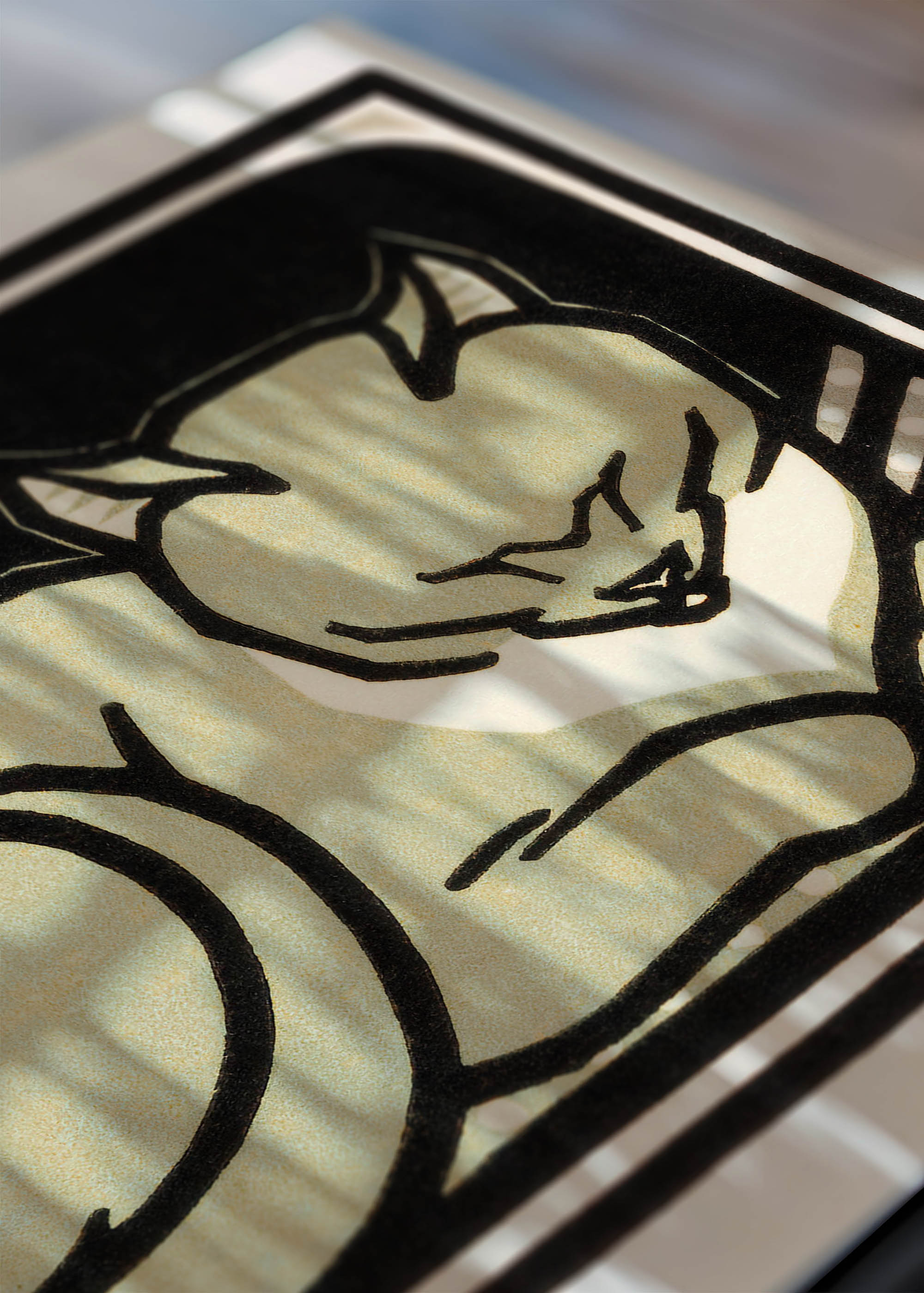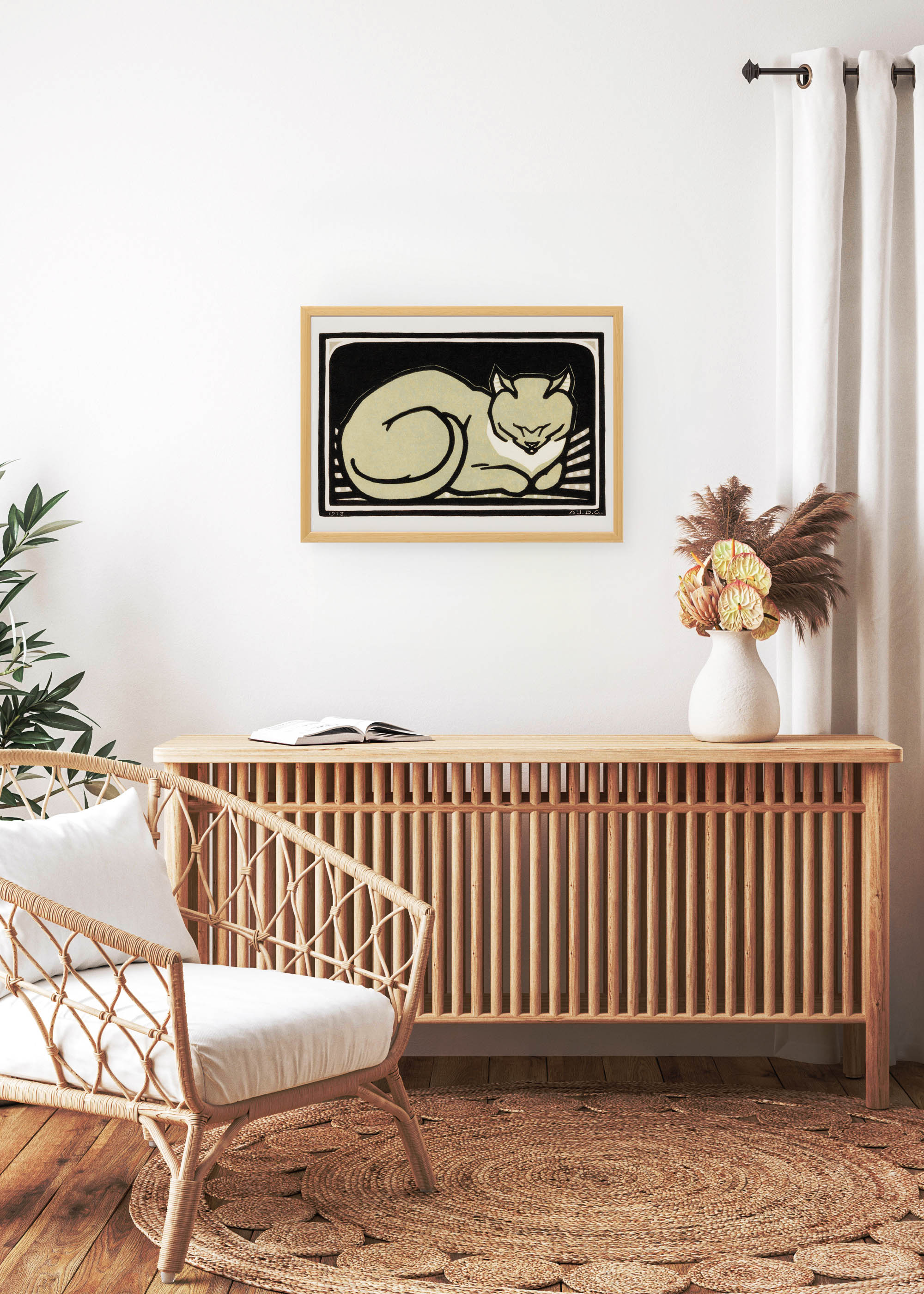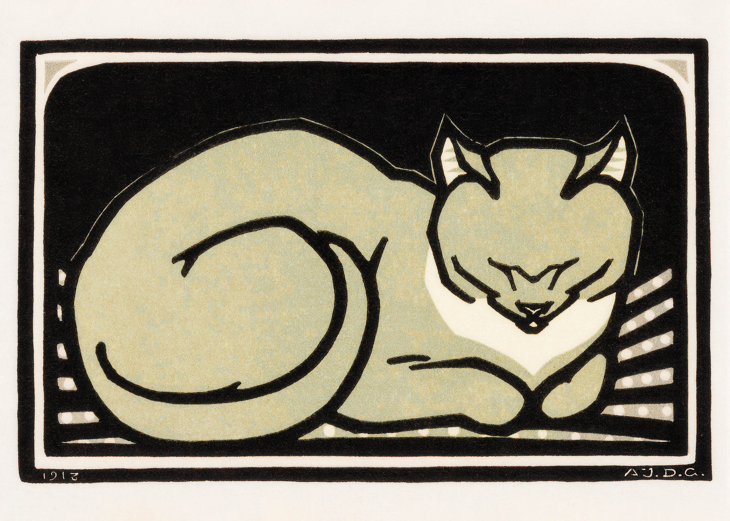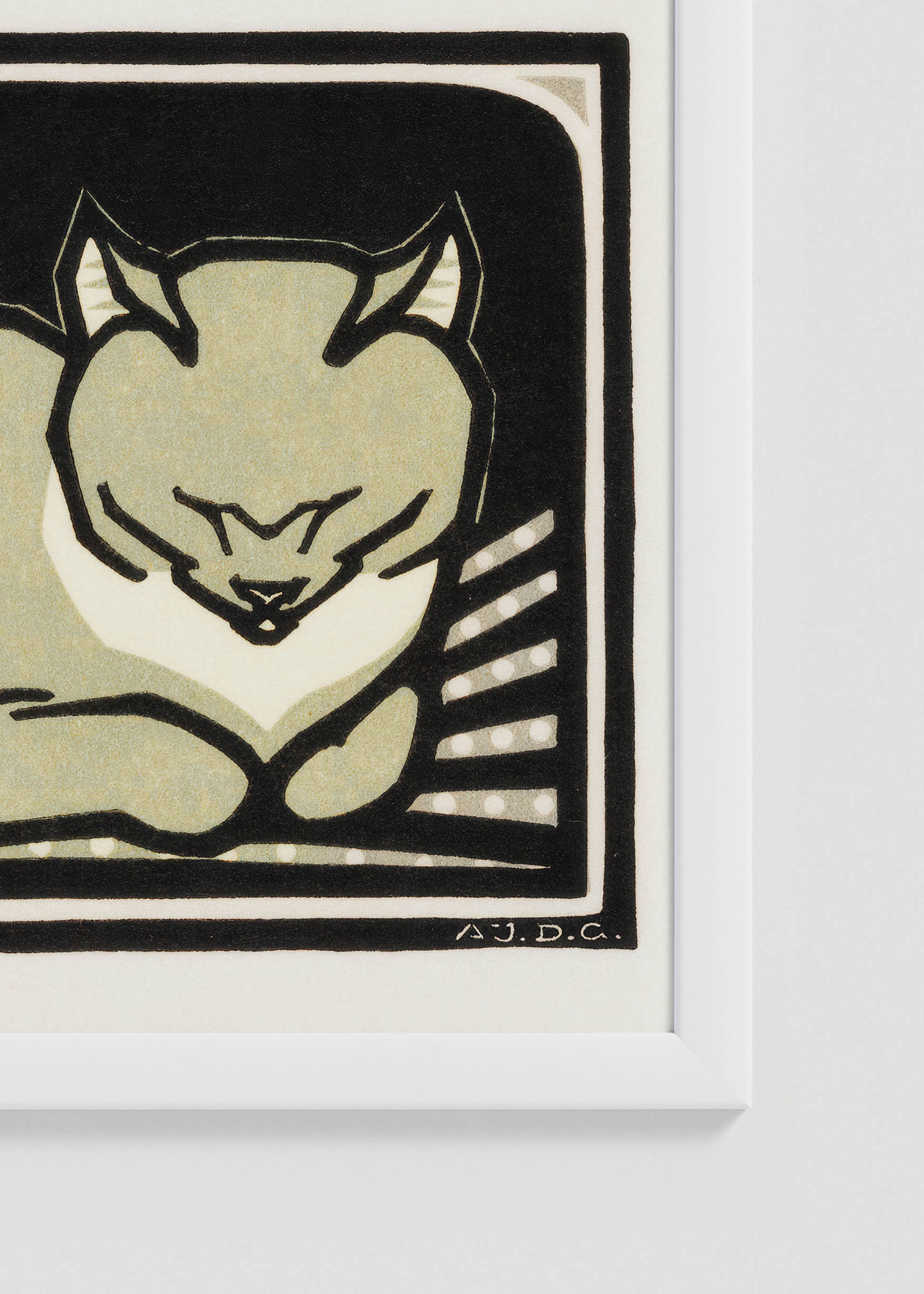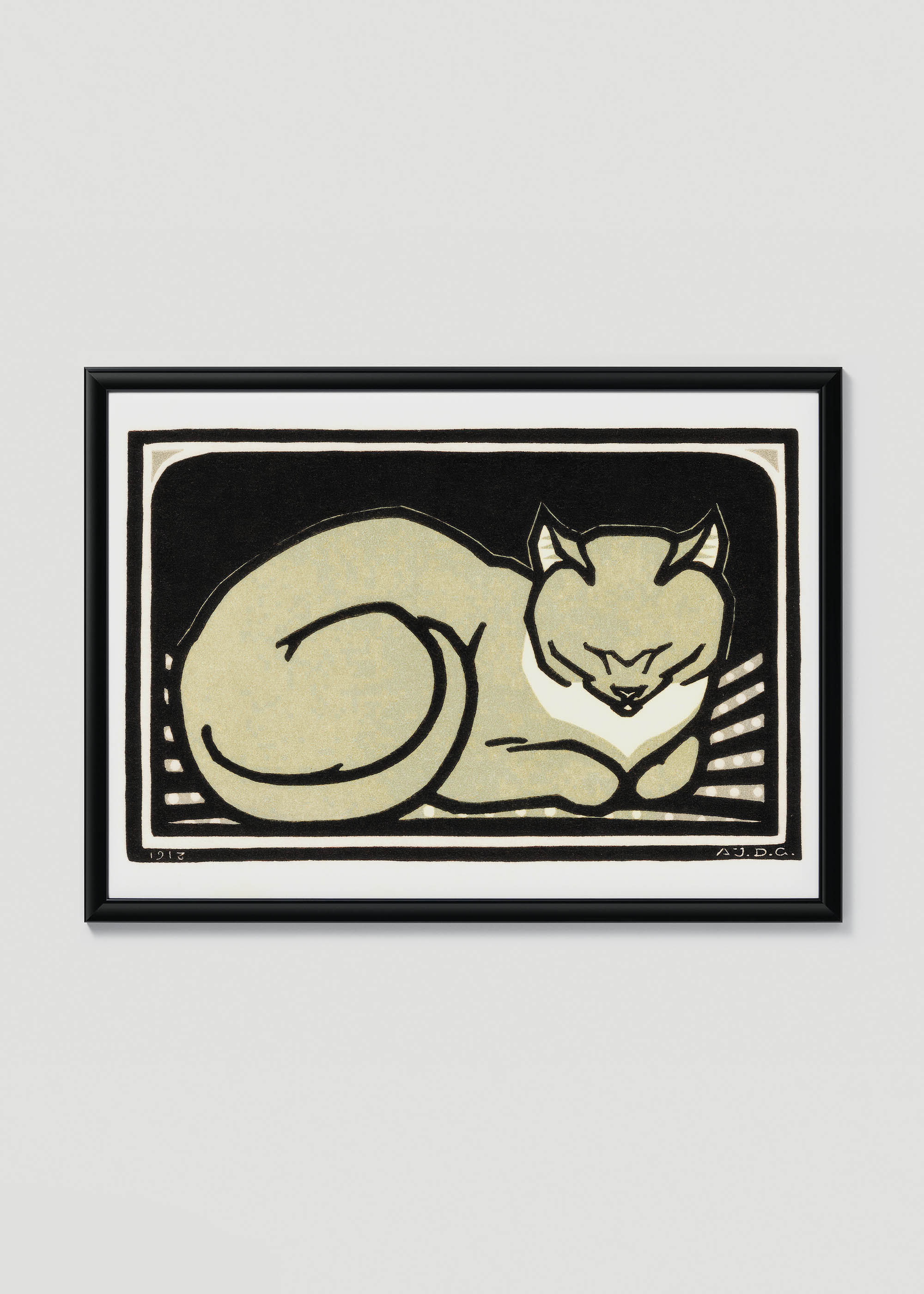 Ten wyjątkowy plakat przedstawiający śpiącego kota jest reprintem dzieła Julie de Graag z 1918 r. Przenosi nas tym samym w świat holenderskiego drzeworytu z początku XX wieku. Julie de Graag (1877-1924) była jedną z najbardziej utalentowanych artystek ruchu Arts and Crafts w Holandii, specjalizującą się w technikach graficznych o wyrafinowanej prostocie. Jej prace charakteryzowały się mistrzowskim wykorzystaniem kontrastów i delikatną obserwacją świata zwierząt.