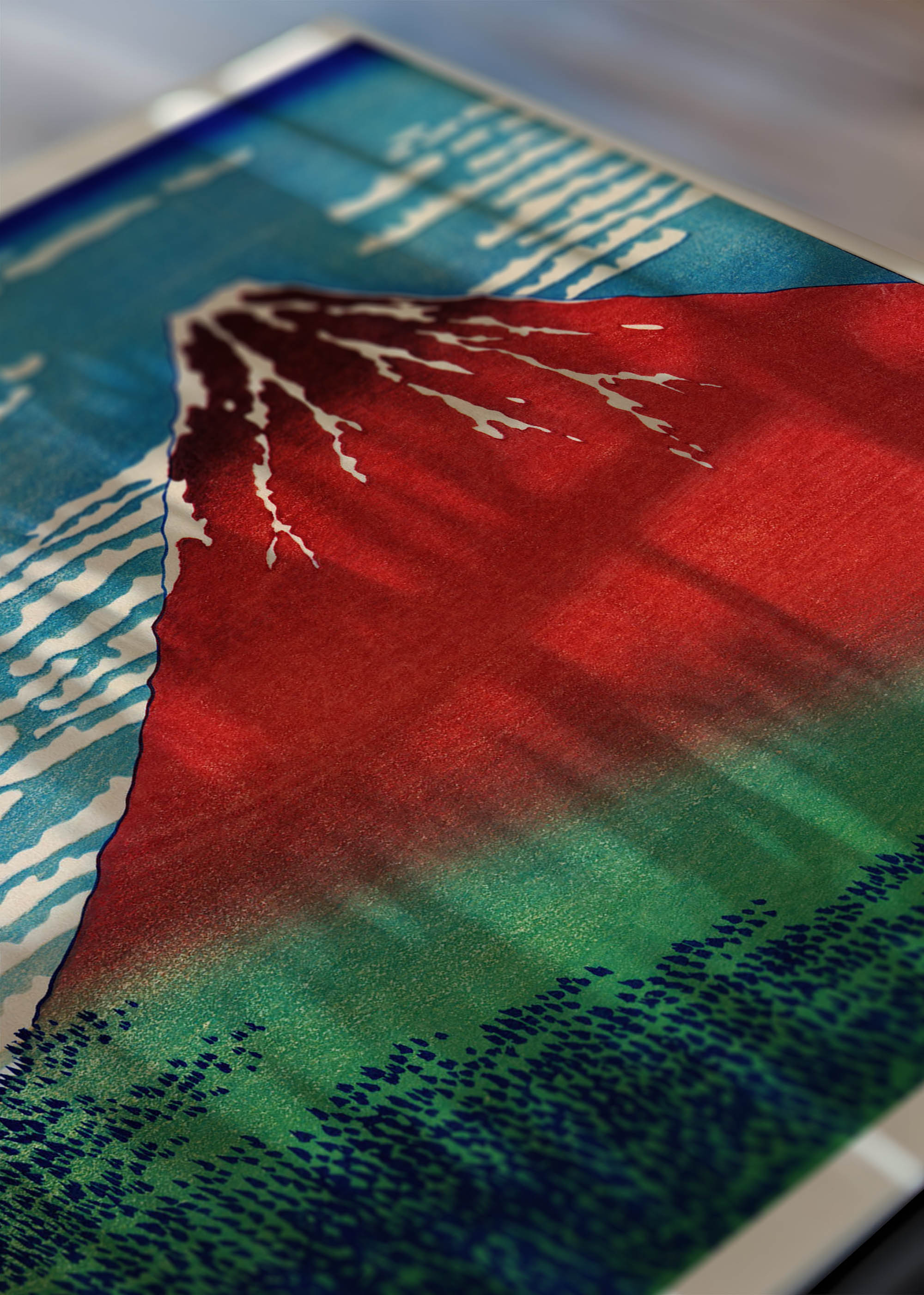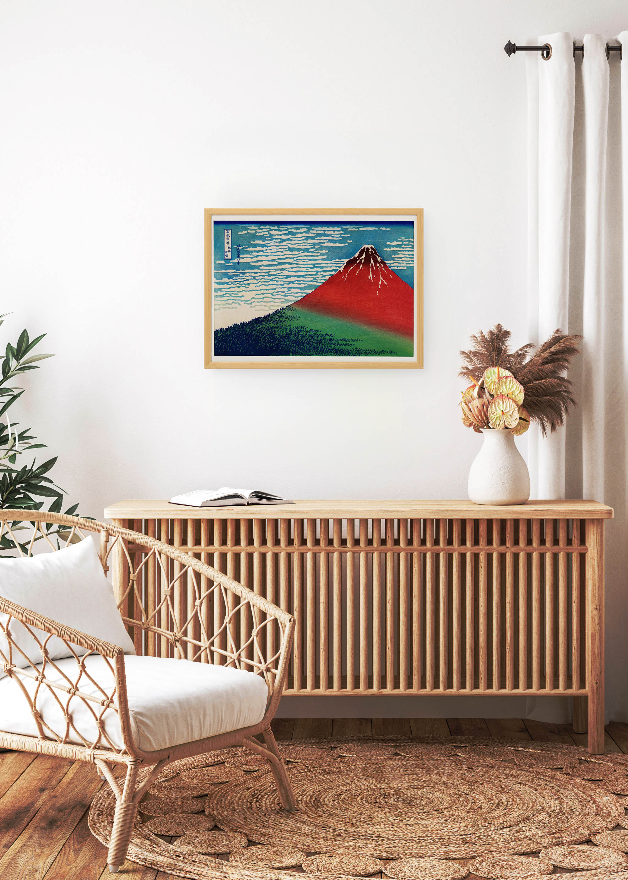 Czerwony Fuji symbolizuje w japońskiej kulturze pomyślność i długowieczność, dlatego ten plakat będący reprintem wzoru Hokusaia wniesie do Twojego wnętrza nie tylko estetyczne walory, ale także pozytywną energię i harmonię charakterystyczną dla filozofii zen.