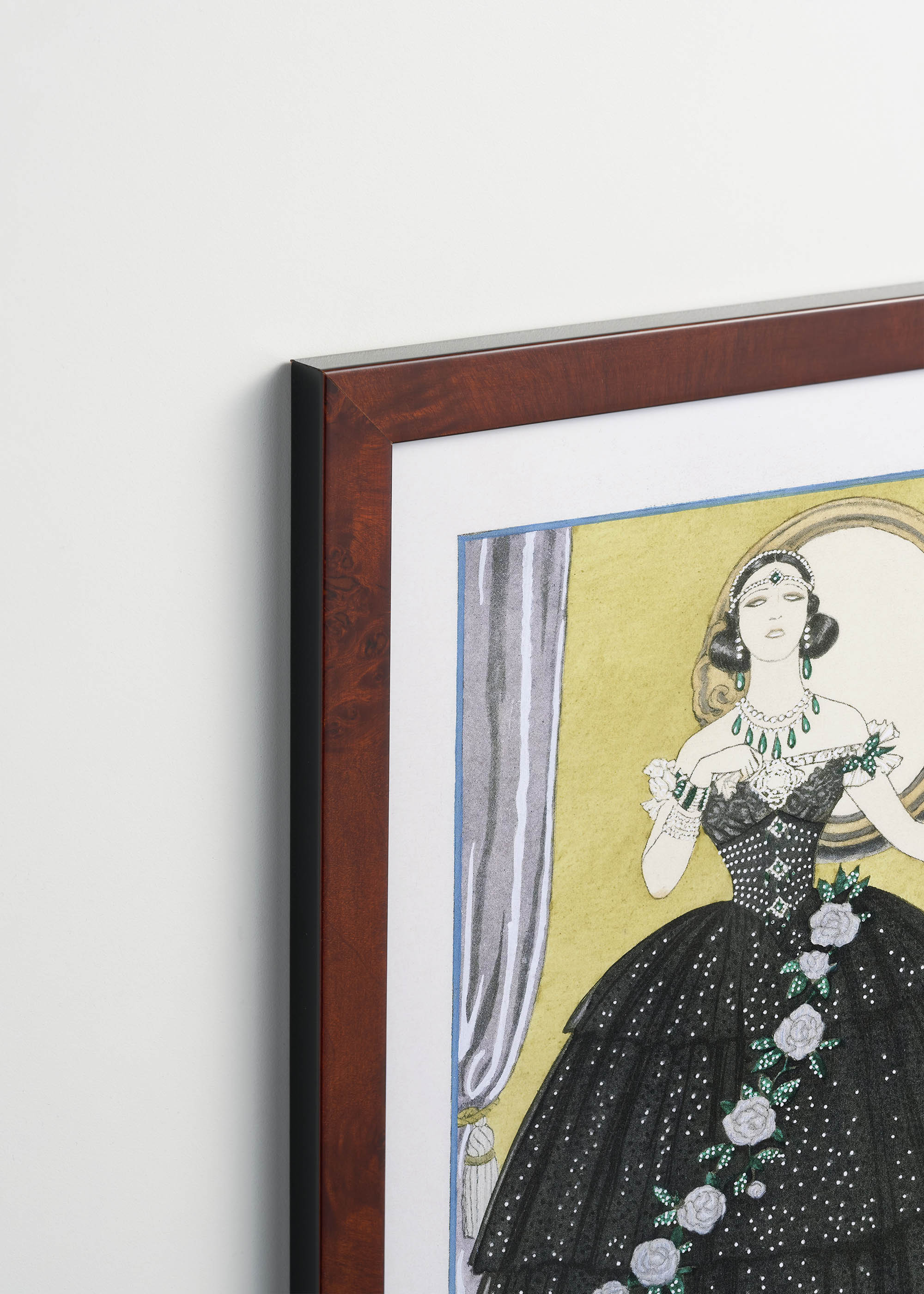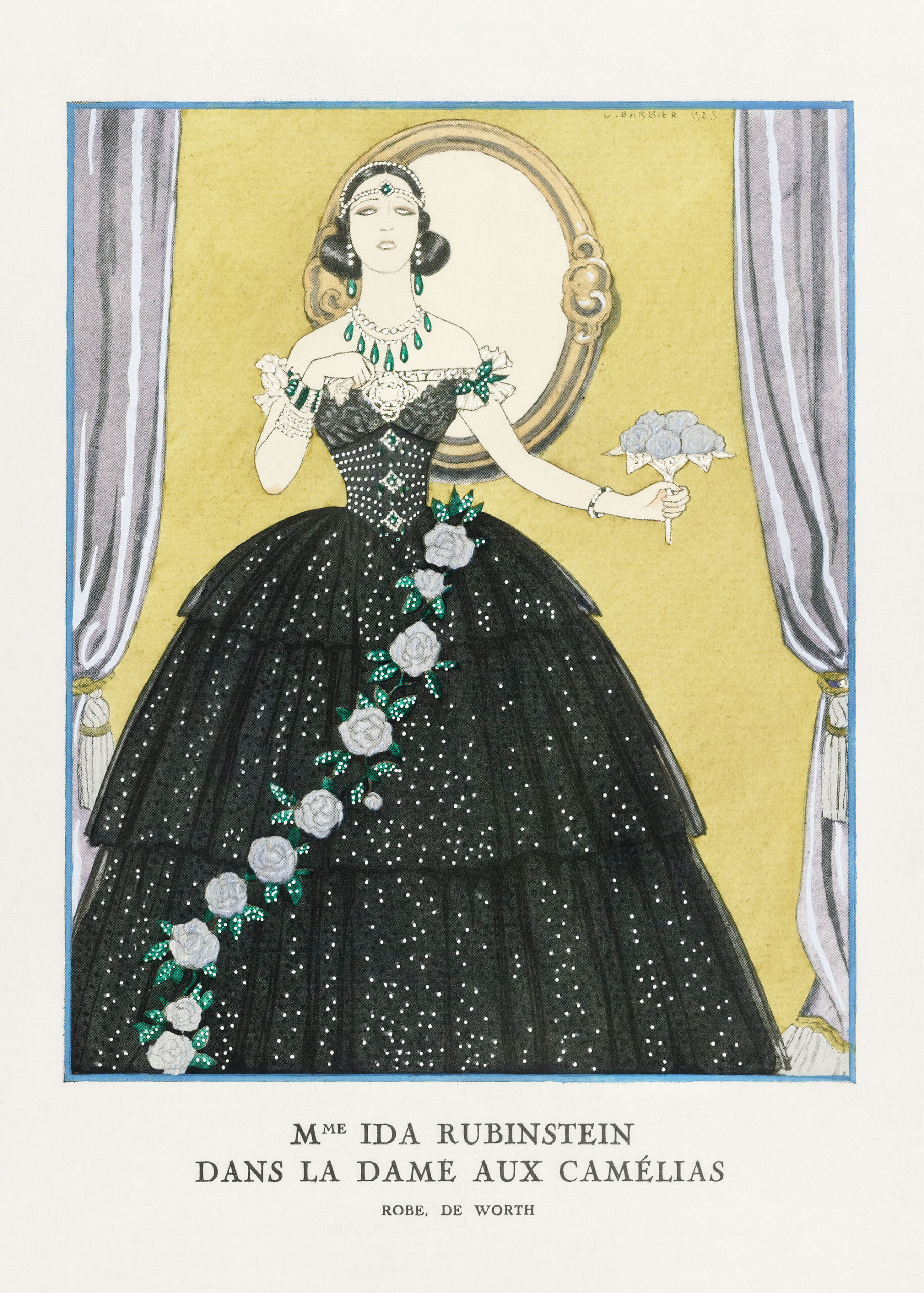 Barbier mistrzowsko ukazał dramatyzm postaci – od alabastrowej cery bohaterki, przez jej melancholijne spojrzenie, po teatralny gest dłoni trzymającej bukiet kamelii. To więcej niż ilustracja – to hołd złożony sztuce scenicznej i haute couture początku XX wieku.