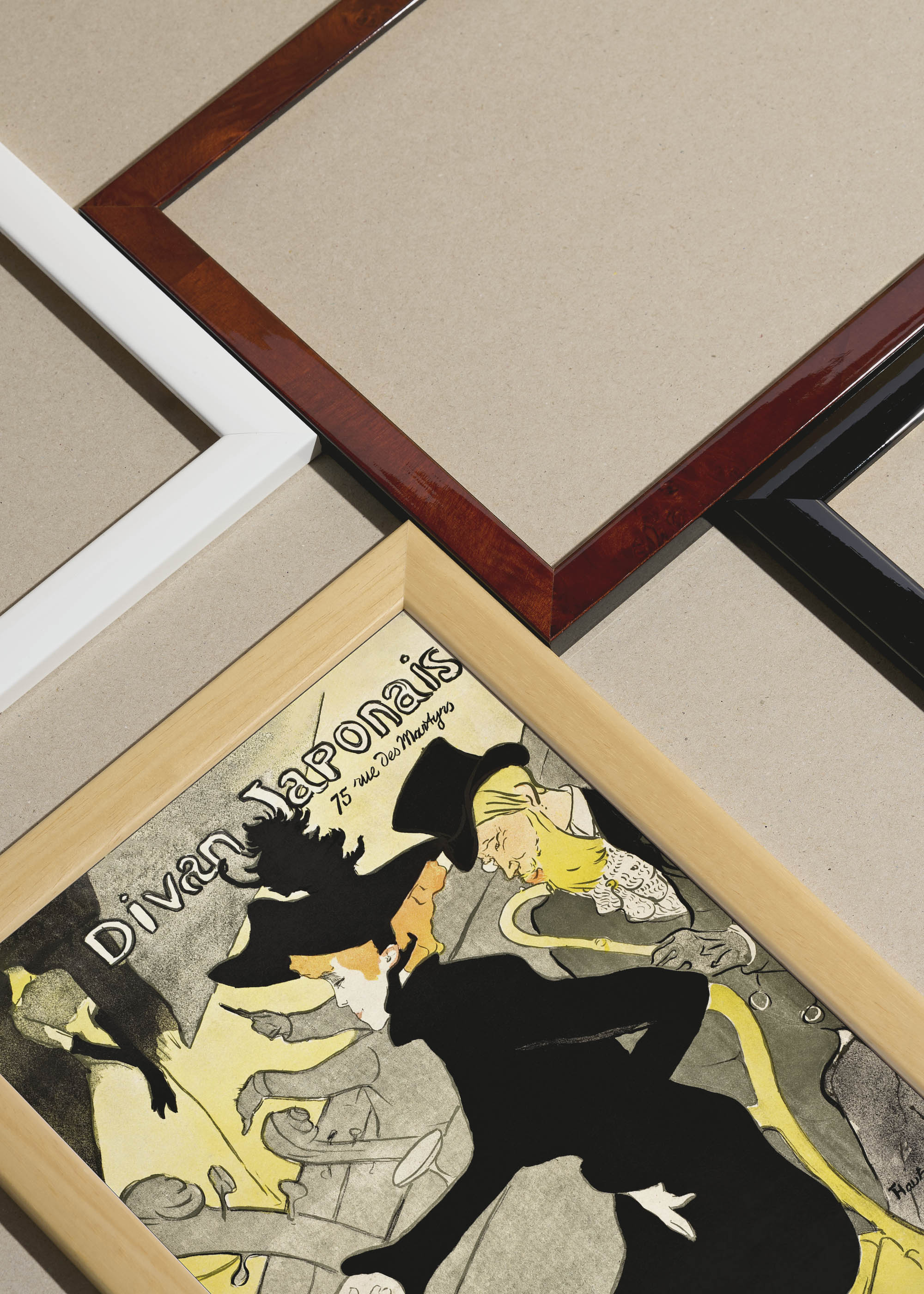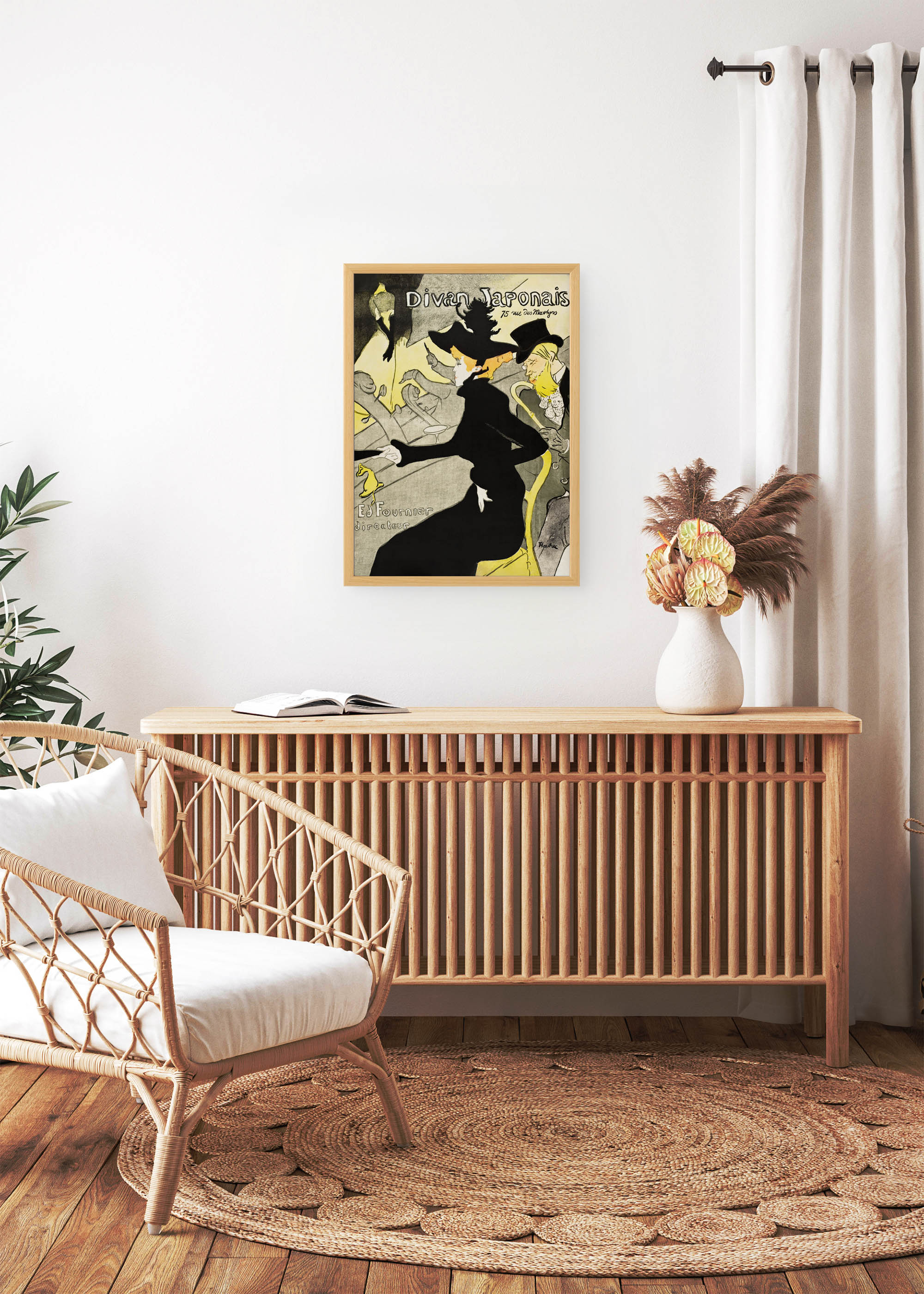 Plakat „Divan Japonais” Henri de Toulouse-Lautreca to prawdziwa perła paryskiej belle époque! To kultowe dzieło powstało w 1893 roku jako reklama kabaretu o tej samej nazwie, mieszczącego się przy rue des Martyrs w Paryżu. Toulouse-Lautrec, arystokrata z wyboru mieszkający w dzielnicy Montmartre, stworzył tę litografię w okresie swojej fascynacji nocnym życiem stolicy Francji. Ciekawostką jest, że postać w czerni to słynna tancerka Jane Avril, jedna z ulubionych modelek artysty, której charakterystyczna sylwetka stała się symbolem epoki.