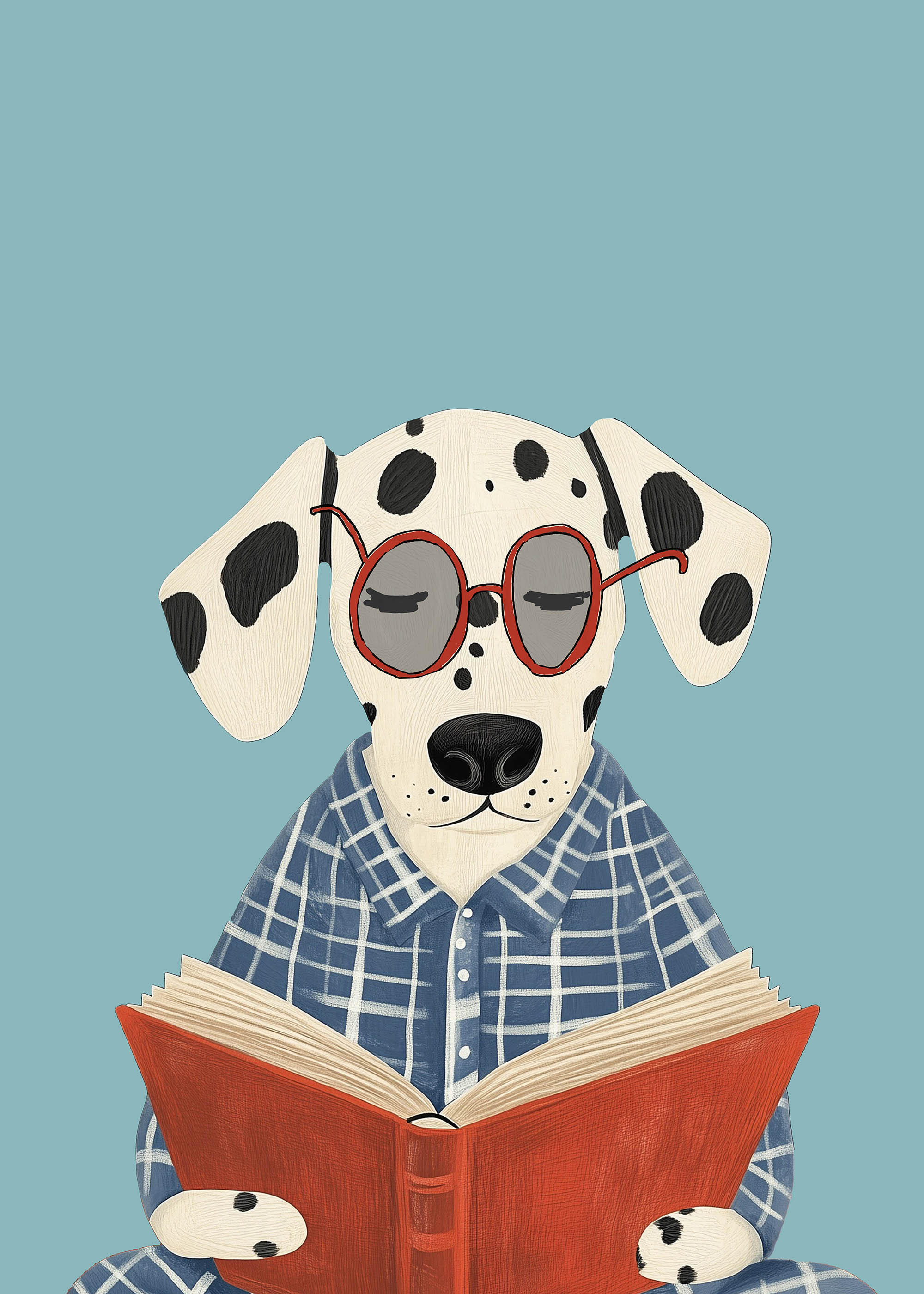 Ten urzekający plakat przedstawia spokojnego dalmatyńczyka w okularach, pochłoniętego lekturą czerwonej książki. Nasz czworonożny intelektualista ubrany jest w błękitną koszulę w kratę, co nadaje mu uroczego, przytulnego charakteru. Kompozycja emanuje spokojem i mądrością, idealnie wpasowując się w filozofię rozwijania u dzieci miłości do czytania i nauki.