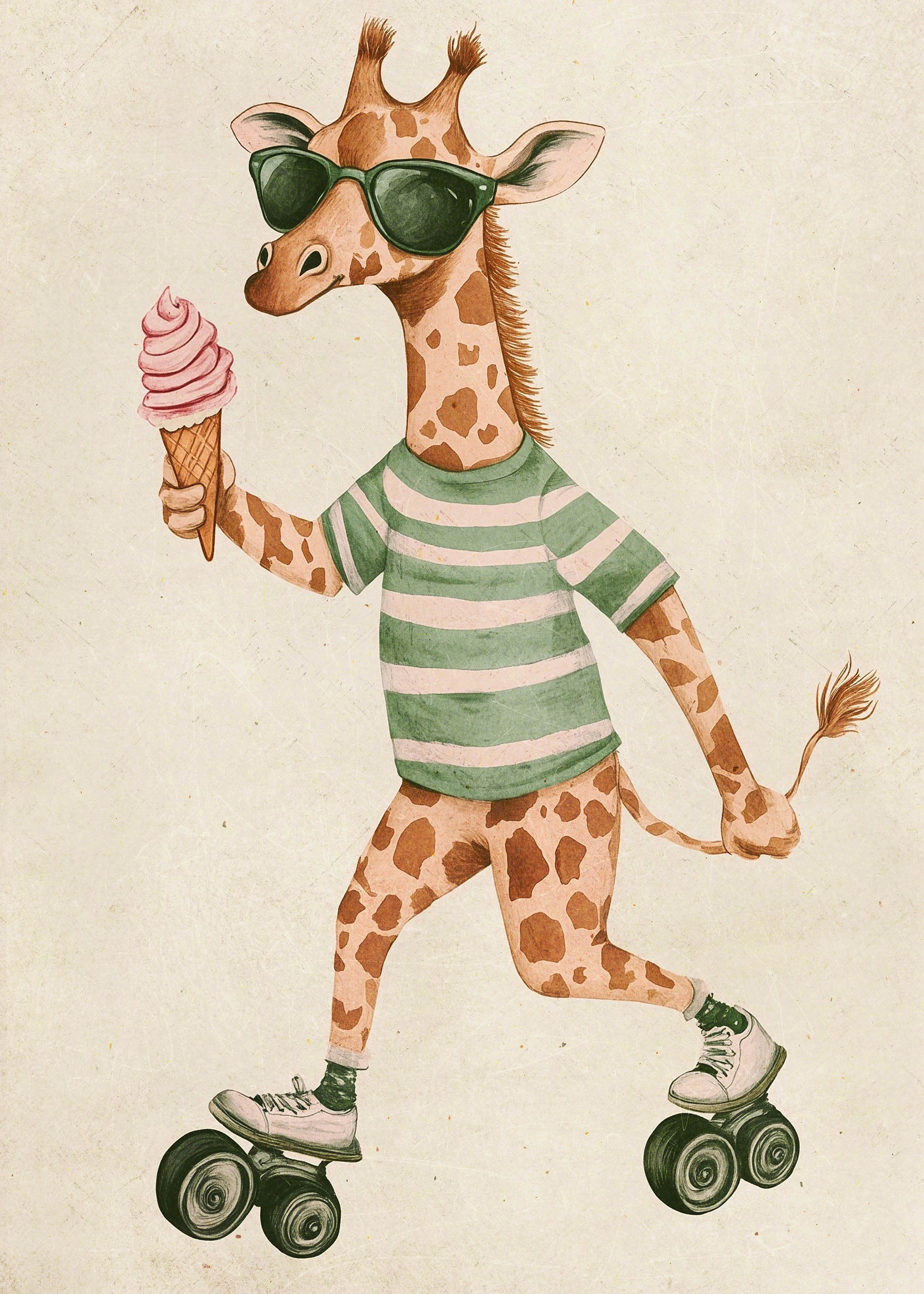 Ten wyjątkowy plakat z żyrafą na rolkach to prawdziwy strzał w dziesiątkę dla każdego dziecięcego wnętrza! Sympatyczna żyrafa w retro okularach przeciwsłonecznych i pasiastej koszulce emanuje niesamowitą energią i radością życia. Trzymając w łapie różowy rożek lodów, mknie na klasycznych wrotkach, jakby właśnie wyruszyła na letni spacer po mieście.