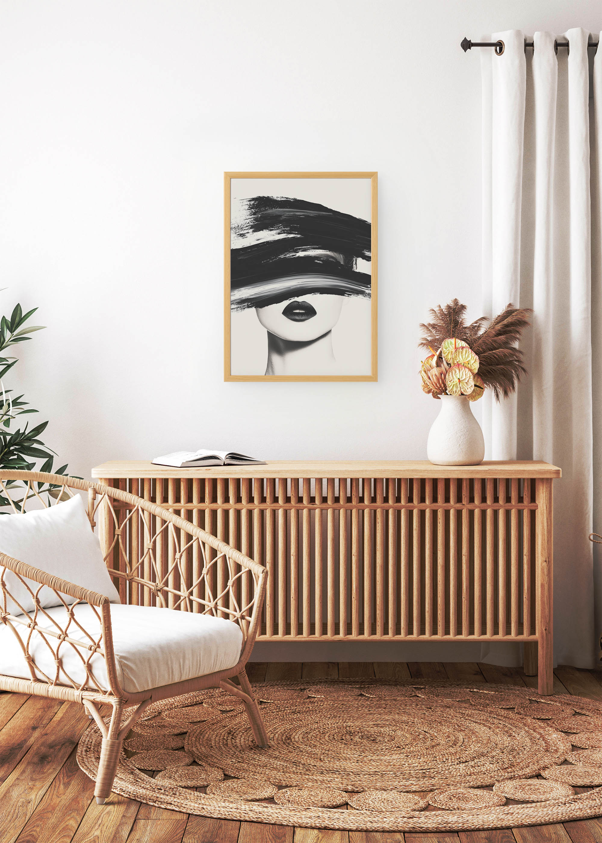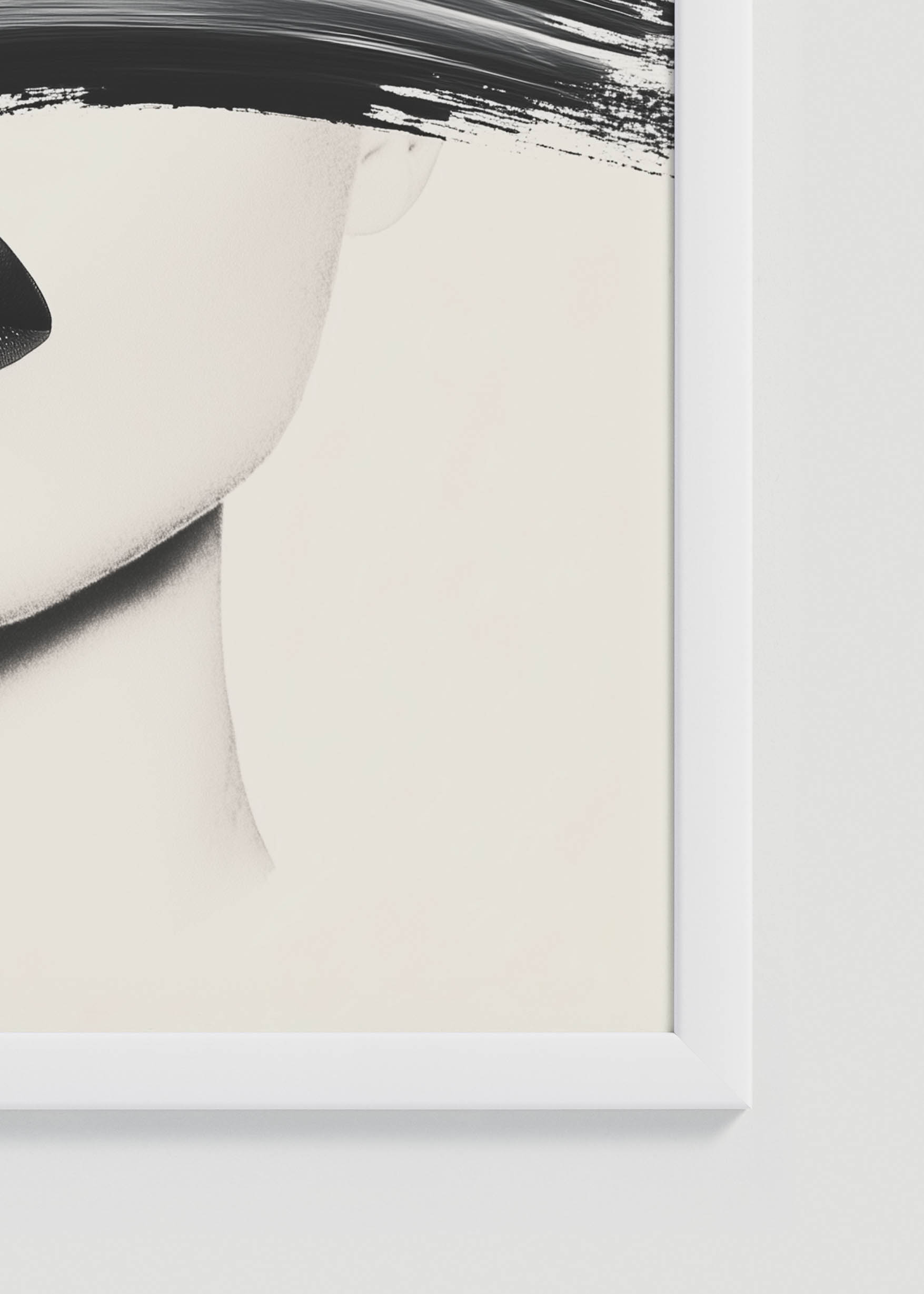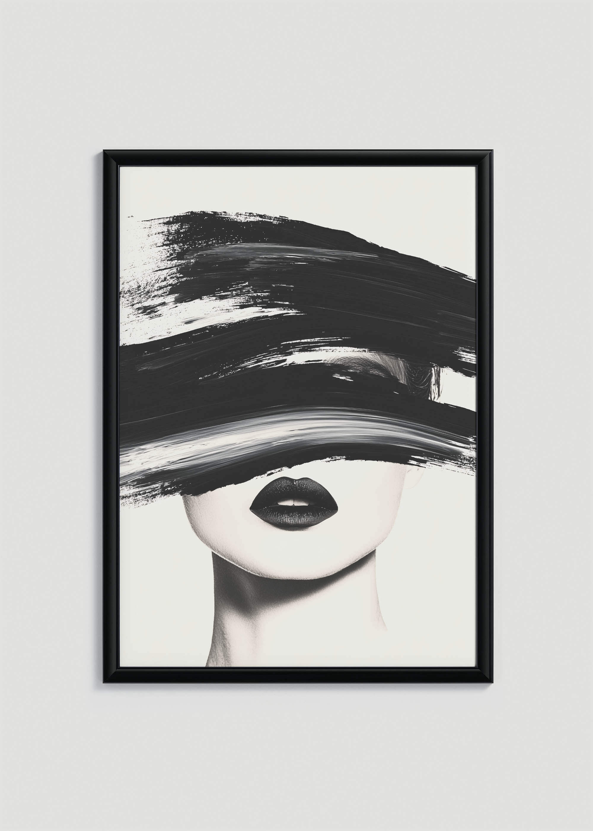 Minimalistyczny plakat w czarno-białej kolorystyce przedstawiający zamyślony, abstrakcyjny portret kobiety. Duże, wyraziste usta i intrygujące spojrzenie przykuwają uwagę. Stylizowany na modny nurt pop-artu lat 60-tych. Oryginalny dodatek do nowoczesnych wnętrz.