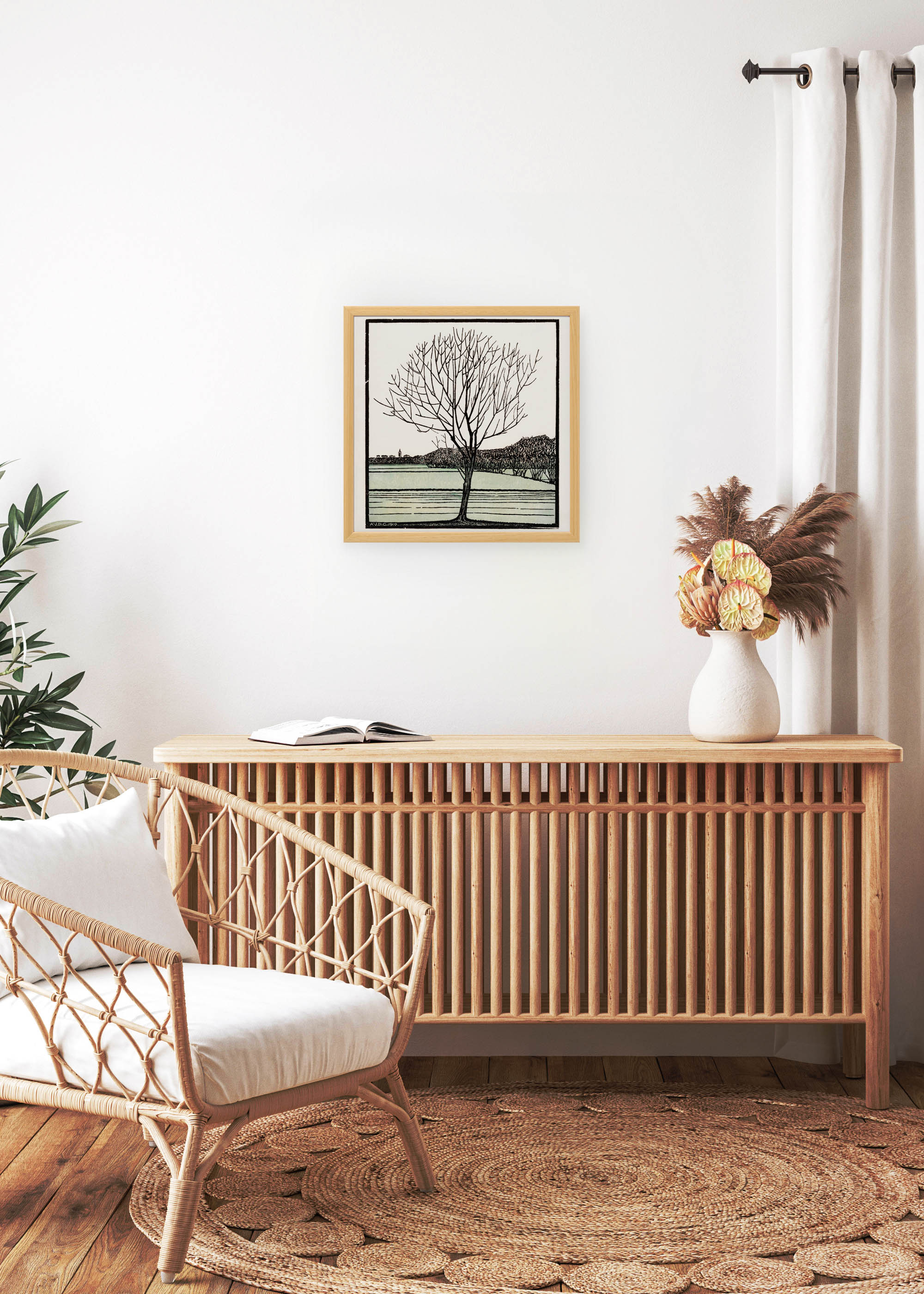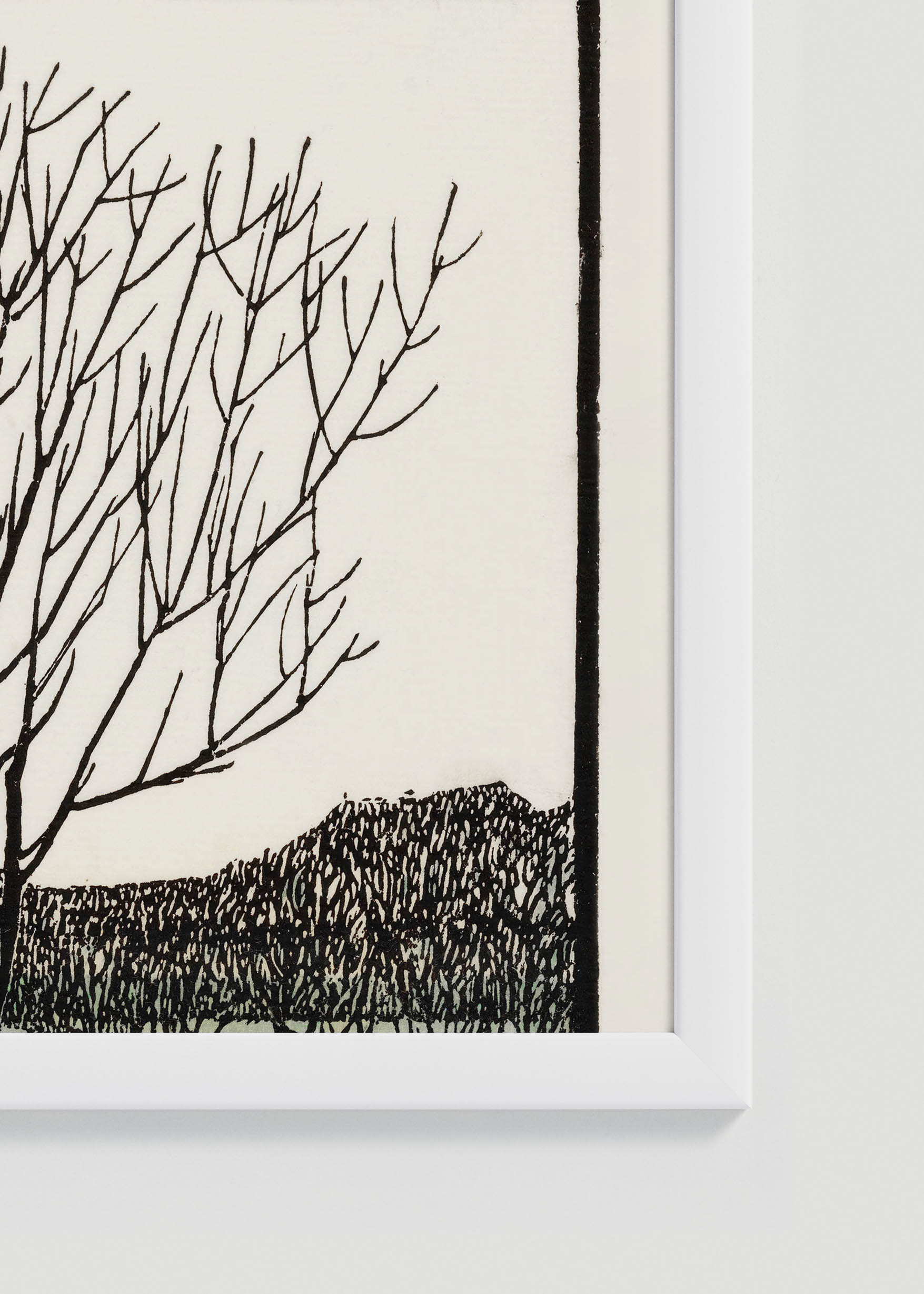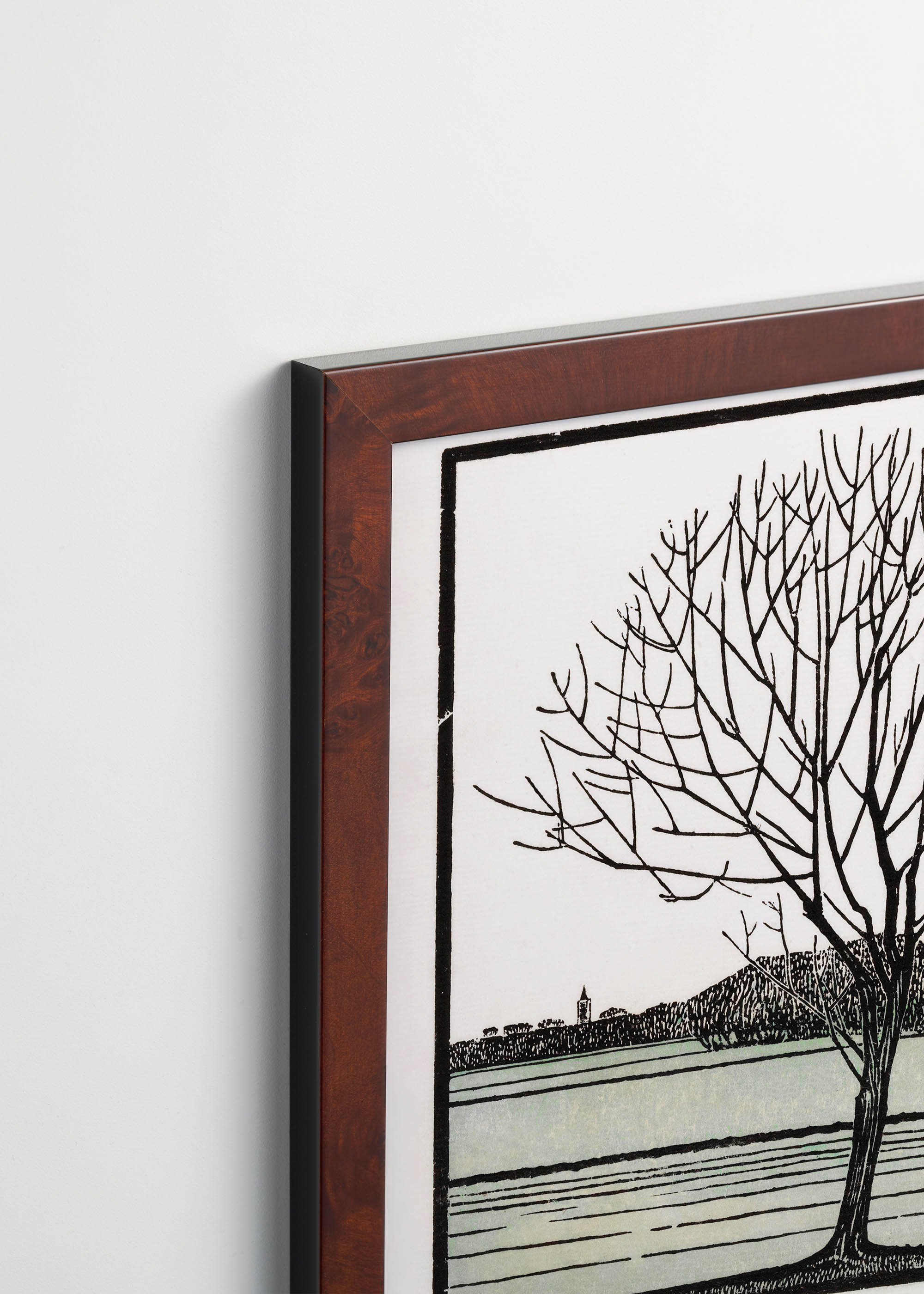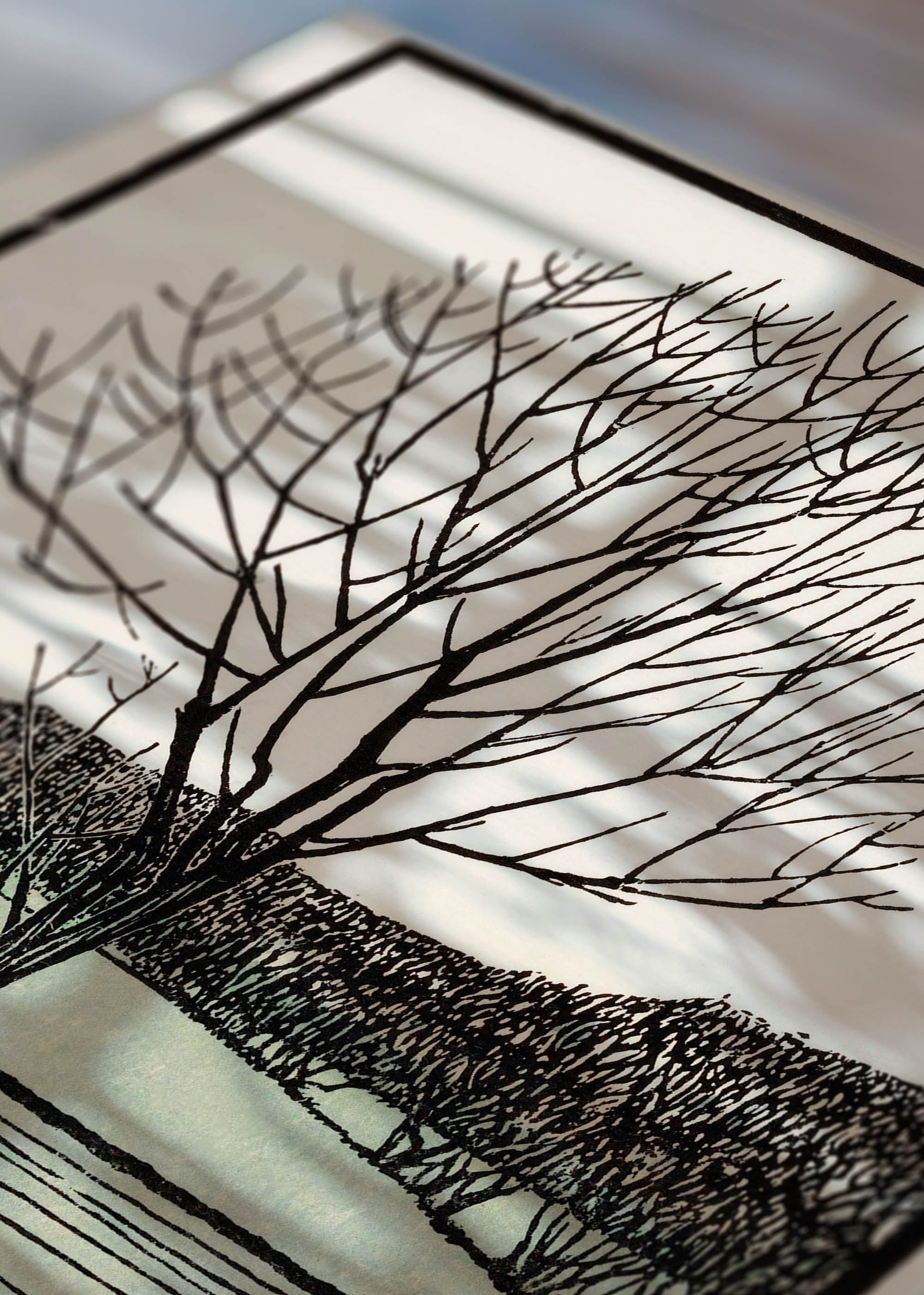 Kompozycja urzeka swoją kontemplacyjną prostotą – samotne drzewo bez liści dominuje nad spokojną taflą wody, w tle zarysowują się delikatnie pagórki i zabudowania. Kolorystyka utrzymana jest w stonowanych barwach ziemi: beże, szarości i subtelna mięta tworzą harmonijną paletę, która emanuje spokojem nordyckiej scenerii zimowej. Charakterystyczna dla autorki technika drzeworytu nadaje całości wyrazistego, graficznego charakteru.
