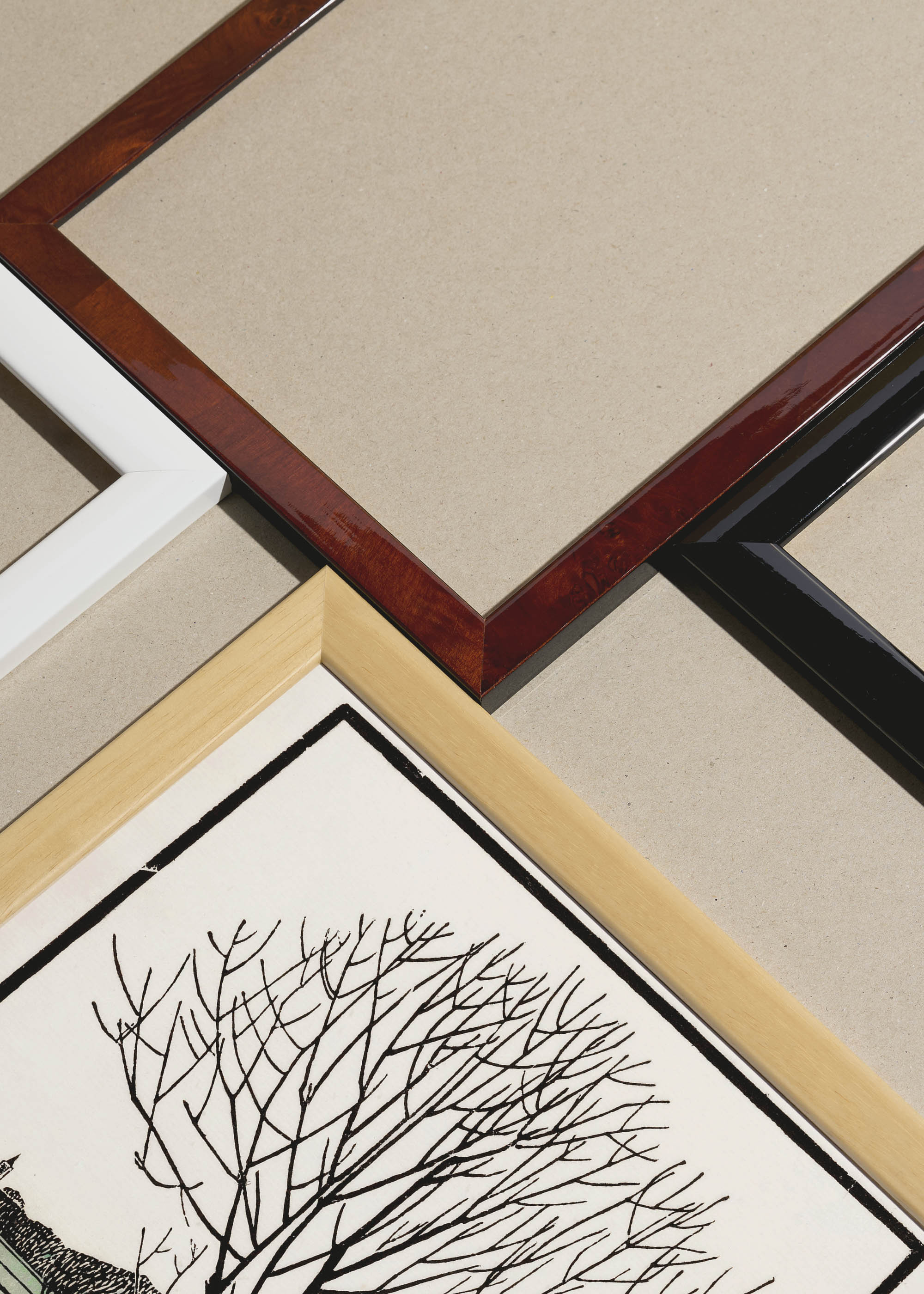 Packshot ramek Plakatello® wykonanych z włoskich i polskich listew ramiarskich. Ramy tworzone ręcznie w pracowni w Lublinie z wykorzystaniem tradycyjnych manualnych narzędzi. Każda rama jest indywidualnie wykańczana i kontrolowana przed wysyłką. Szeroka paleta kolorów pozwala dobrać idealną oprawę do plakatów i obrazów.