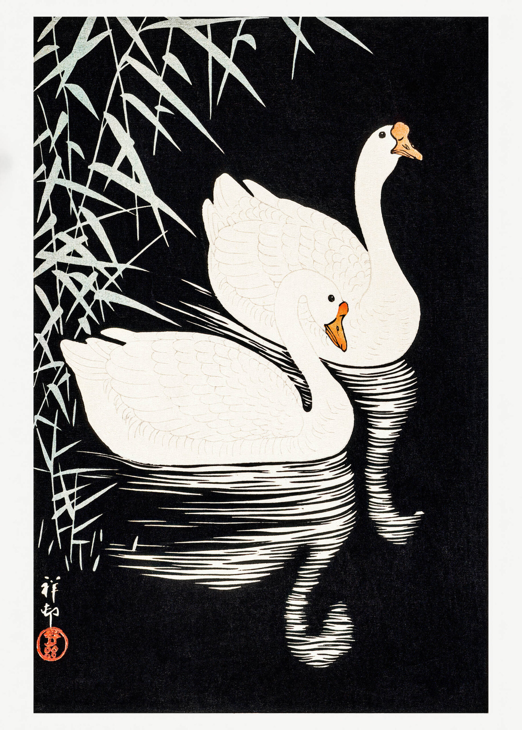 Plakat Dwa łabędzie Ohara Koson japoński czarno-biały