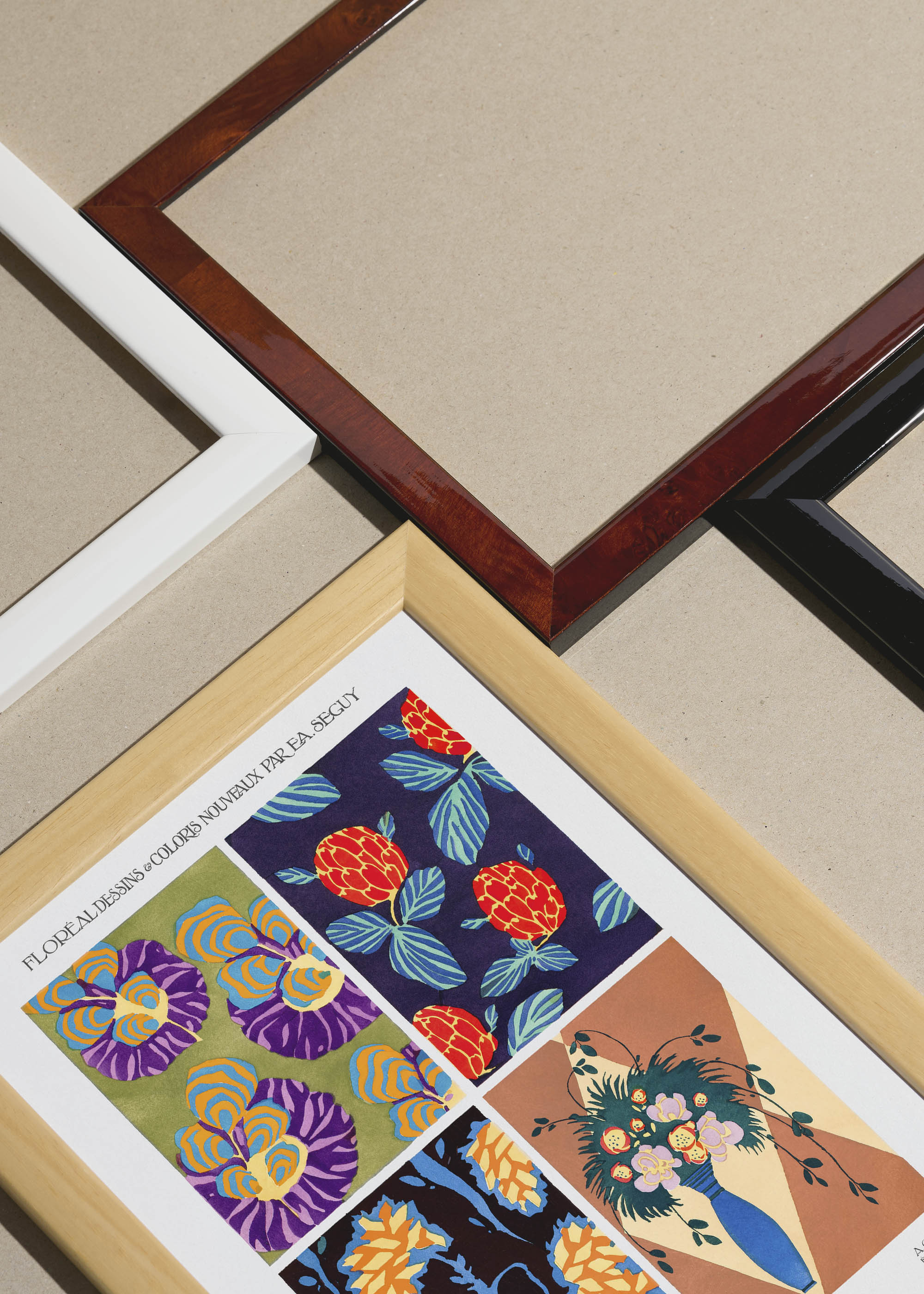 Stylizowane formy kwiatowe – od abstrakcyjnych stokrotek po egzotyczne owoce – reprezentują charakterystyczny dla Séguy sposób interpretacji natury przez pryzmat geometrycznej precyzji. Te botaniczne fantazje idealnie komponują się z wnętrzami w stylu mid-century modern czy współczesnym eklektyzmem.
