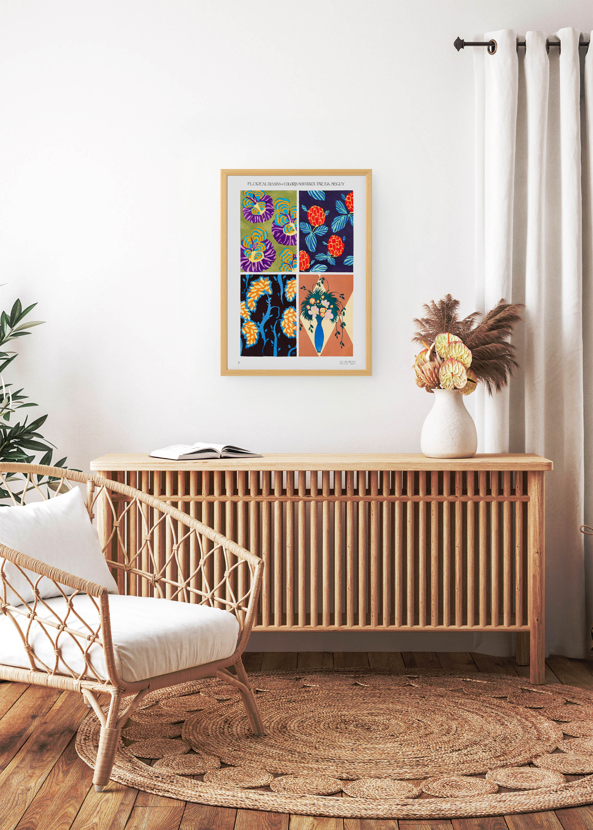 Ten wyjątkowy plakat będący reprintem wzoru autorstwa E.A. Séguy przenosi nas w fascynujący świat francuskiego art déco z początku XX wieku. Eugène Alain Séguy, wybitny entomolog i artysta dekoracyjny, tworzył swoje botaniczne kompozycje w okresie międzywojennym, kiedy Paryż był centrum artystycznego świata. Jego seria „Floréal Dessins & Coloris Nouveaux” powstała w latach 20. jako odpowiedź na rosnące zapotrzebowanie na nowoczesne wzornictwo tekstylne i dekoracyjne.