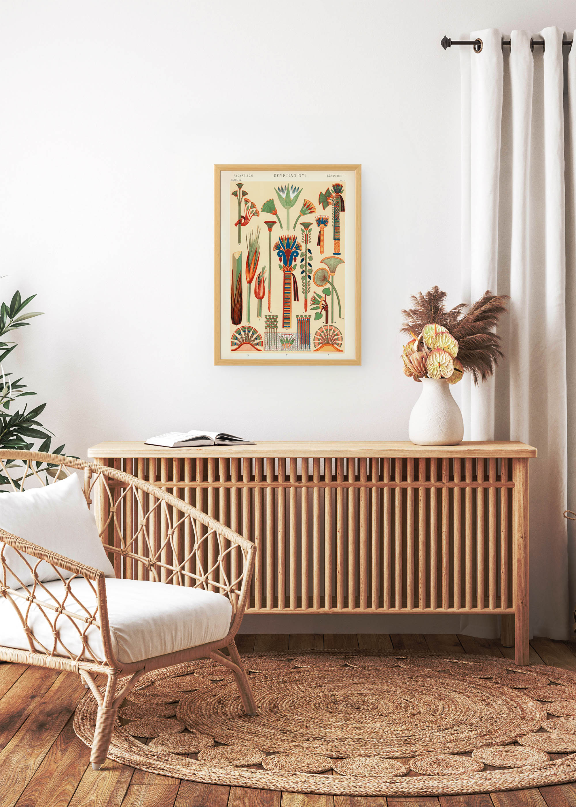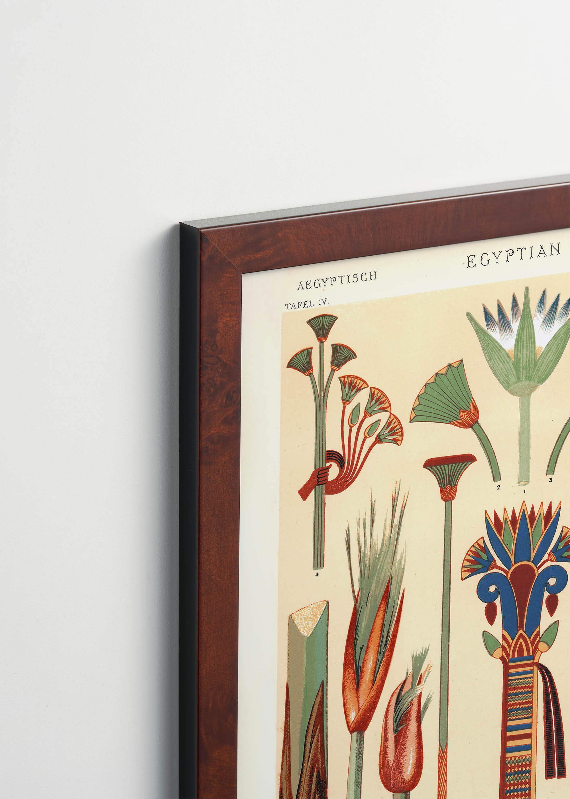 Plakat zachwyca harmonijną kompozycją stylizowanych motywów roślinnych – lotosu, papirusa i palm – które w kulturze egipskiej symbolizowały odrodzenie i wieczność. Dominująca paleta barw to ciepłe tony terakoty i ceglanej czerwieni, przełamane szmaragdową zielenią i turkusowymi akcentami. Złociste odcienie, zbliżone do ochry i sjennej palonej, nadają całości królewskiego charakteru, podczas gdy głębokie błękity przywodzą na myśl lazuryt – kamień cenniejszy od złota w starożytności.