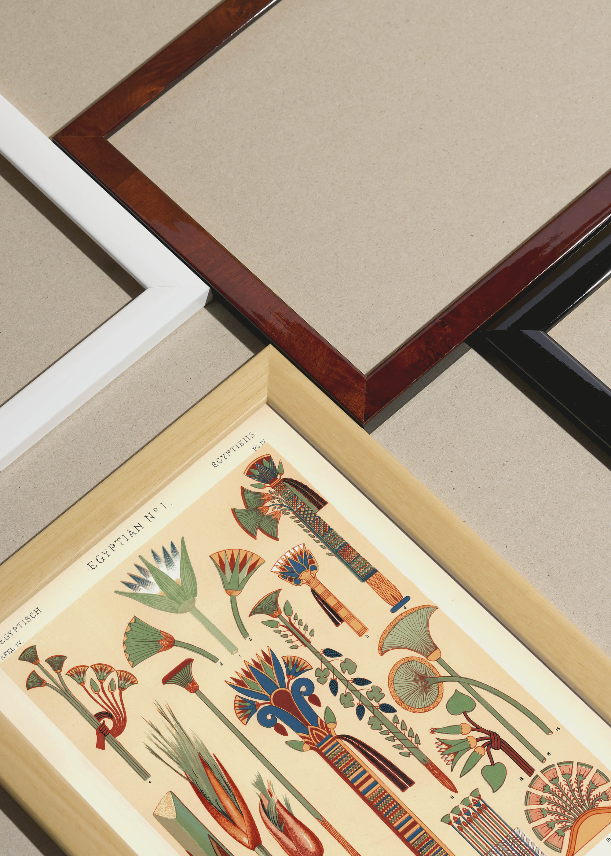 Ten niezwykły plakat przedstawia wzór z monumentalnego dzieła Owena Jonesa „Gramatyka Ornamentu” z 1856 roku – prawdziwej biblii zdobnictwa, która zrewolucjonizowała postrzeganie ornamentyki w epoce wiktoriańskiej. Jones, brytyjski architekt i teoretyk designu, spędził lata podróżując po świecie, dokumentując wzory dekoracyjne różnych kultur. Jego egipska tablica to efekt fascynacji starożytnym Egiptem, która ogarnęła Europę po kampanii Napoleona.