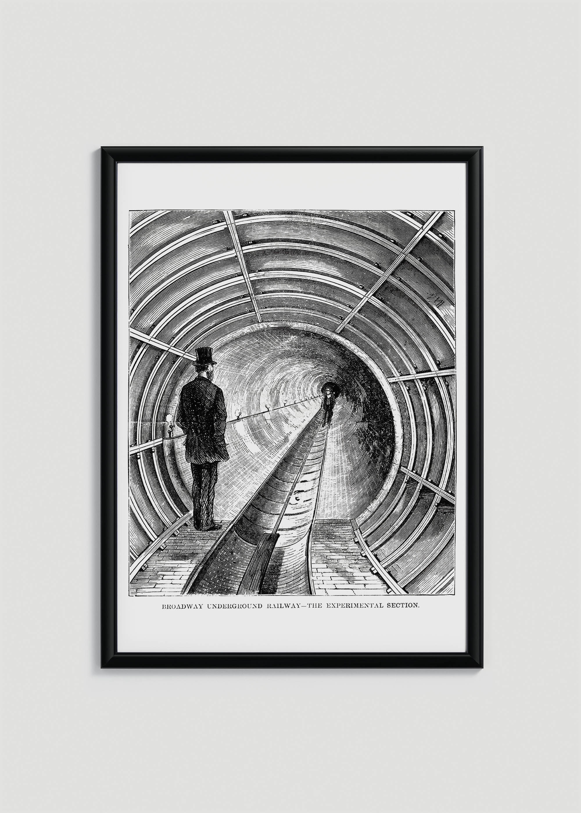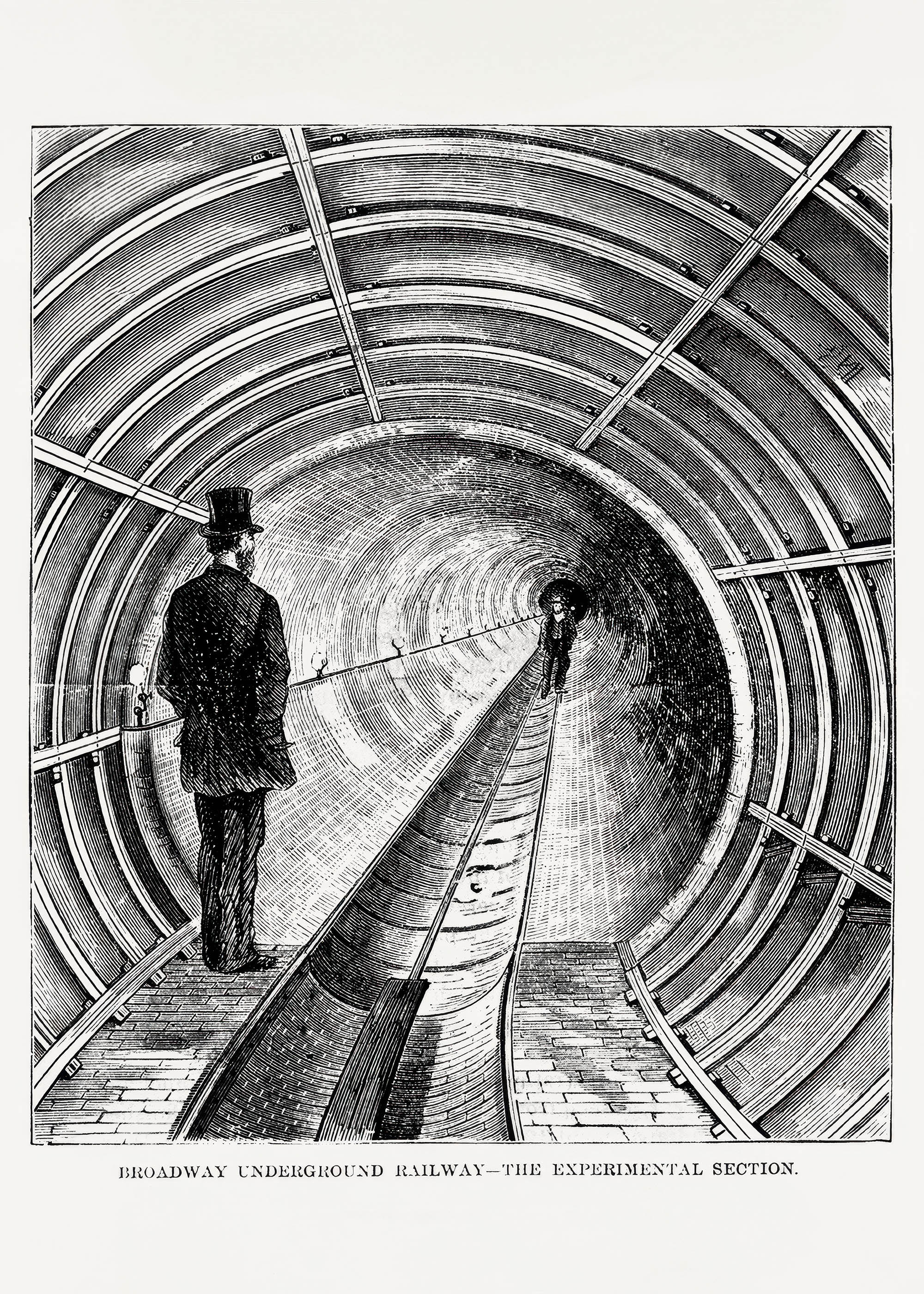 Plakat przedstawiający eksperymentalną sekcję Broadway Underground Railway z 1872 roku to fascynujący przykład XIX-wiecznej grafiki technicznej, która łączy w sobie kunszt artystyczny z dokumentacją inżynieryjną. Ten niezwykły reprint ukazuje wizjonerski projekt nowojorskiej firmy New York Parcel Dispatch Company – jedną z pierwszych prób stworzenia podziemnej kolei pneumatycznej na Manhattanie, która miała zrewolucjonizować transport miejski jeszcze przed powstaniem słynnego metra.