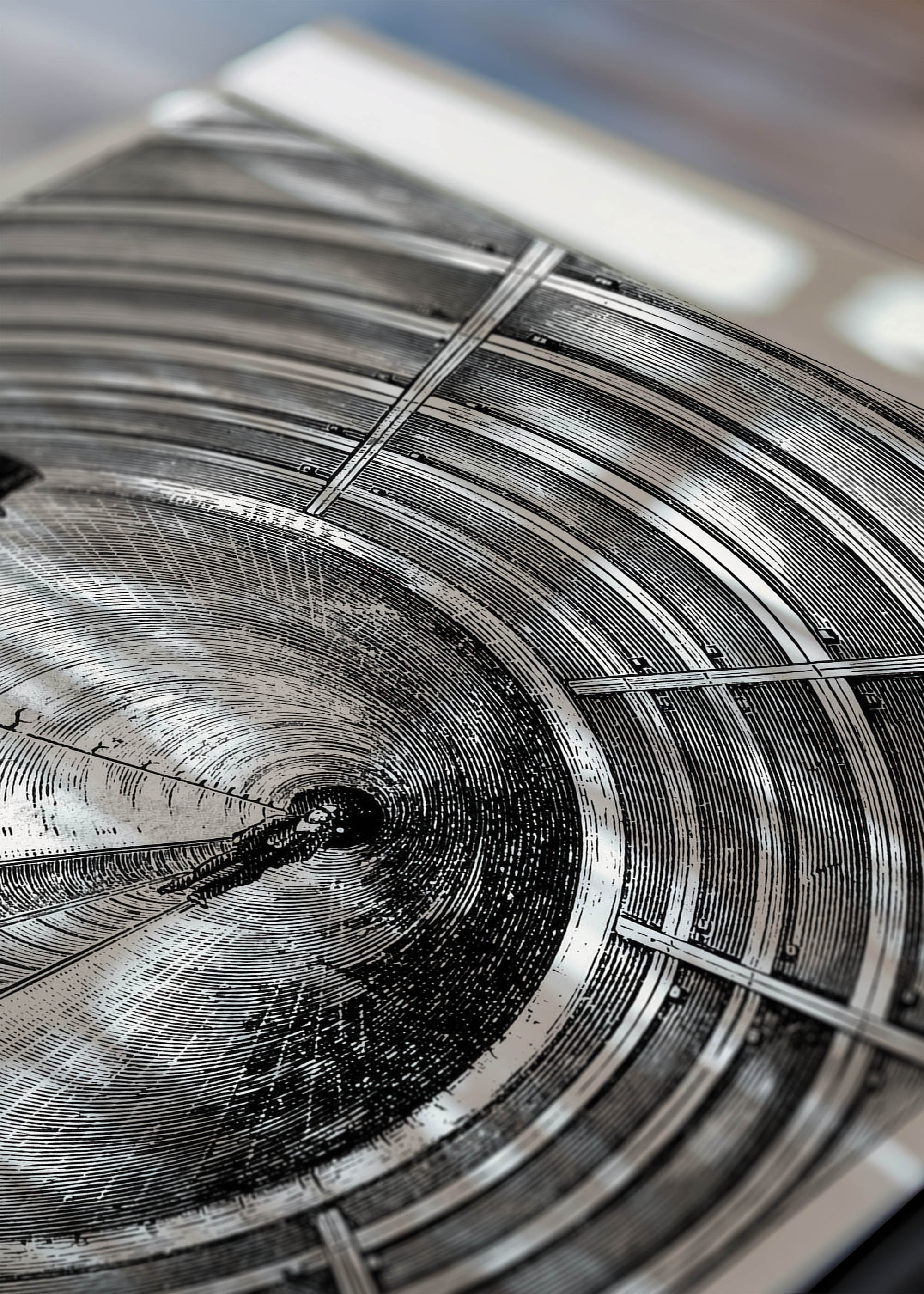 Kompozycja hipnotyzuje precyzyjnym rysunkiem wykonanym techniką sztychowania, gdzie gęsta siatka równoległych kresek tworzy iluzję głębi tunelu. Dominują tu grafitowe tony przechodzące w głęboką czerń, z subtelnymi akcentami bieli tworzącymi efekt świetlny. Barwy są zbliżone do antracytu i kości słoniowej, co nadaje całości charakteru dawnych rycin prasowych.