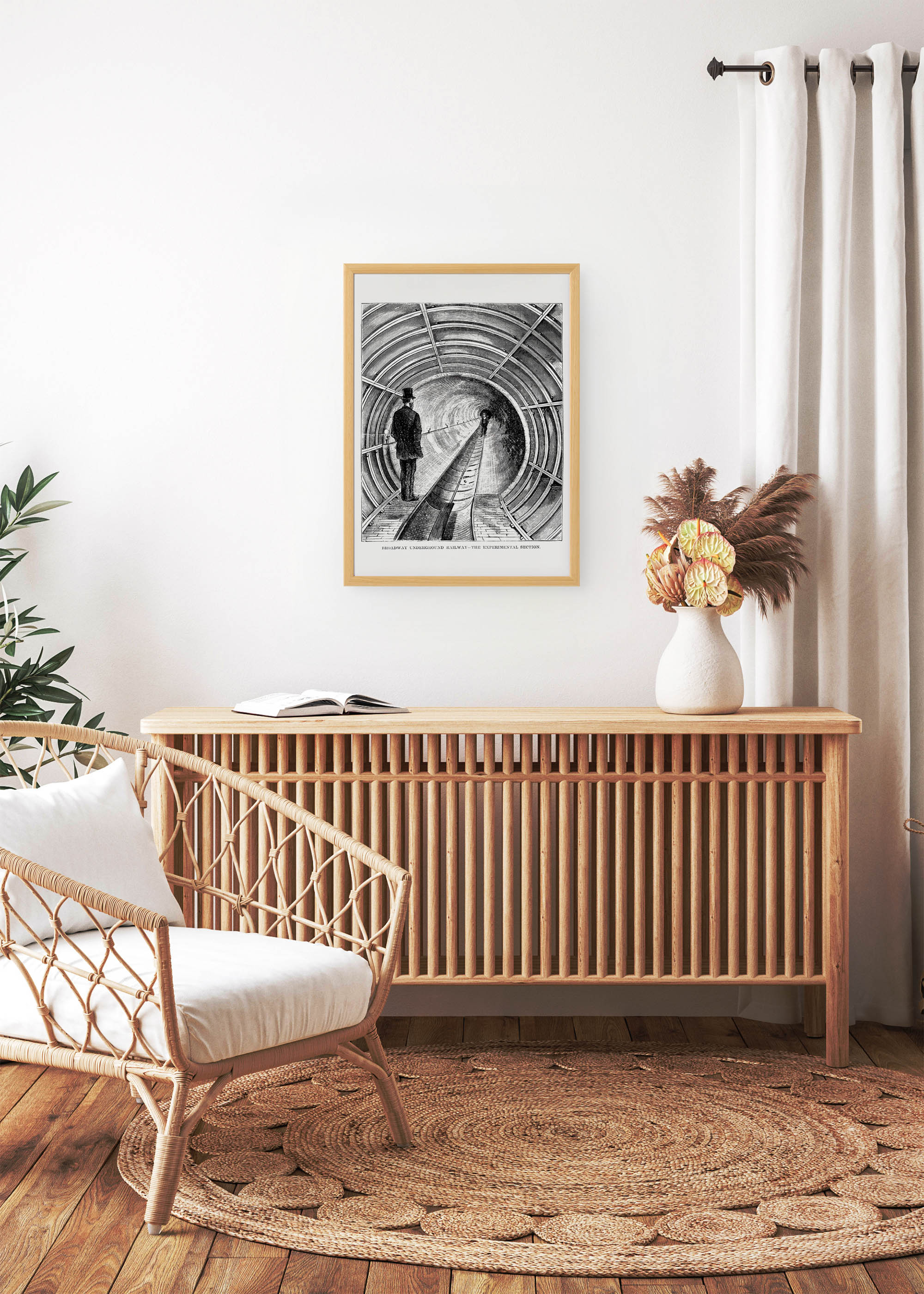 Sylwetki dwóch dżentelmenów w cylindrach, stojących na torowisku, podkreślają monumentalną skalę konstrukcji. Ten plakat z kolekcji Plakatello idealnie wpasuje się w industrialne wnętrza, gabinety w stylu steampunk czy przestrzenie urządzone w duchu vintage. Szczególnie efektownie prezentuje się w towarzystwie miedzianych dodatków i skórzanych mebli.