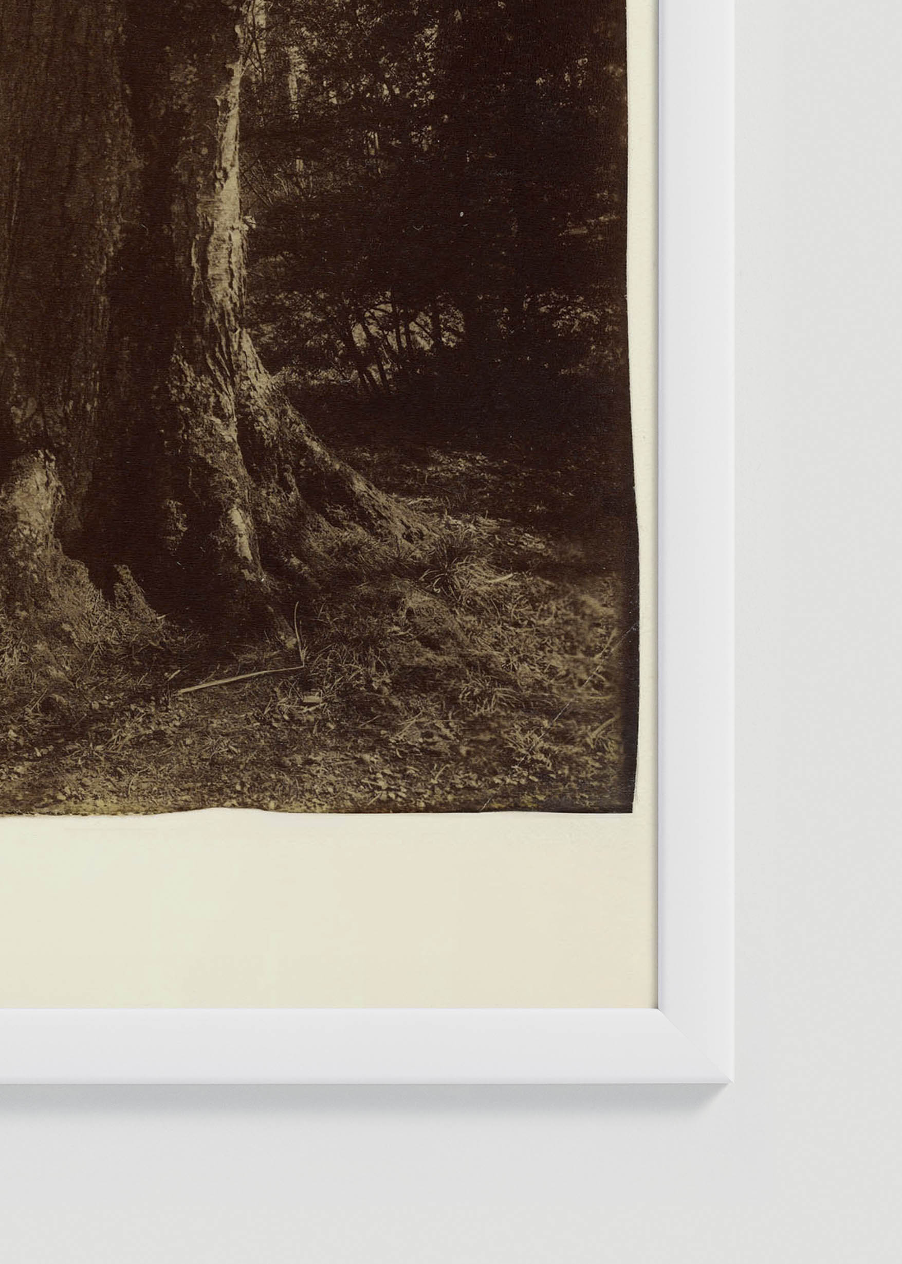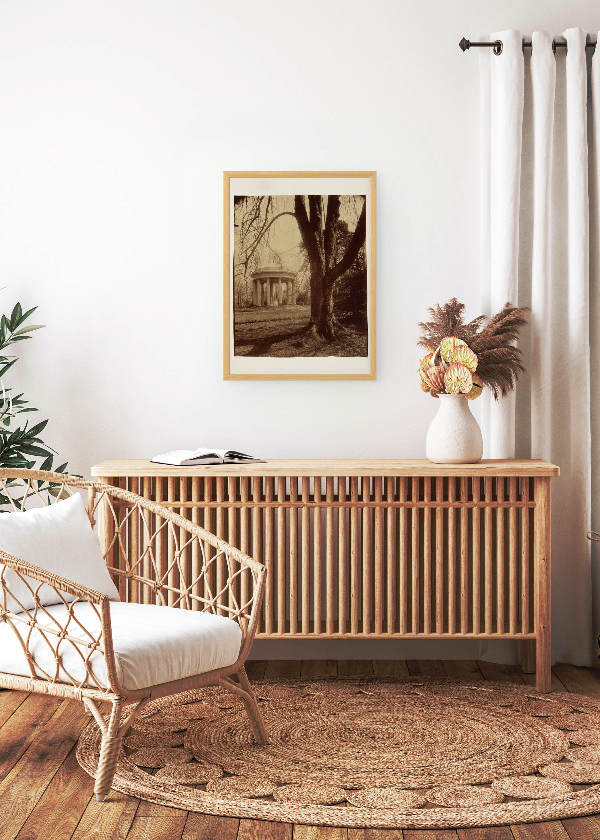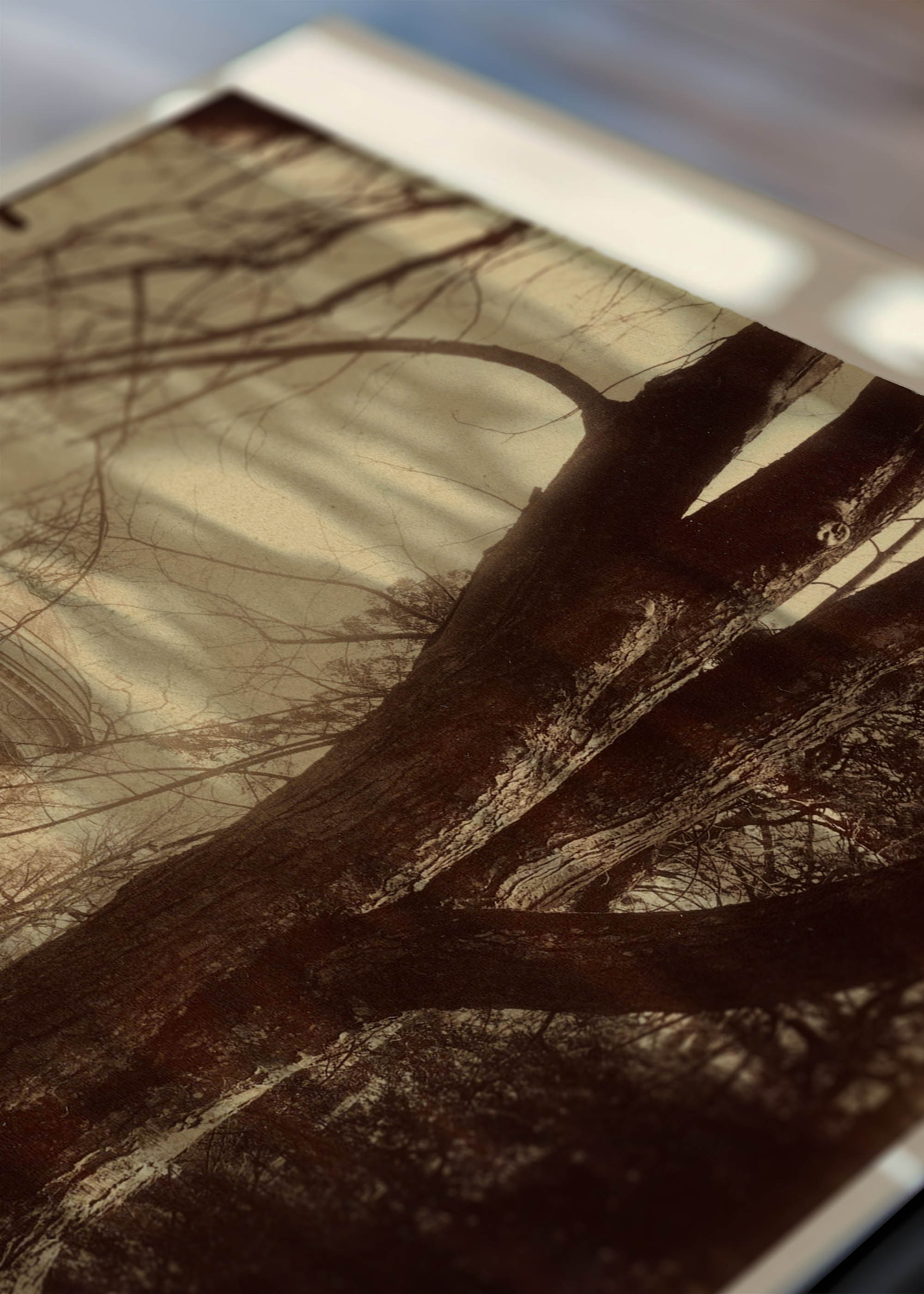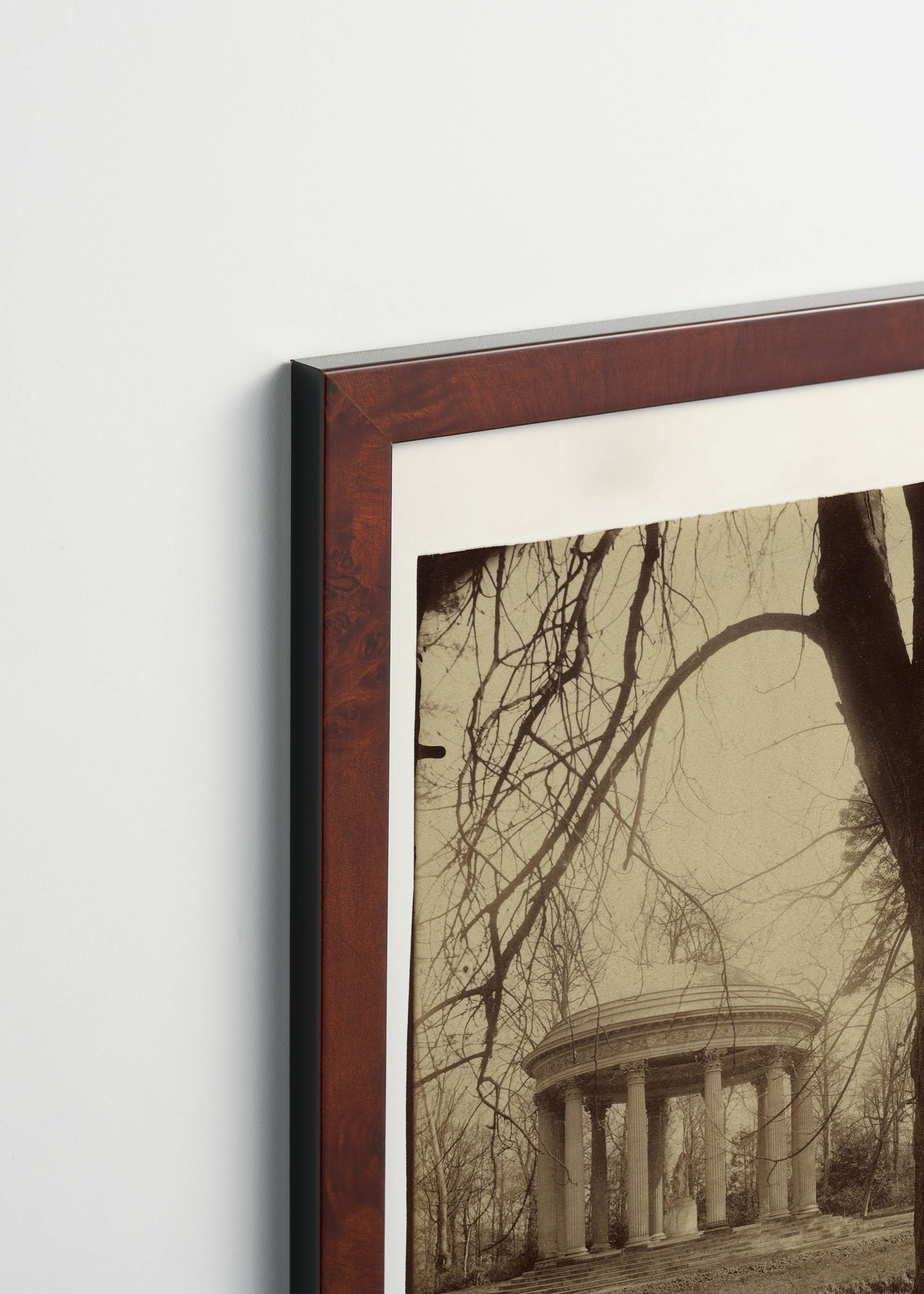 Na tej sepiowej reprodukcji widzimy klasyczną świątynię o kolumnowej konstrukcji, ukrytą za monumentalnymi konarami drzew. Dominująca kolorystyka to ciepłe odcienie umbry palonej, przechodzące w delikatne beże i kremowe tony – charakterystyczne dla albuminowych odbitek tamtej epoki. Ta stonowana paleta barw ziemi sprawia, że wzór idealnie komponuje się z wnętrzami w stylu klasycznym, industrialnym czy skandynawskim.